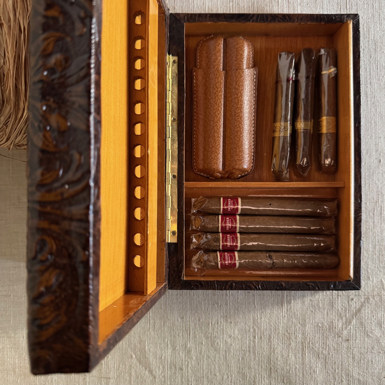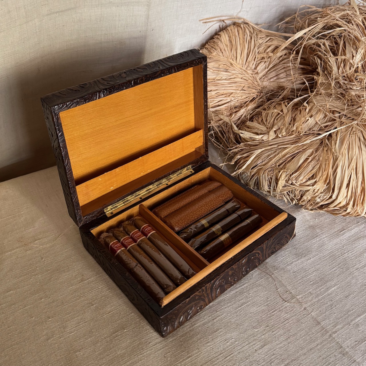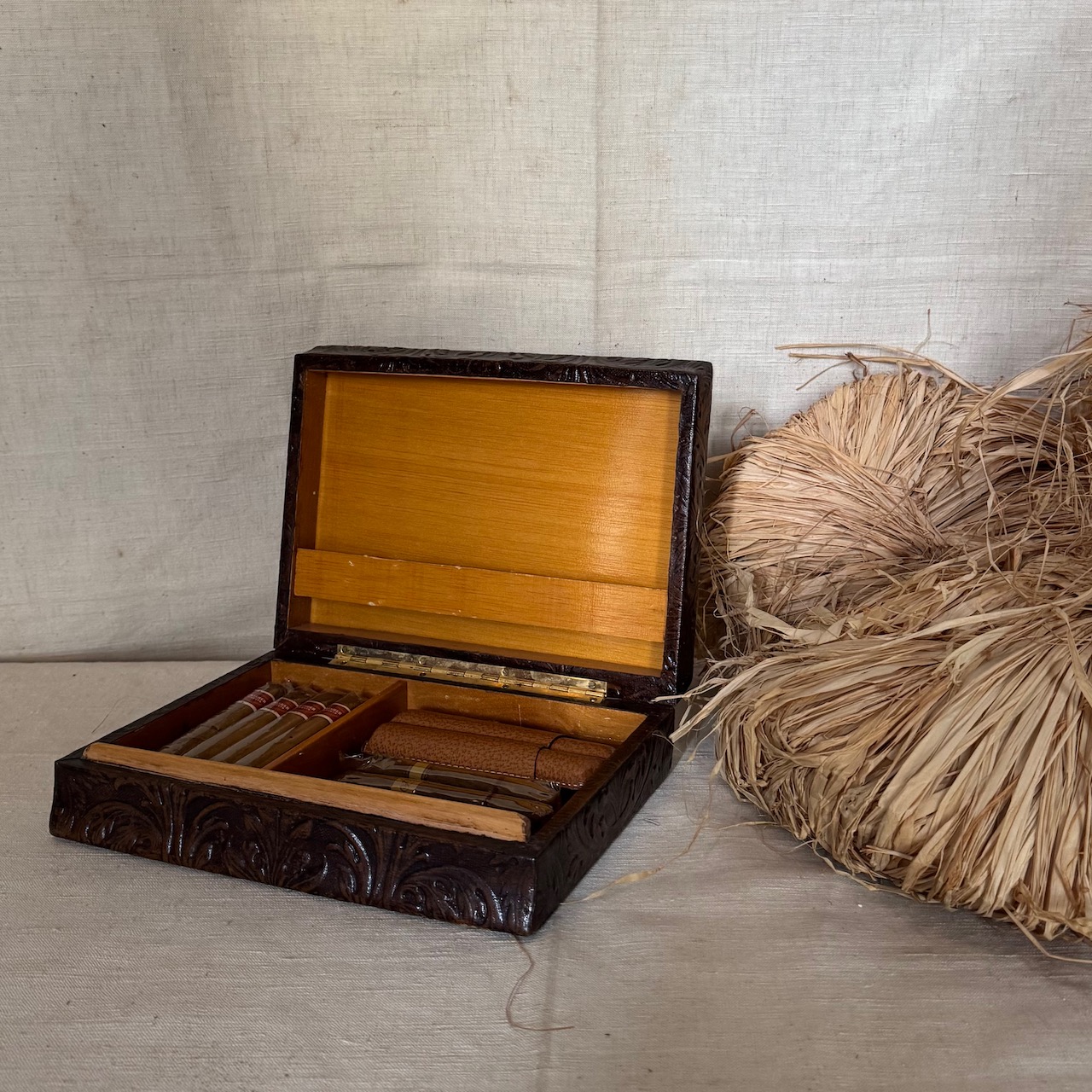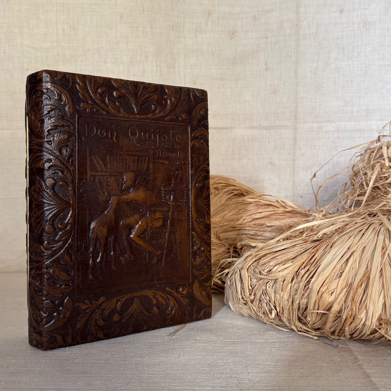 Libro Cofanetto porta sigari in pelle con immagine di Don Chisciotte sulla copertina anteriore e decorazione a tralci di foglia d acanto in rilievo su costola e retro. Spagna, 1930 ca