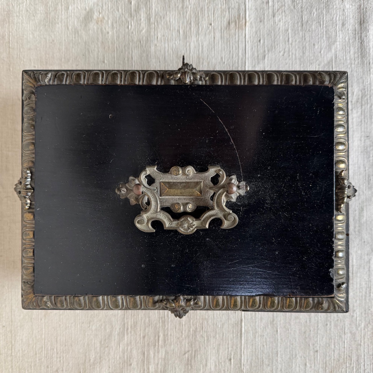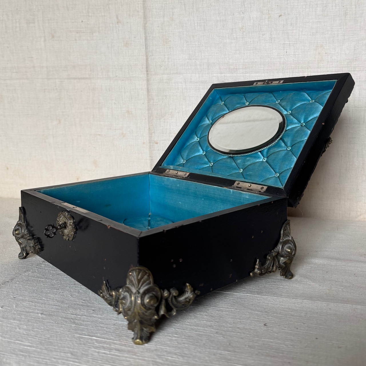 Scatola portagioie Vittoriana, legno laccato nero, finiture e piedini in bronzo, interno matellassé turchese. Inghilterra, sec. XIX