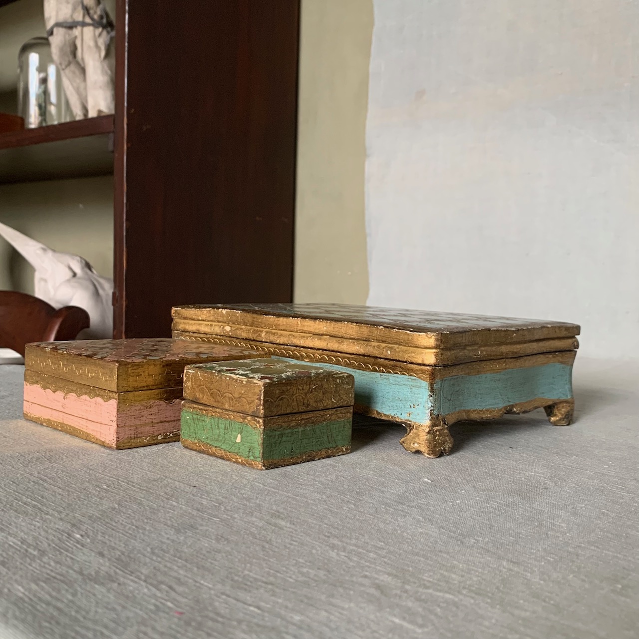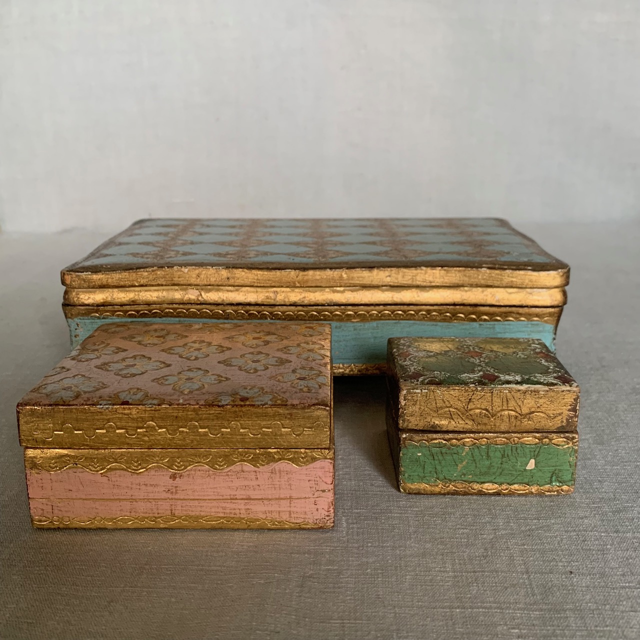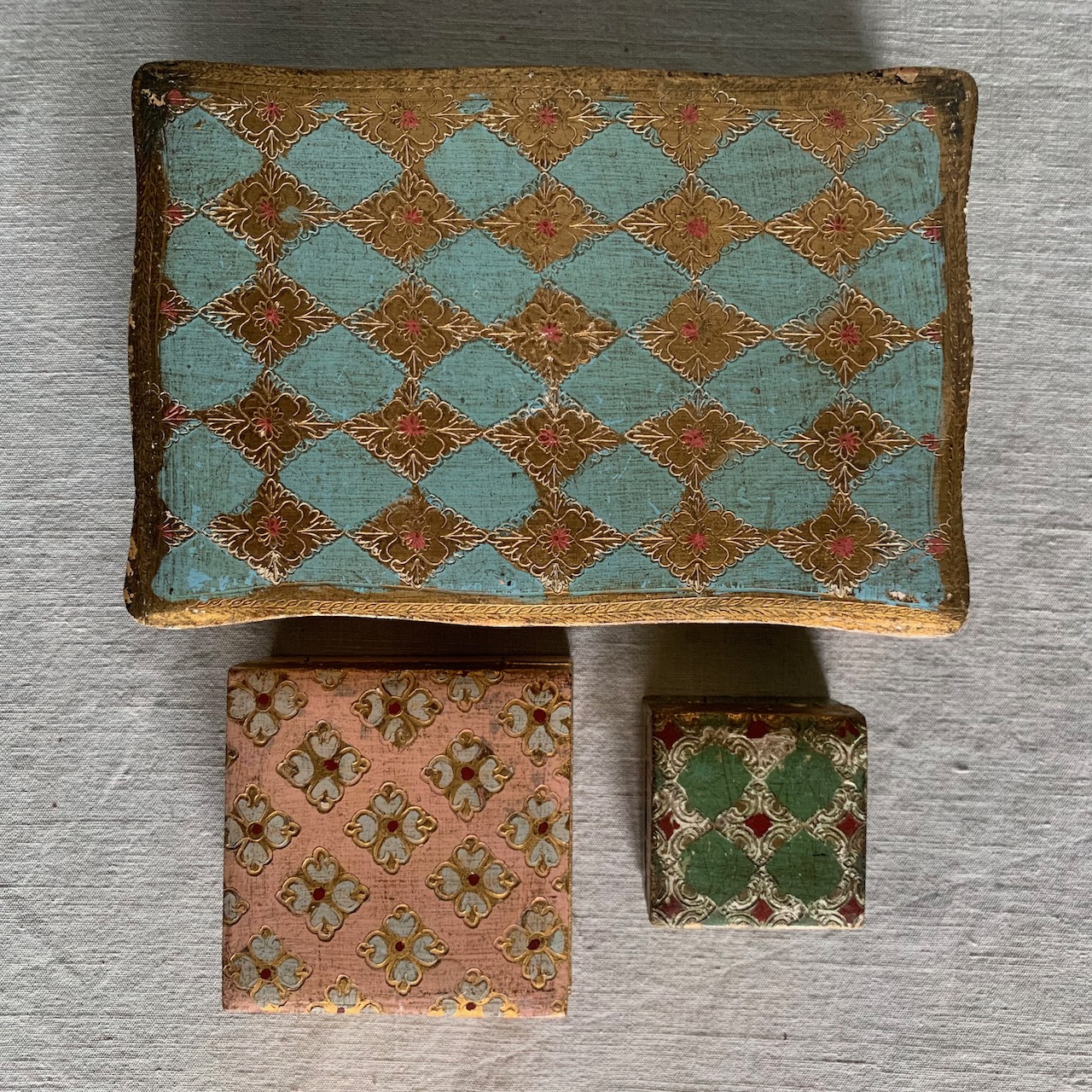 Tre piccole scatole veneziane dipinte rosa e verde su fondo oro. Italia, inizio sec. XX