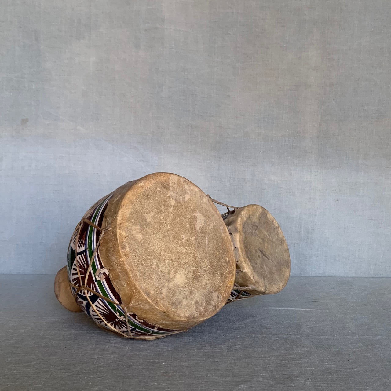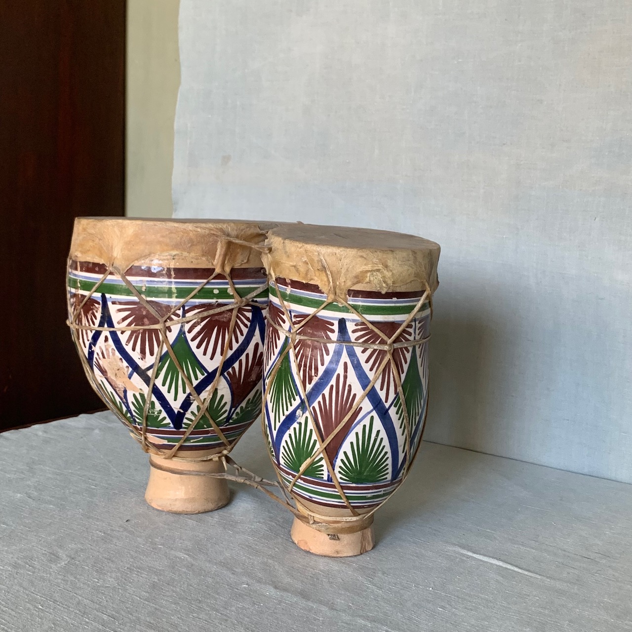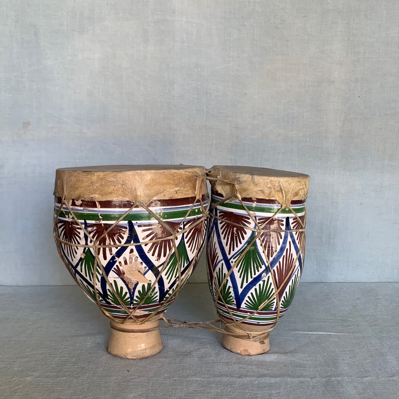 Bongo Marocchino fatto a mano, in ceramica policroma e pelle naturale. Marocco, sec. XX