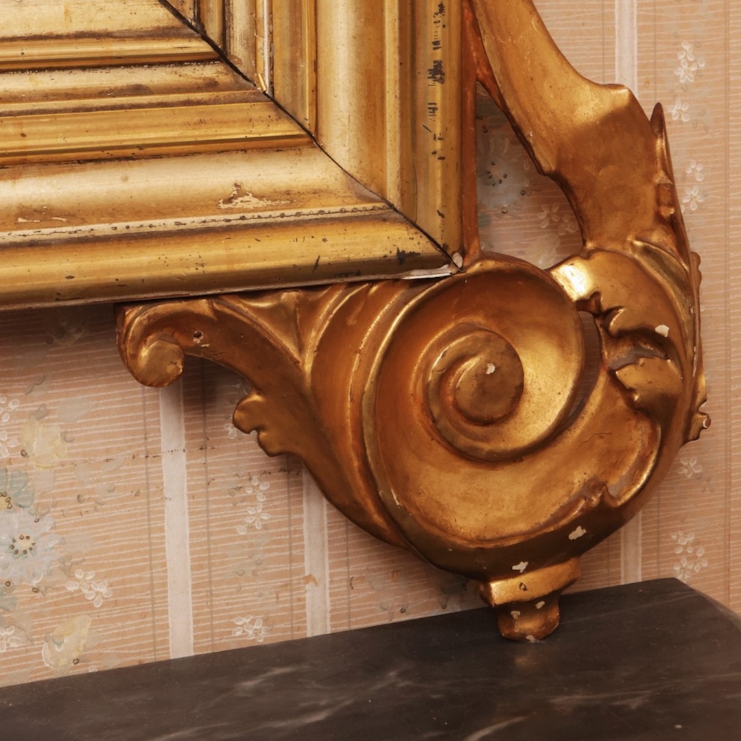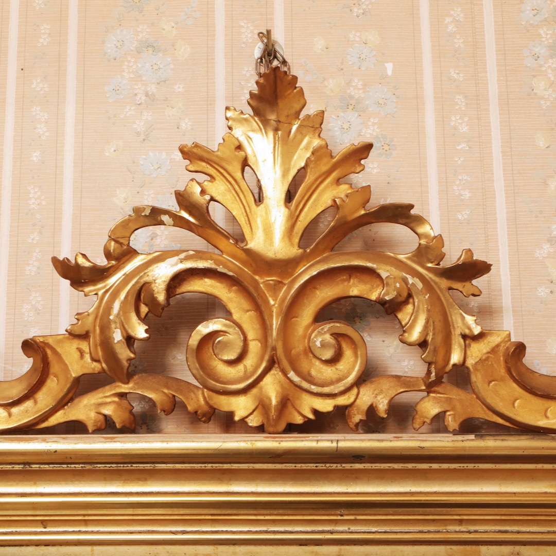 Grande specchiera camminerà in legno intagliato dorato a riccioli e volute. Italia, sec. XIX