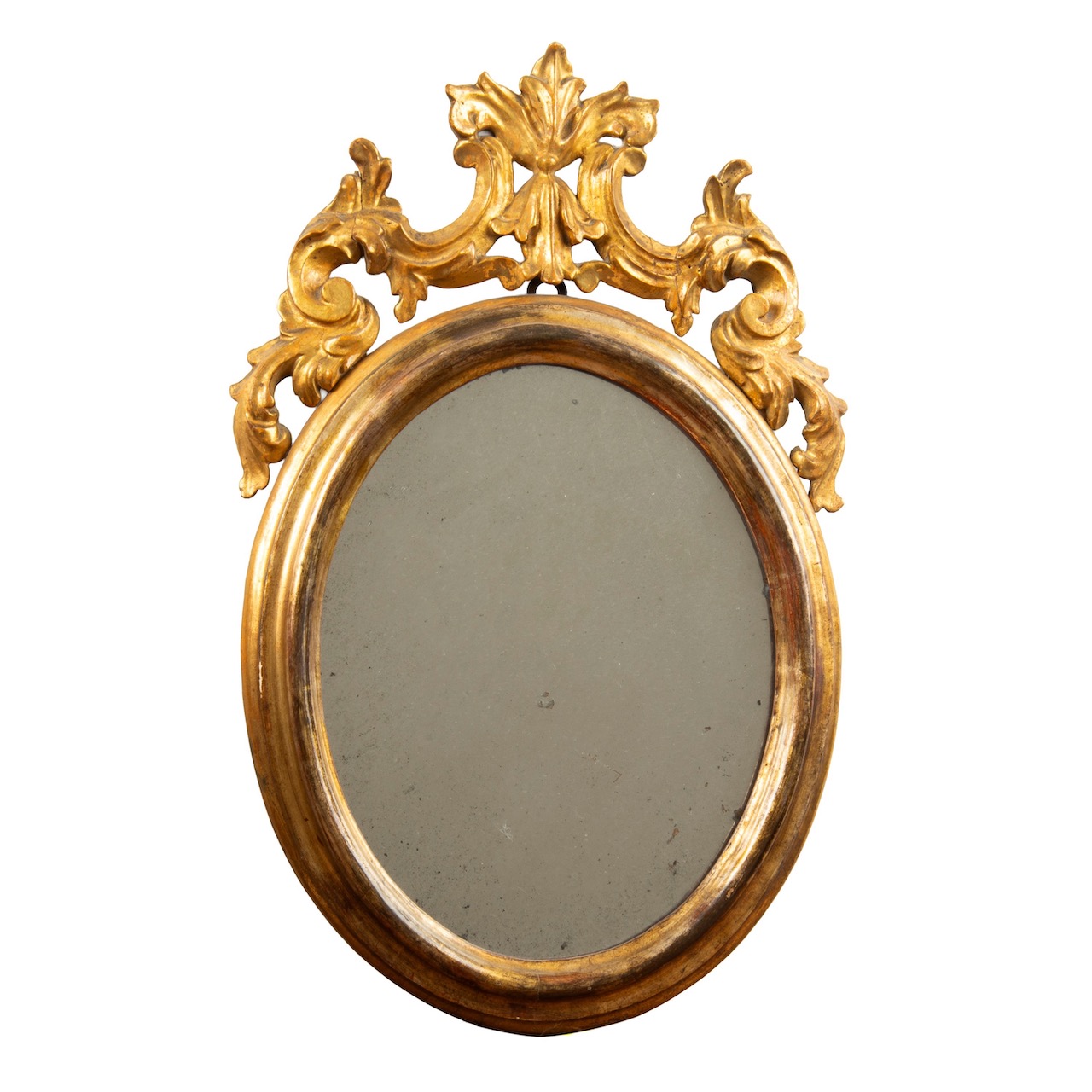 Specchiera ovale in legno dorato, con cimasa intagliata. Italia, sec. XIX