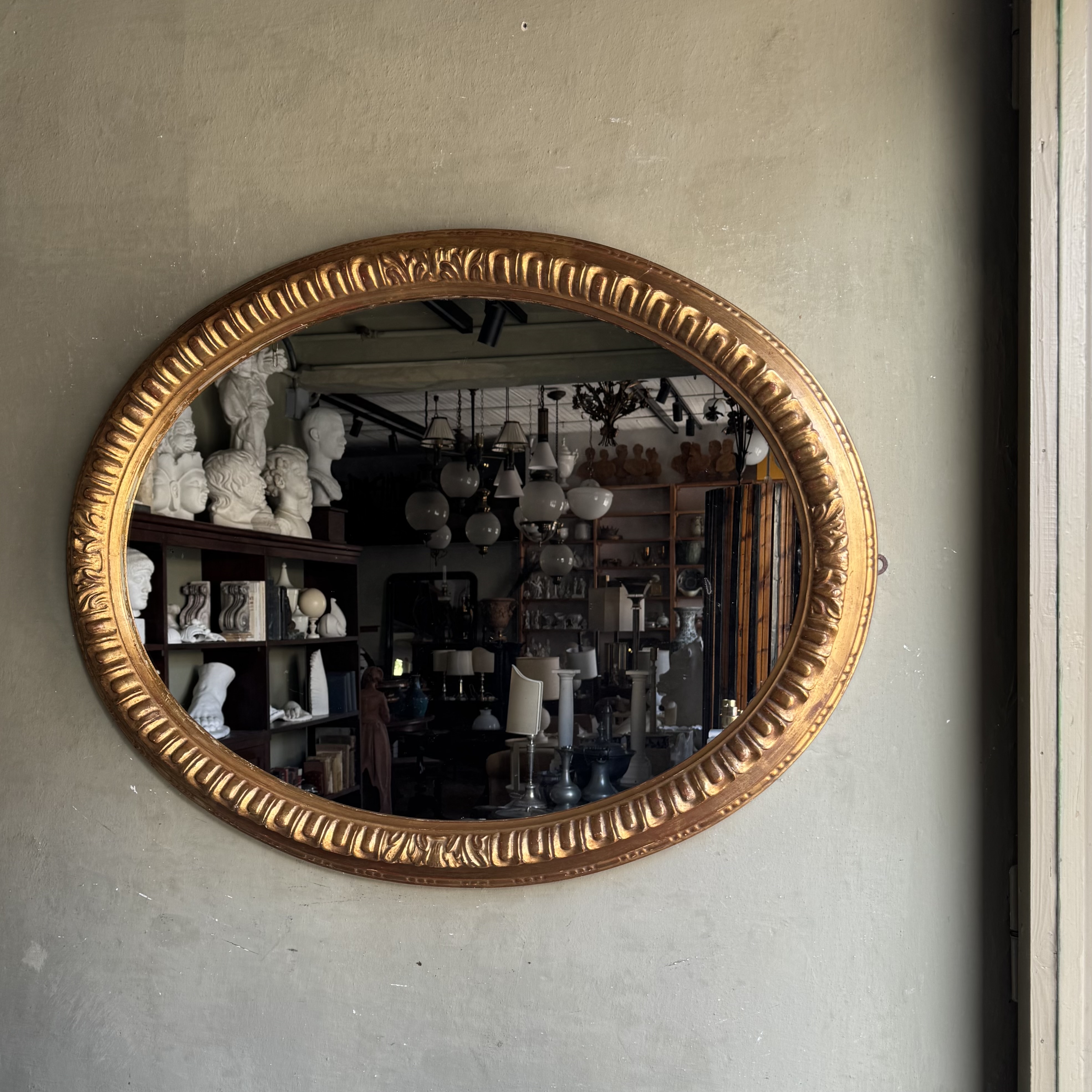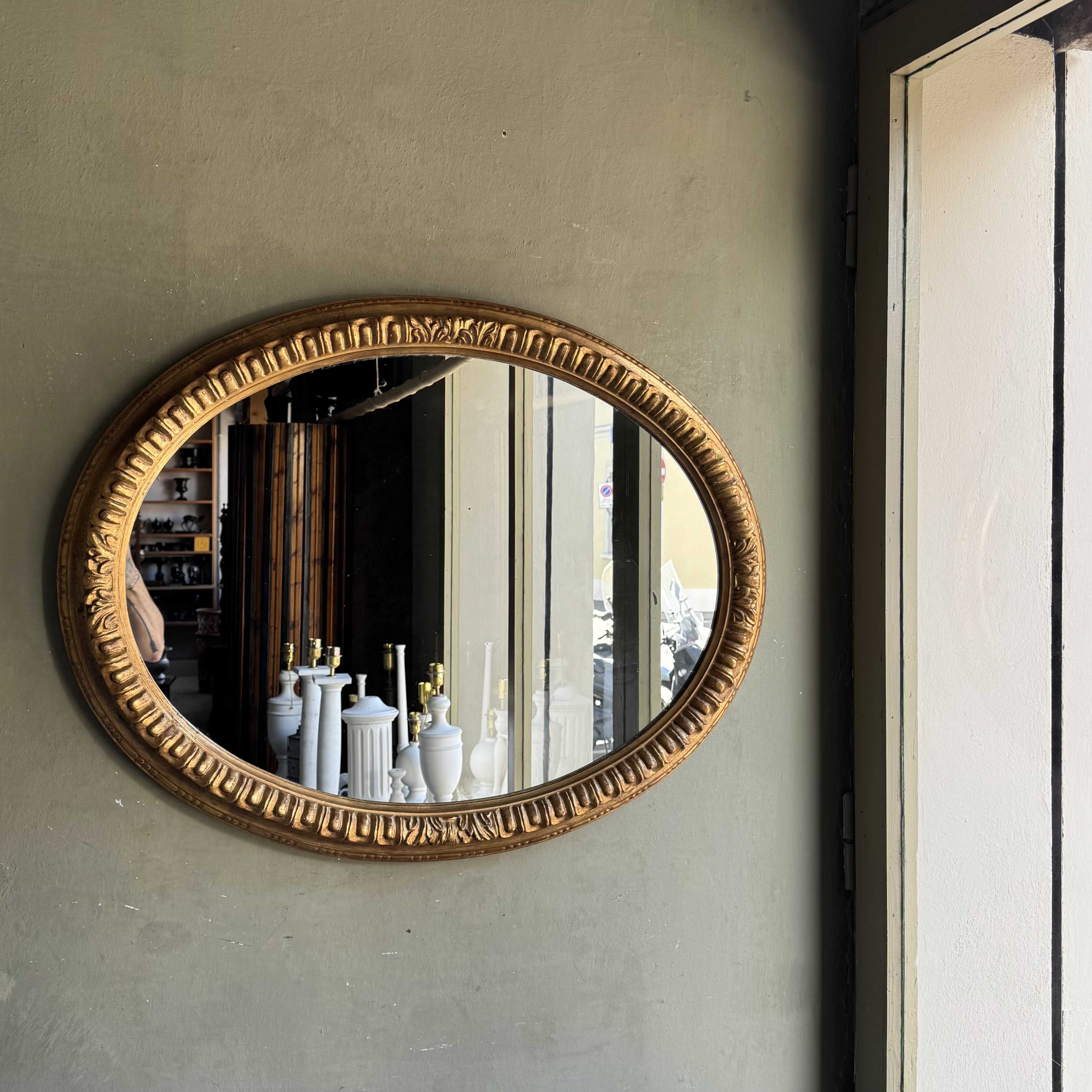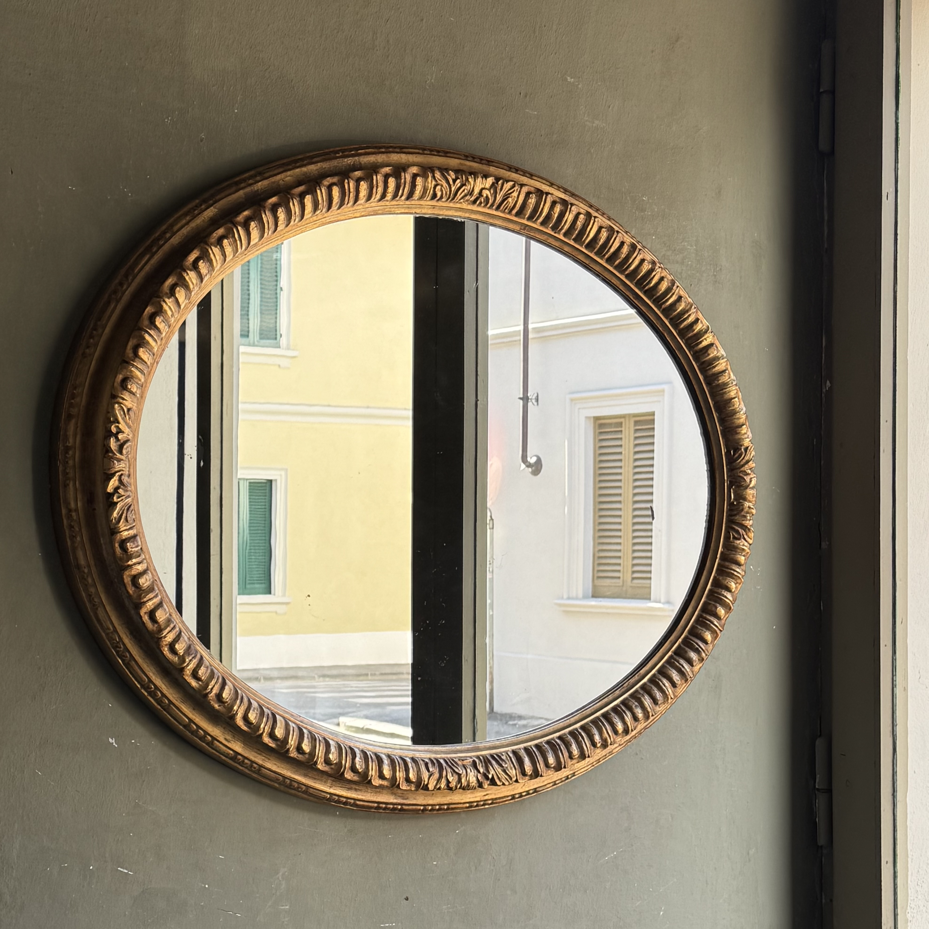Grande Specchiera ovale in cornice legno scolpito e dorato. Italia, inizio sec. XX