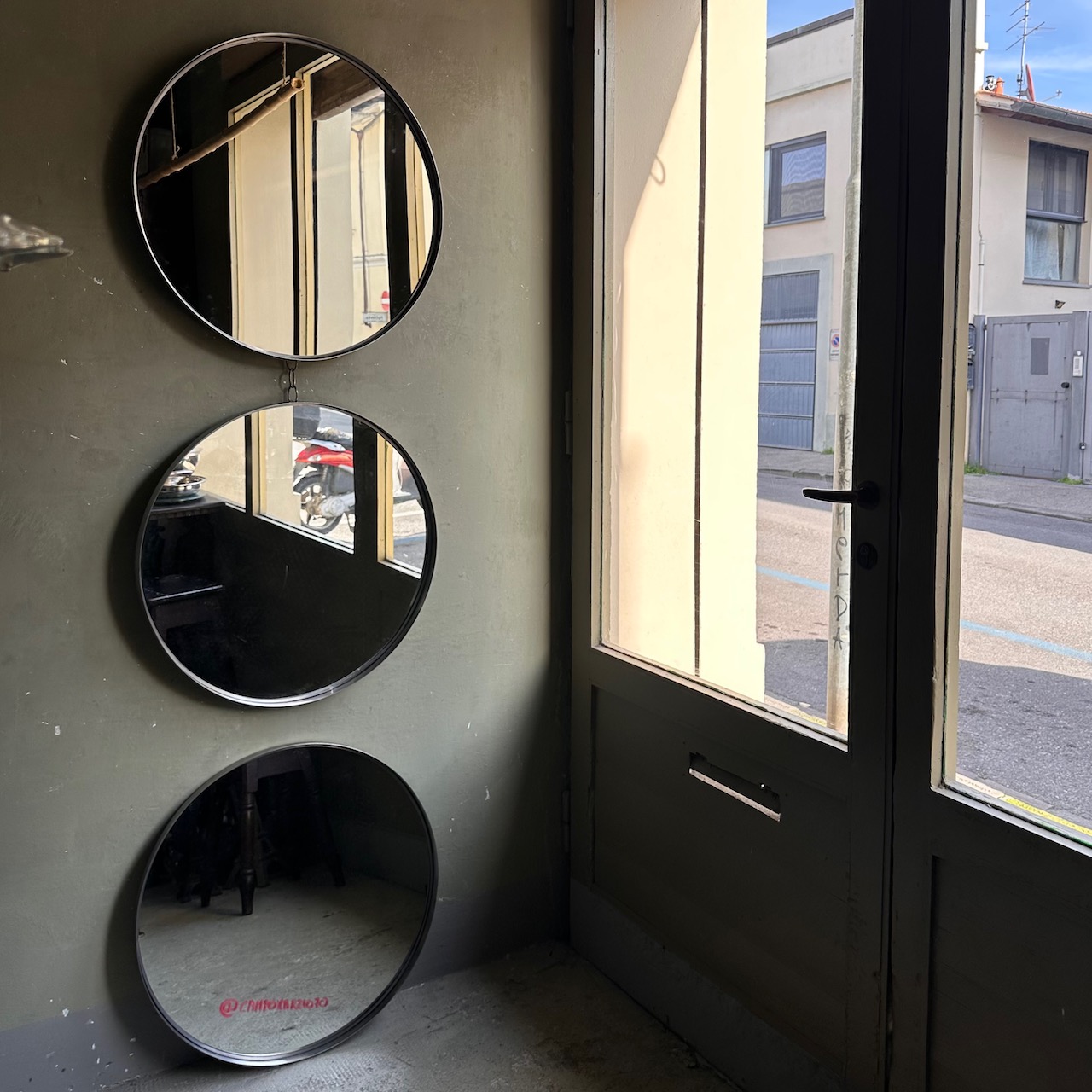 Tre specchi rotondi in cornice in bronzo cromo satinato. Italia, 1970 circa