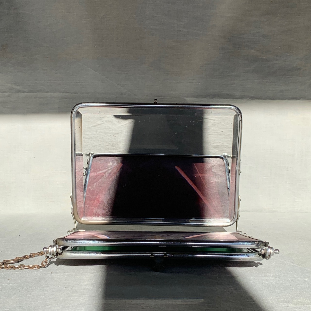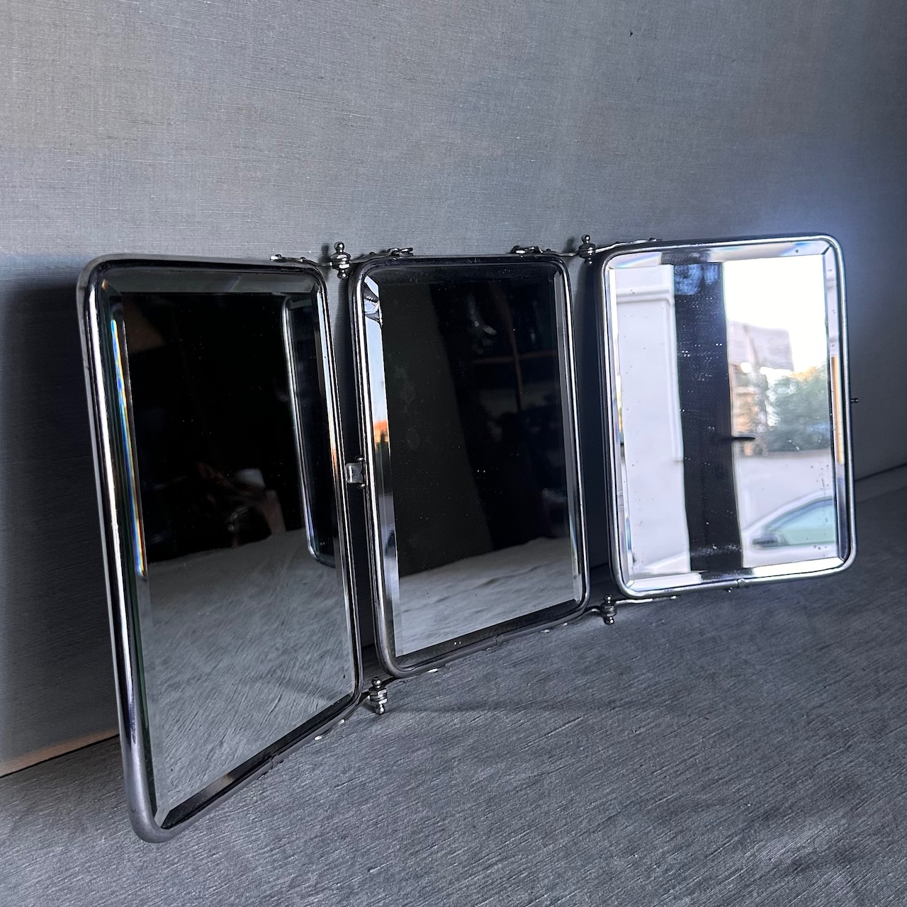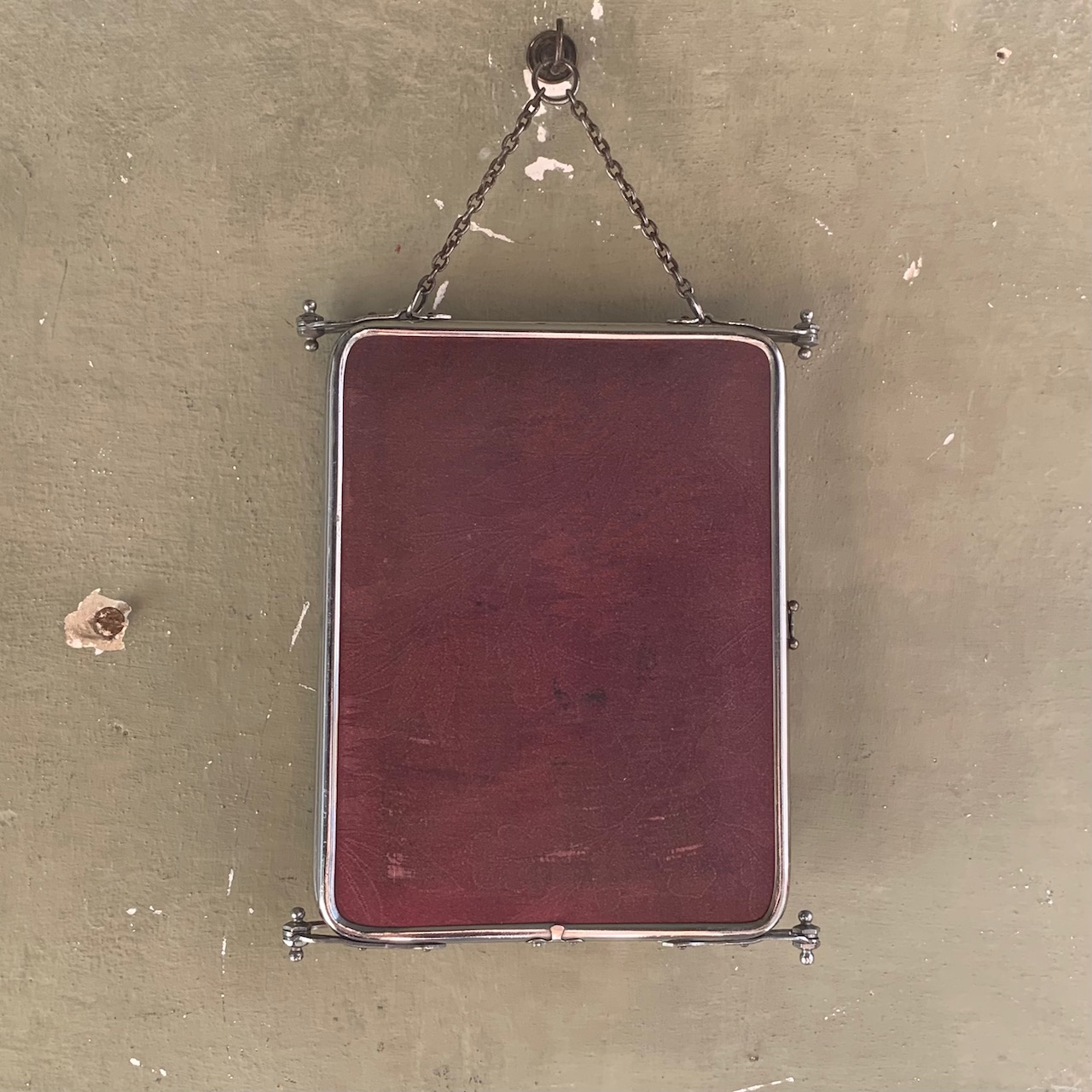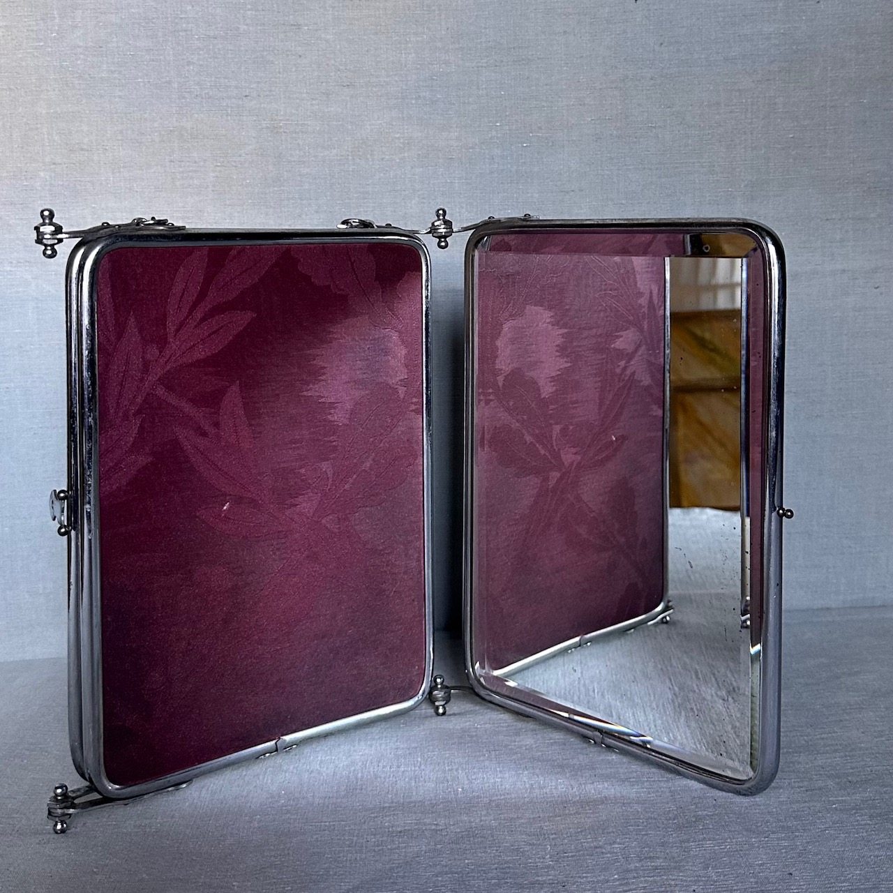 Piccolo specchio toilette da viaggio, tripartito, retro in papier maché bordeaux. Francia, 1930 ca