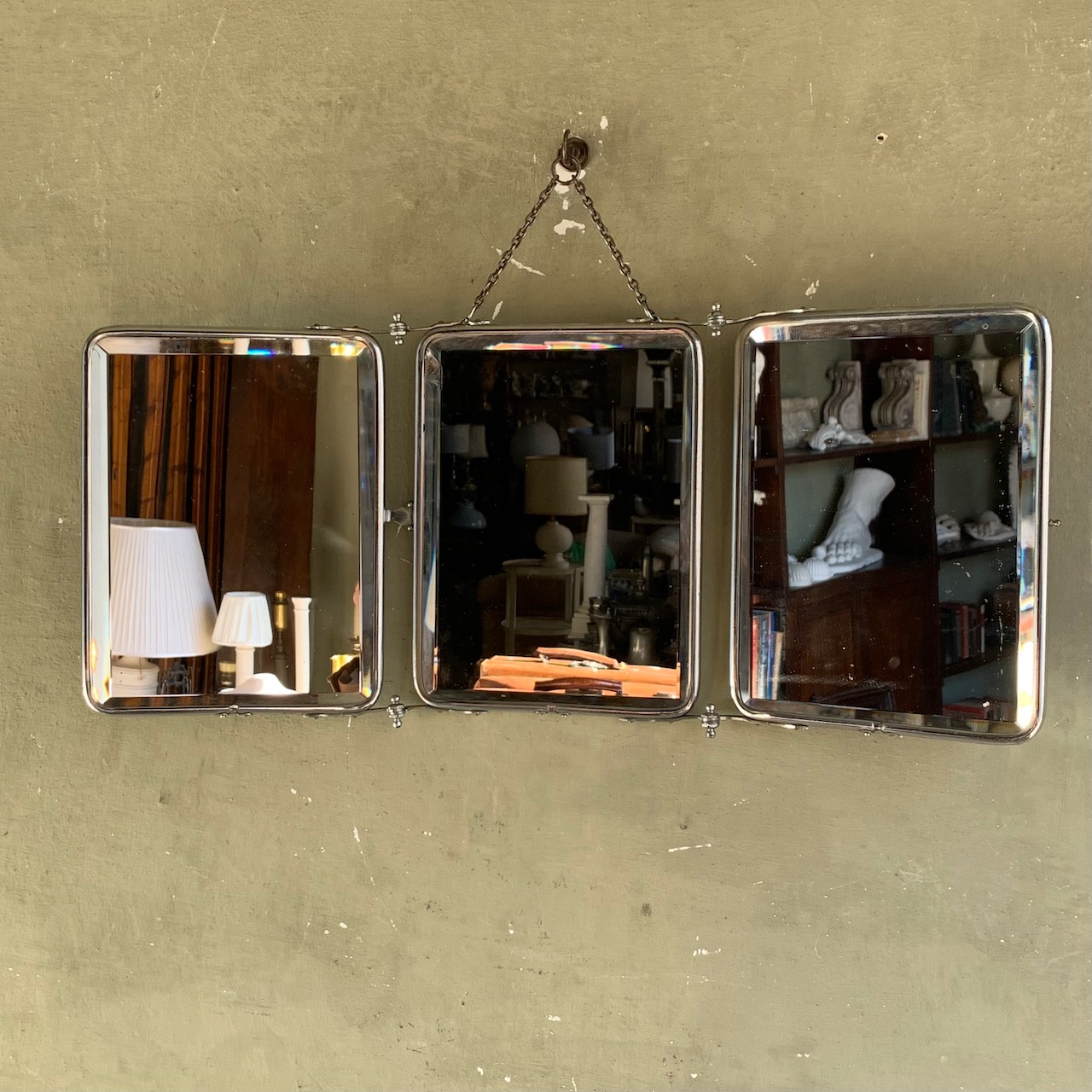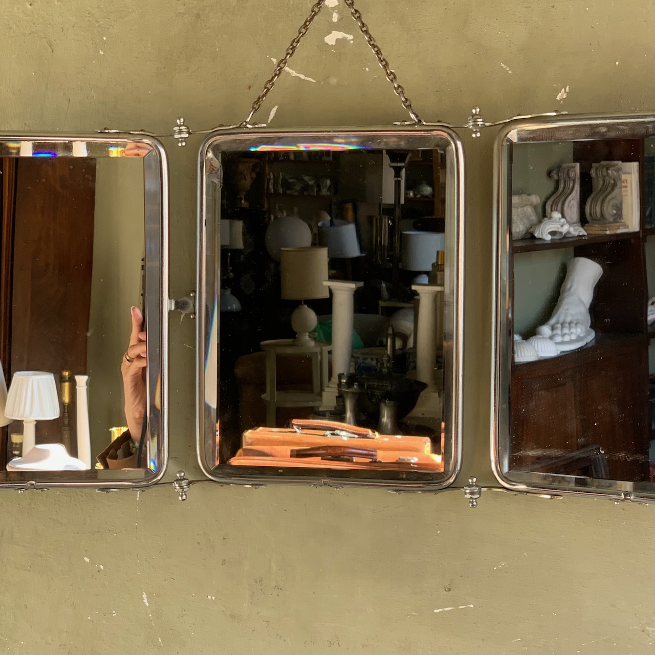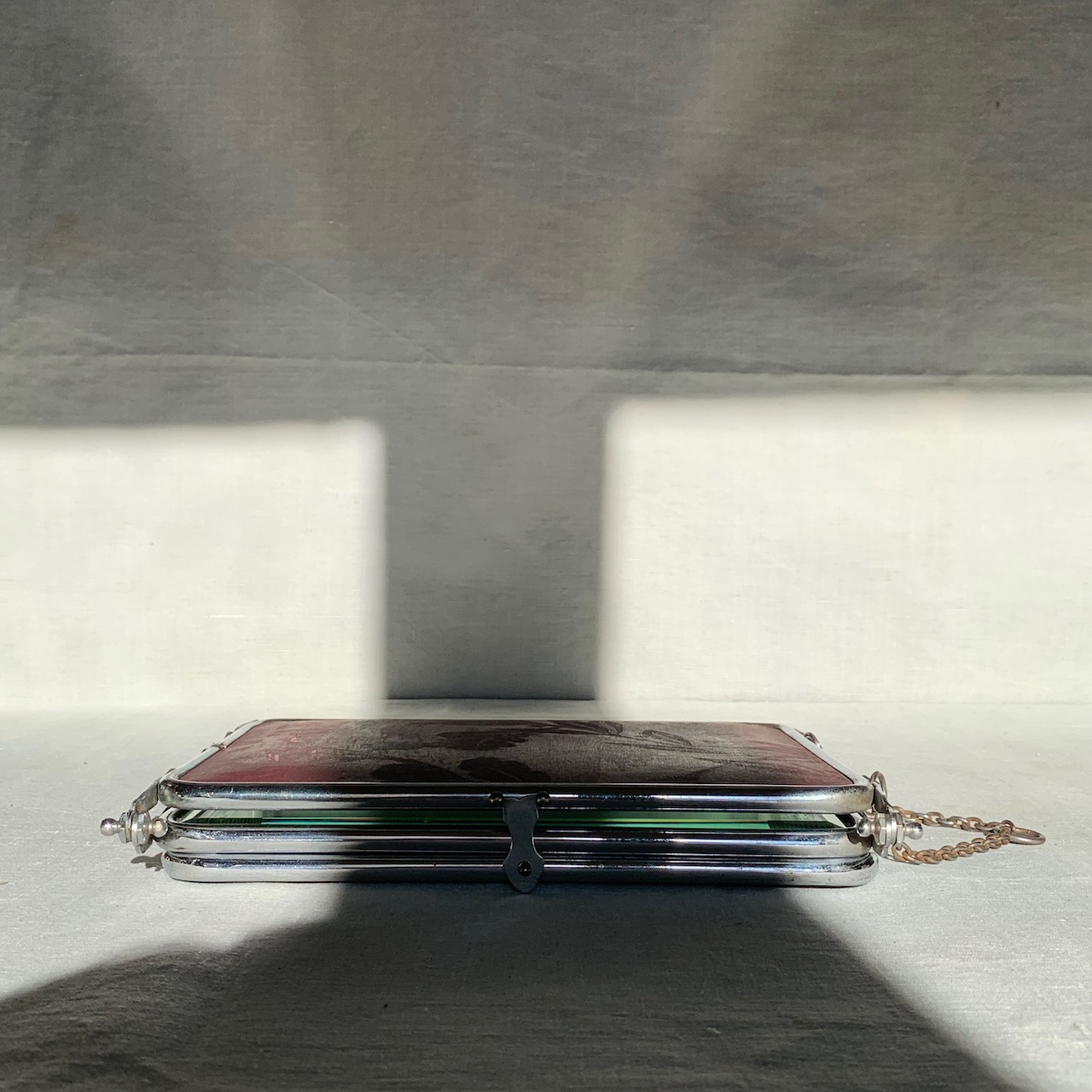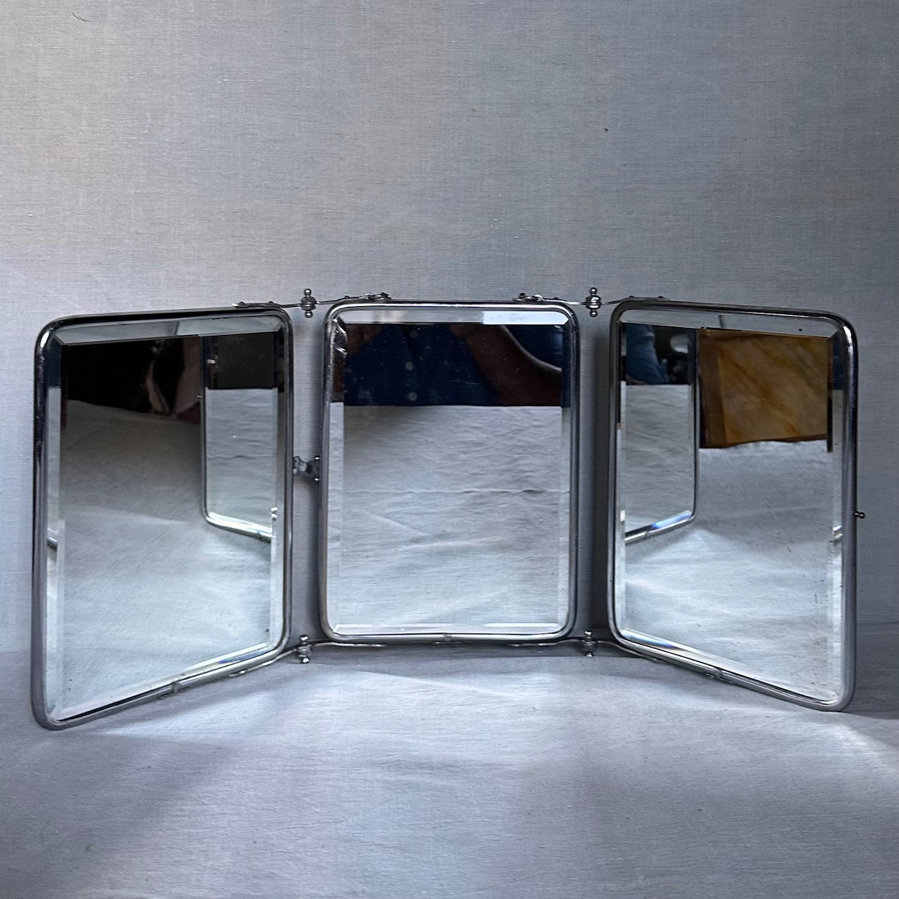 Piccolo specchio toilette da viaggio, tripartito, retro in papier maché bordeaux. Francia, 1930 ca