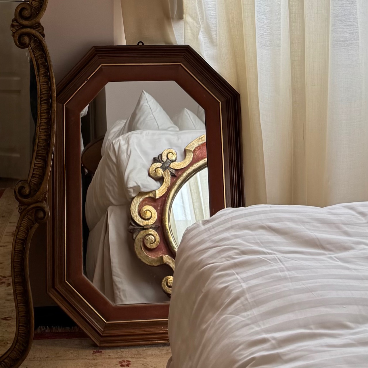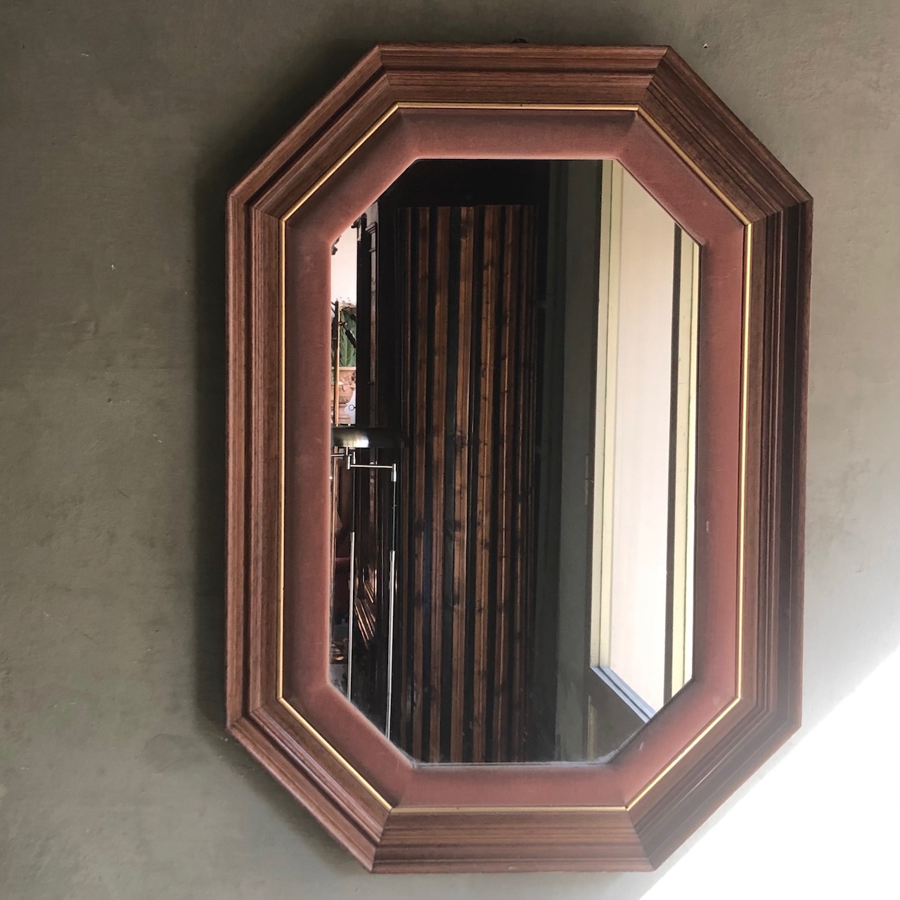 Specchio ottagonale, doppia cornice legno e velluto orsa antico. Italia, sec. XX