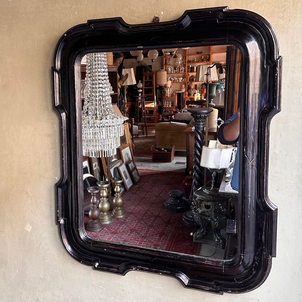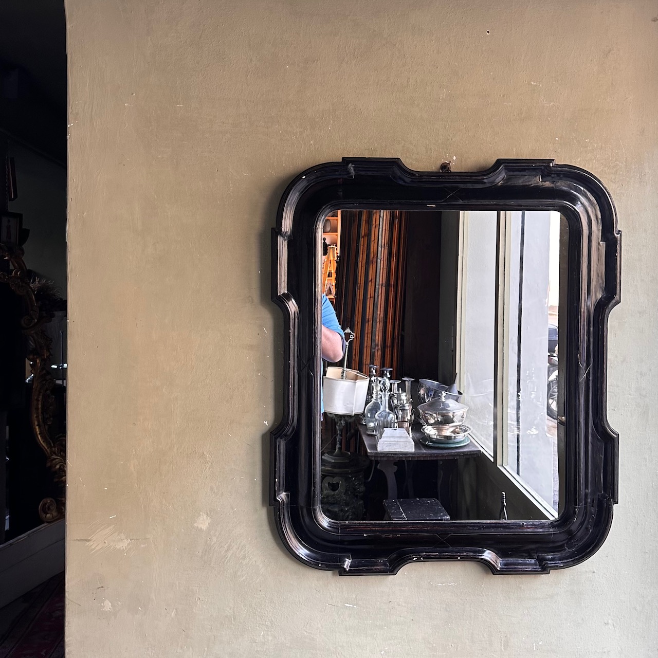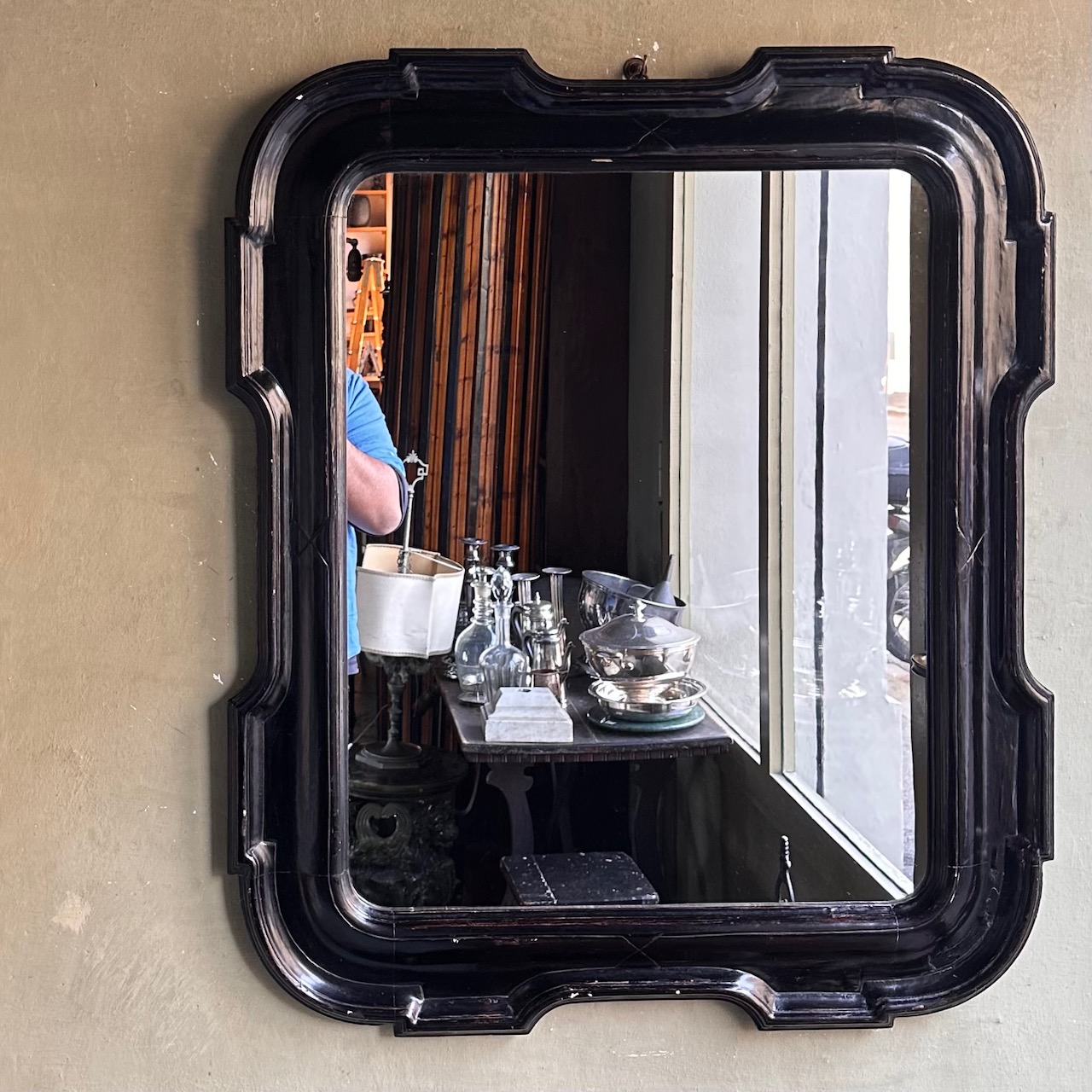 Grande Specchiera a vassoio in legno argentato ed ebanizzato. Italia, inizio sec. XX