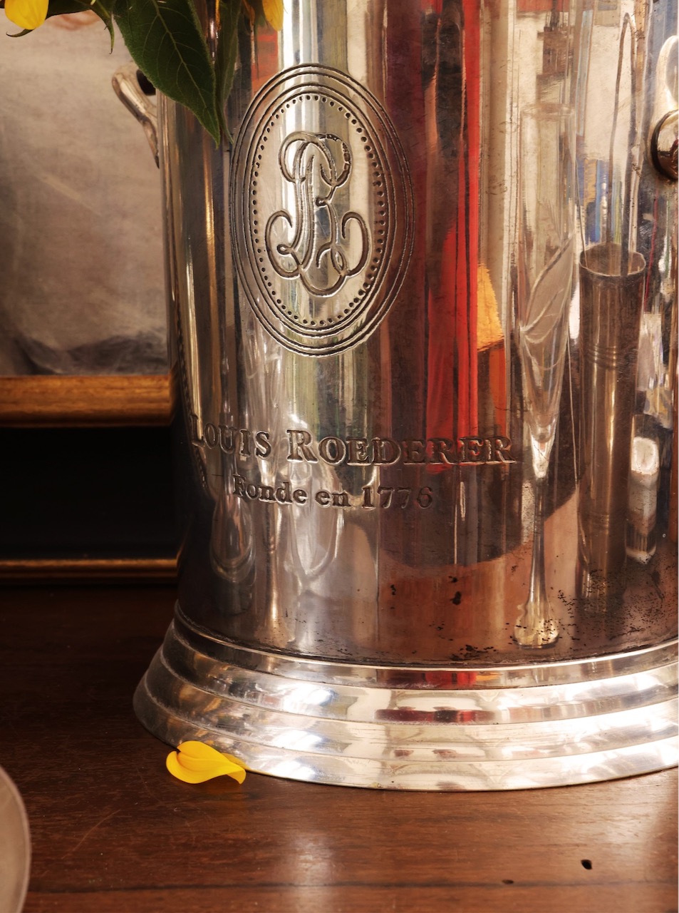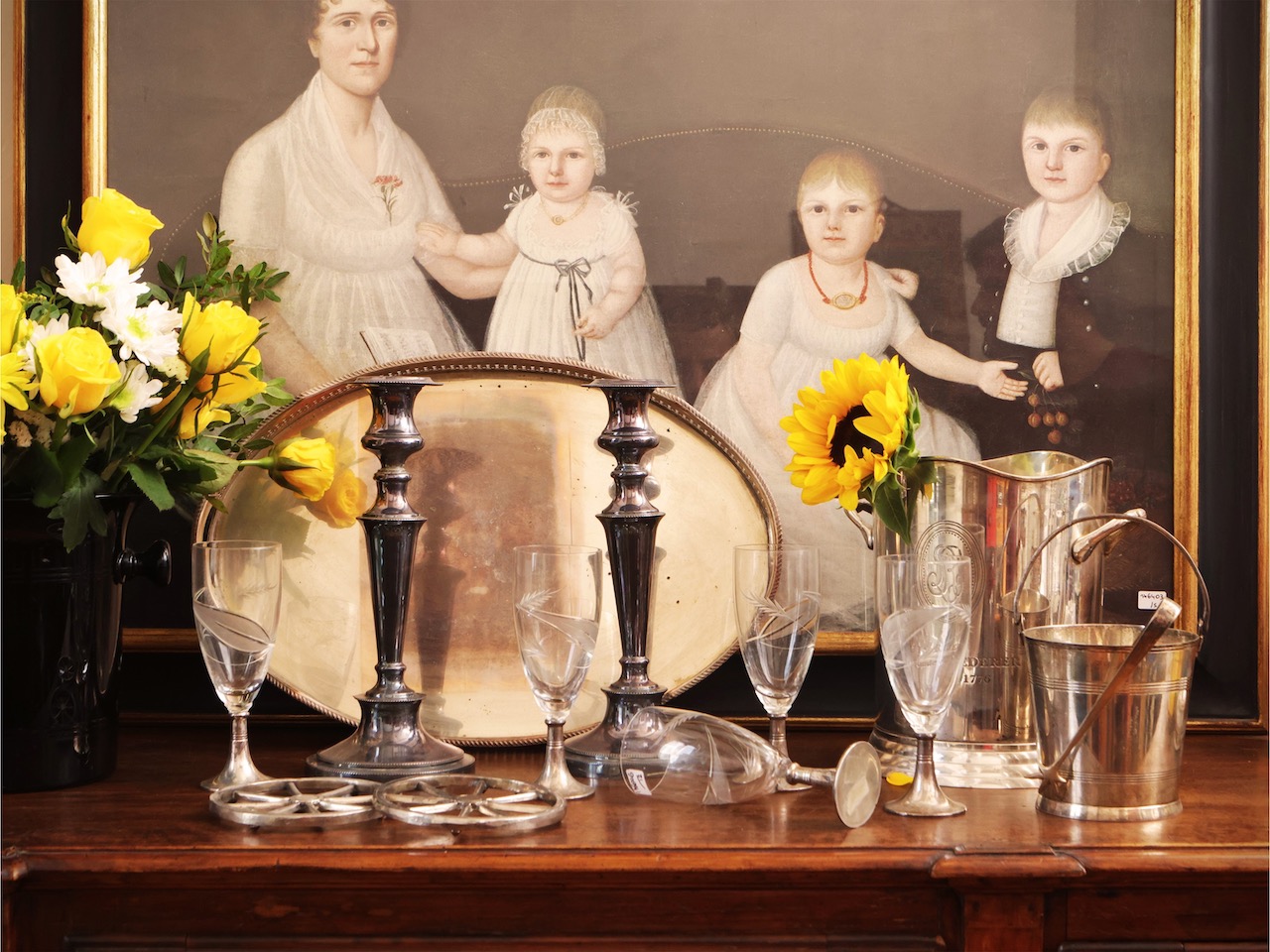 Collezione argenti e cristalli, un vassoio in argento su rame bordo a ringhiera, cinque flute base argento ed una coppia di candelieri argento su rame con fusto a colonna. Italia, sec. XIX