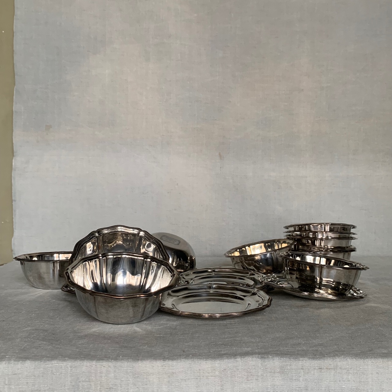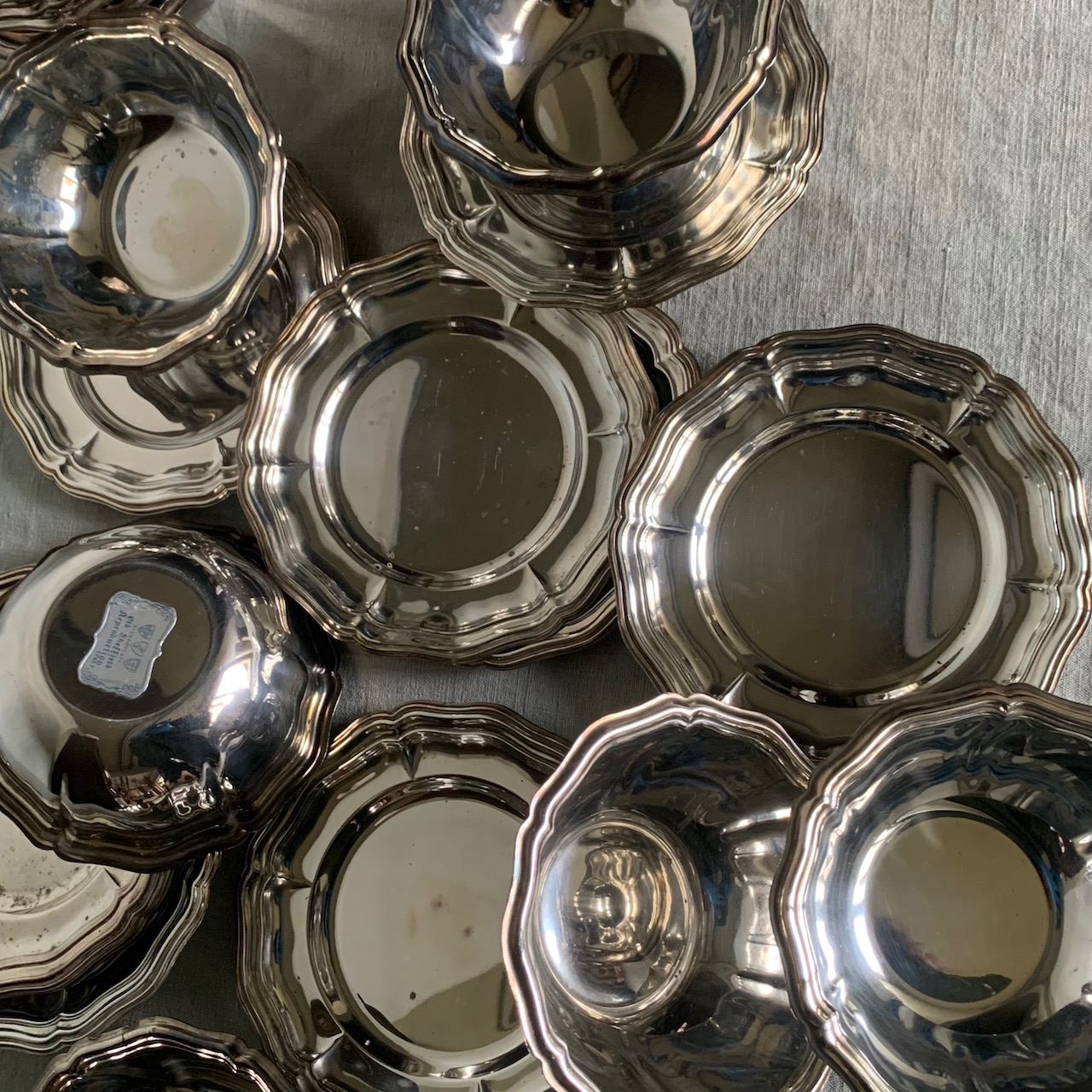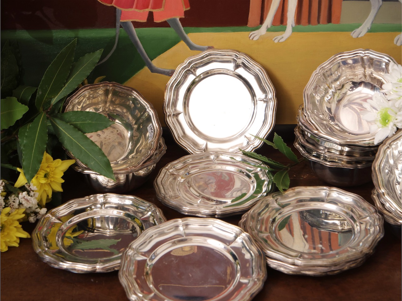Collezione dodici piatti pane e undici vaschette lavadita argento su rame, bordo mosso sagomato. Italia, sec. XX