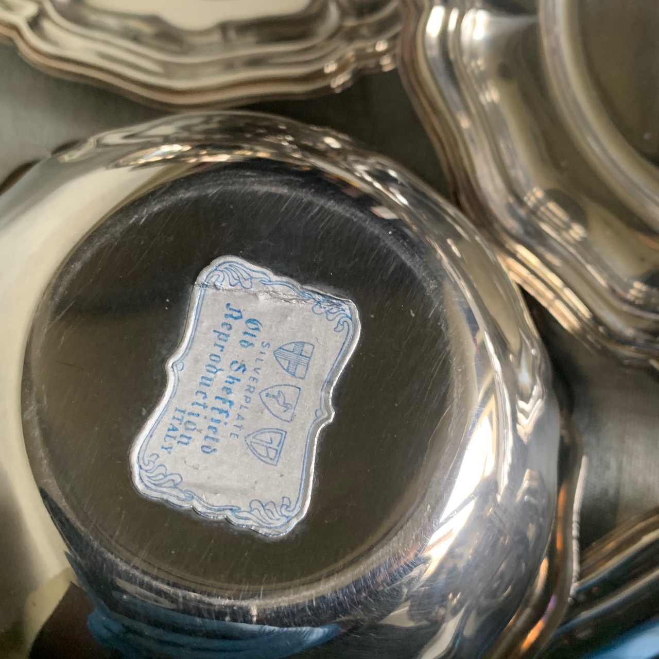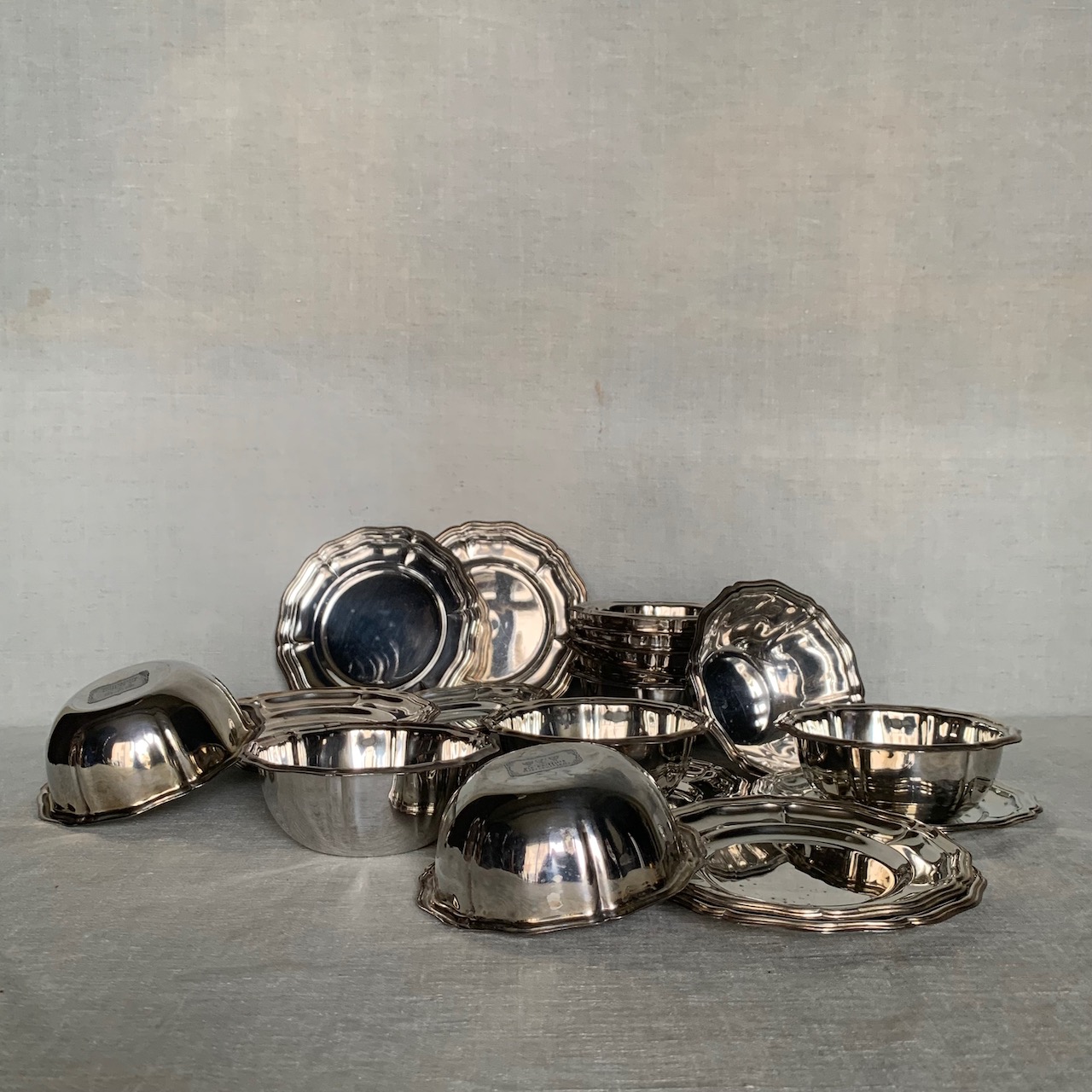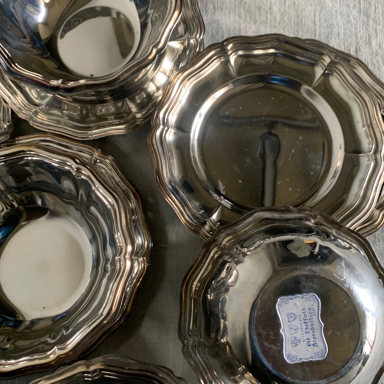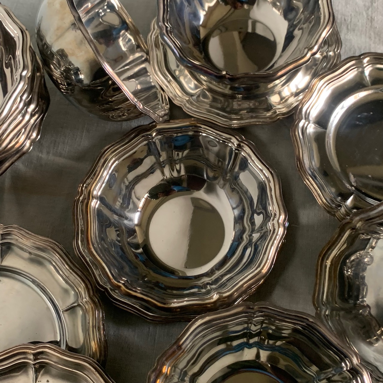 Collezione dodici piatti pane e undici vaschette lavadita argento su rame, bordo mosso sagomato. Italia, sec. XX