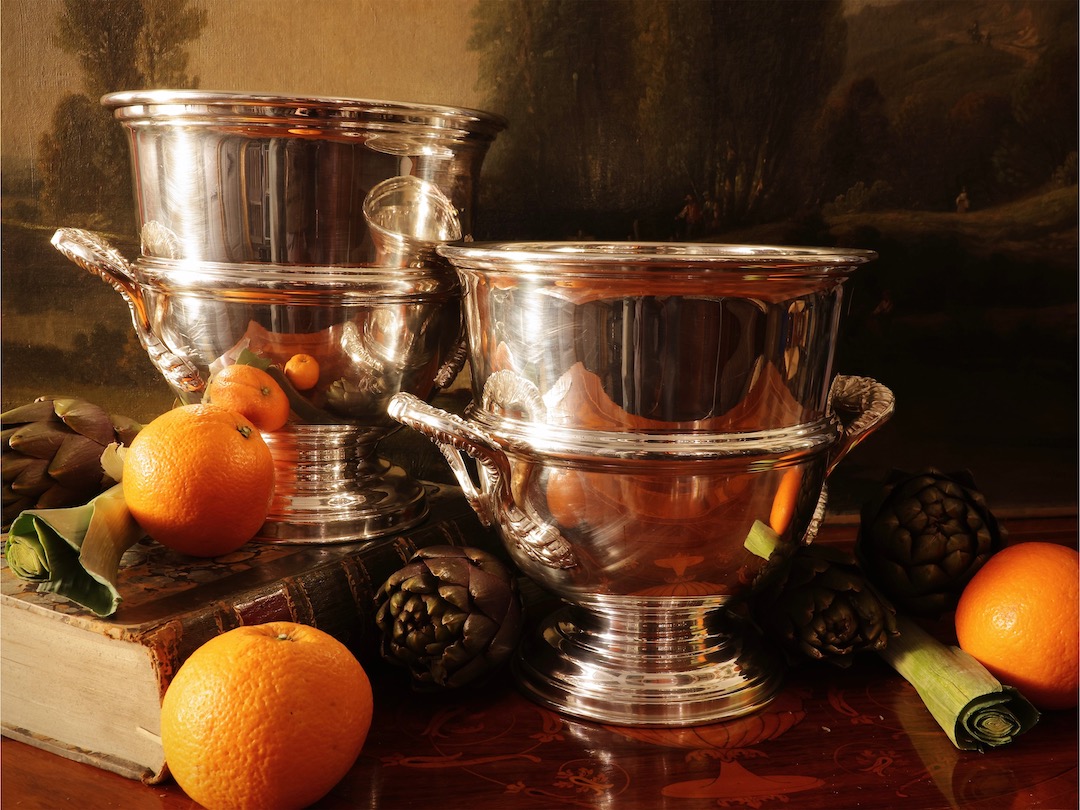Coppia di vasi medici rinfrescatoi, in argento su rame. Argentieri Teghini, FIrenze 1960 ca
