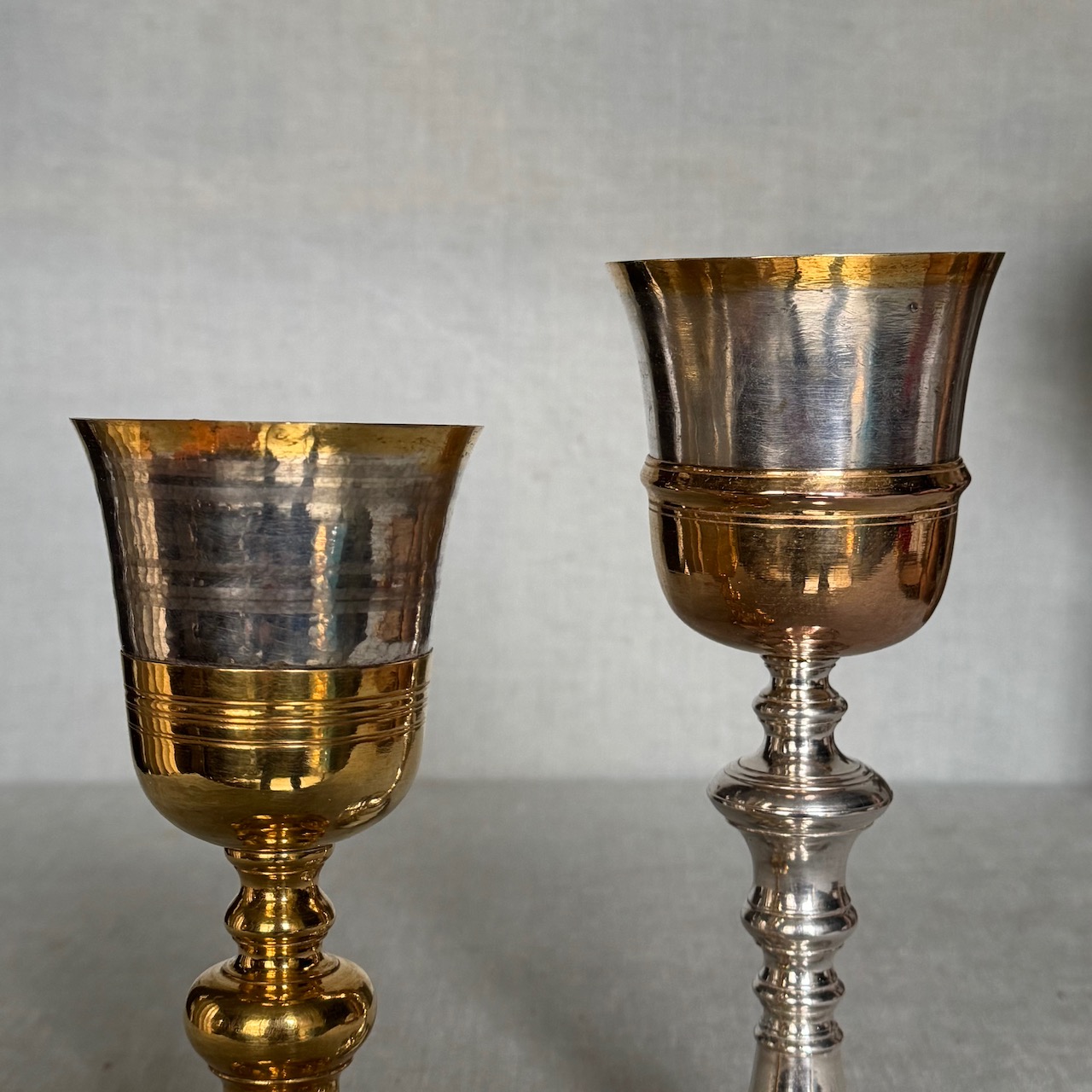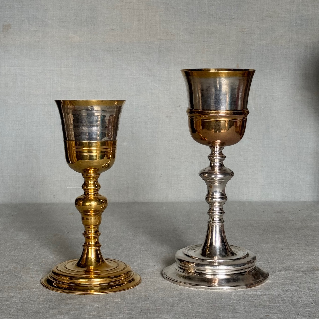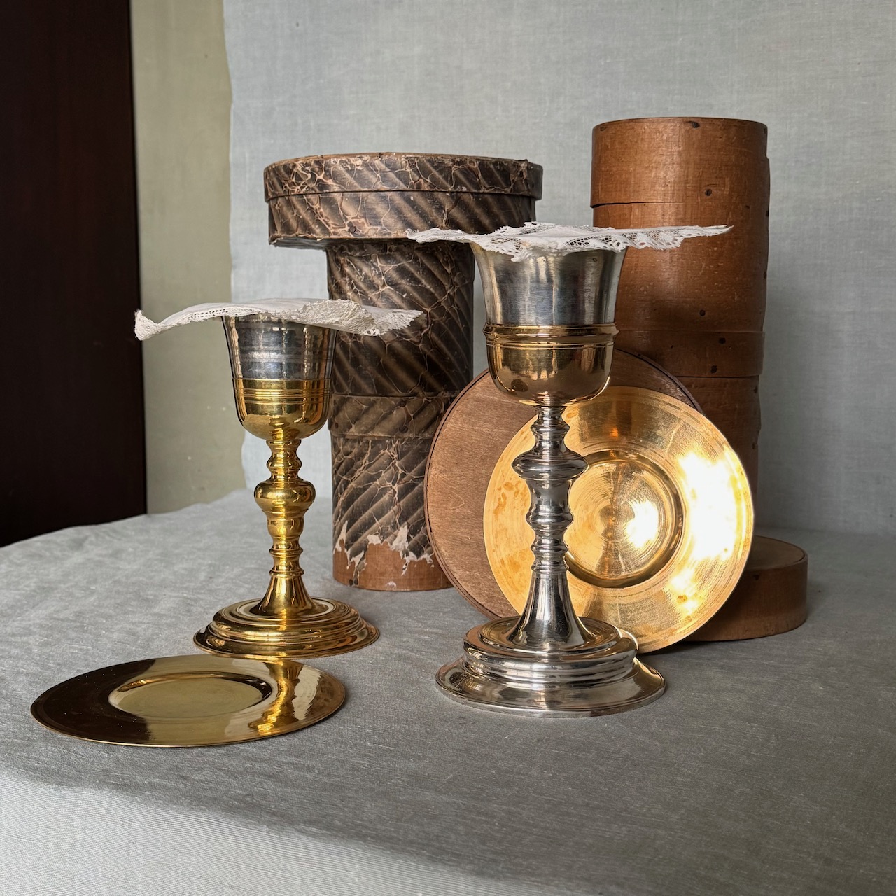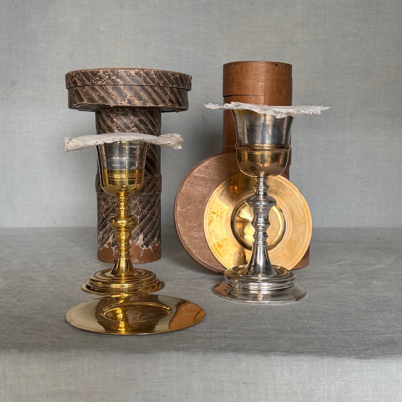 Due calici liturgici, fusti a rocchetto, coppe in argento vermeille, e due patene eucaristiche in argento a patina oro, centrini in lino ricamato e custodie originali in legno. Italia, inizio sec. XX