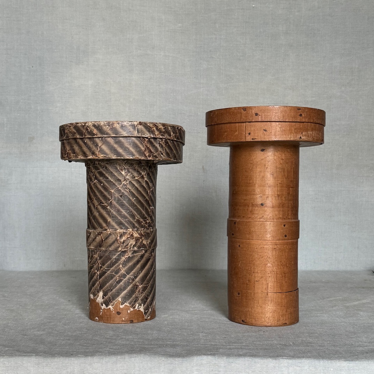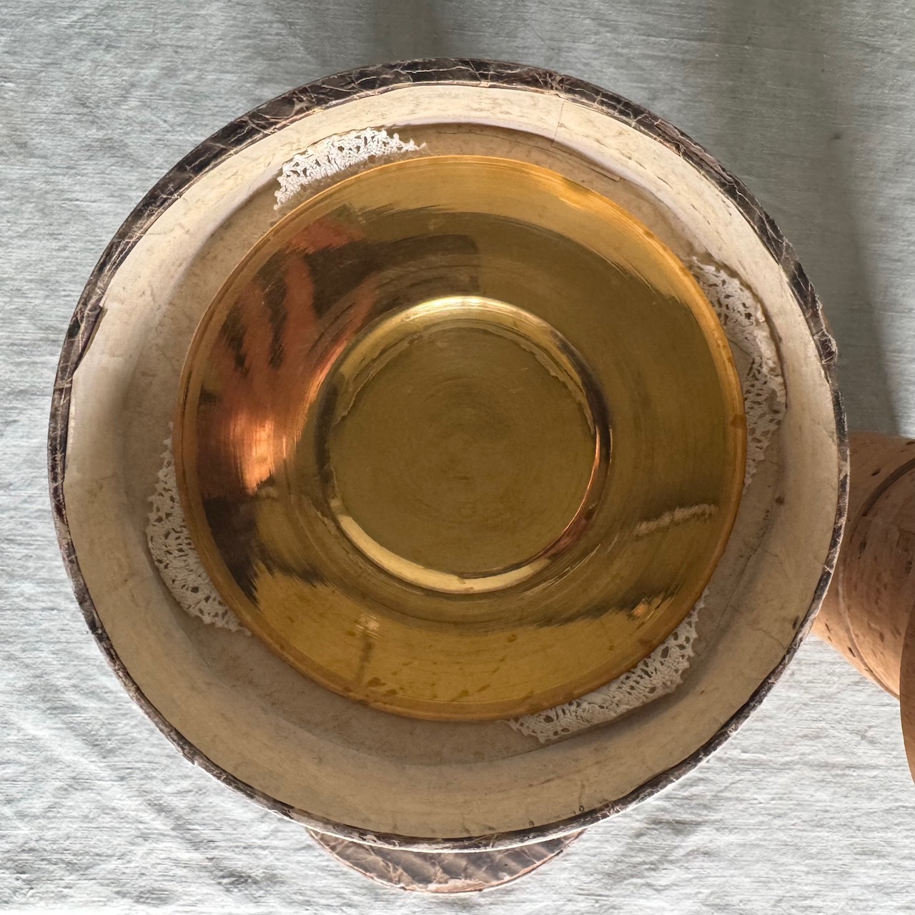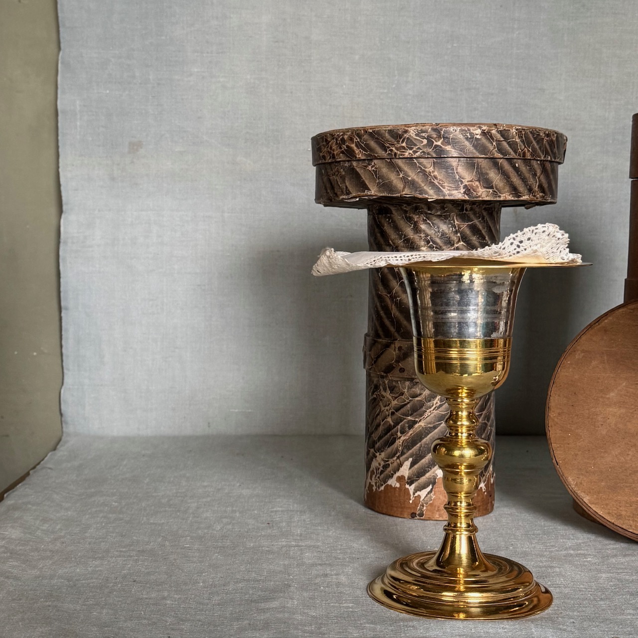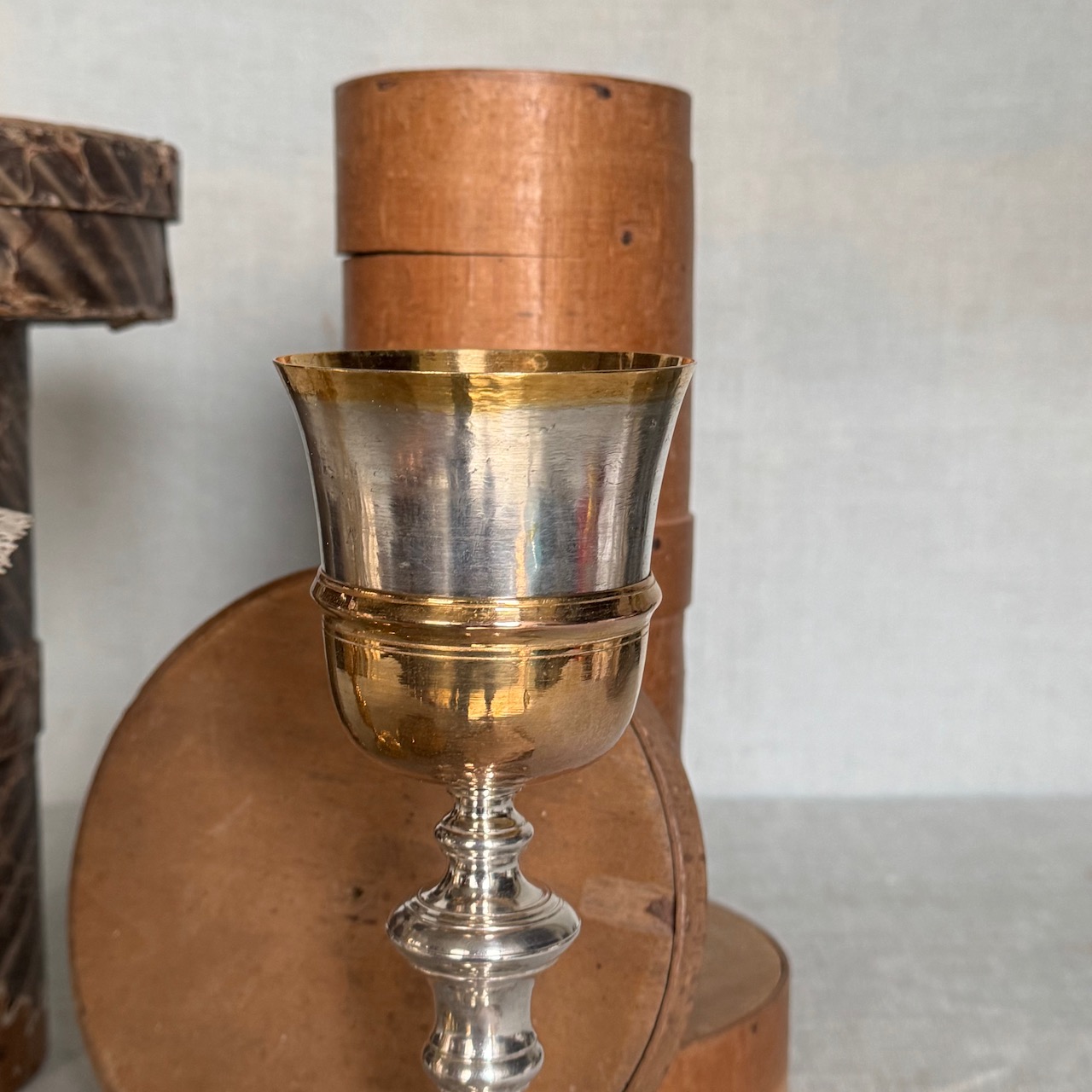 Due calici liturgici, fusti a rocchetto, coppe in argento vermeille, e due patene eucaristiche in argento a patina oro, centrini in lino ricamato e custodie originali in legno. Italia, inizio sec. XX