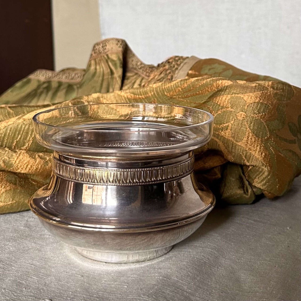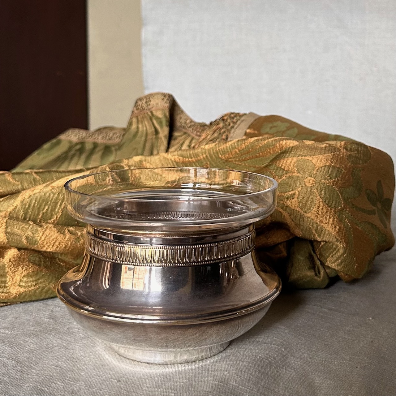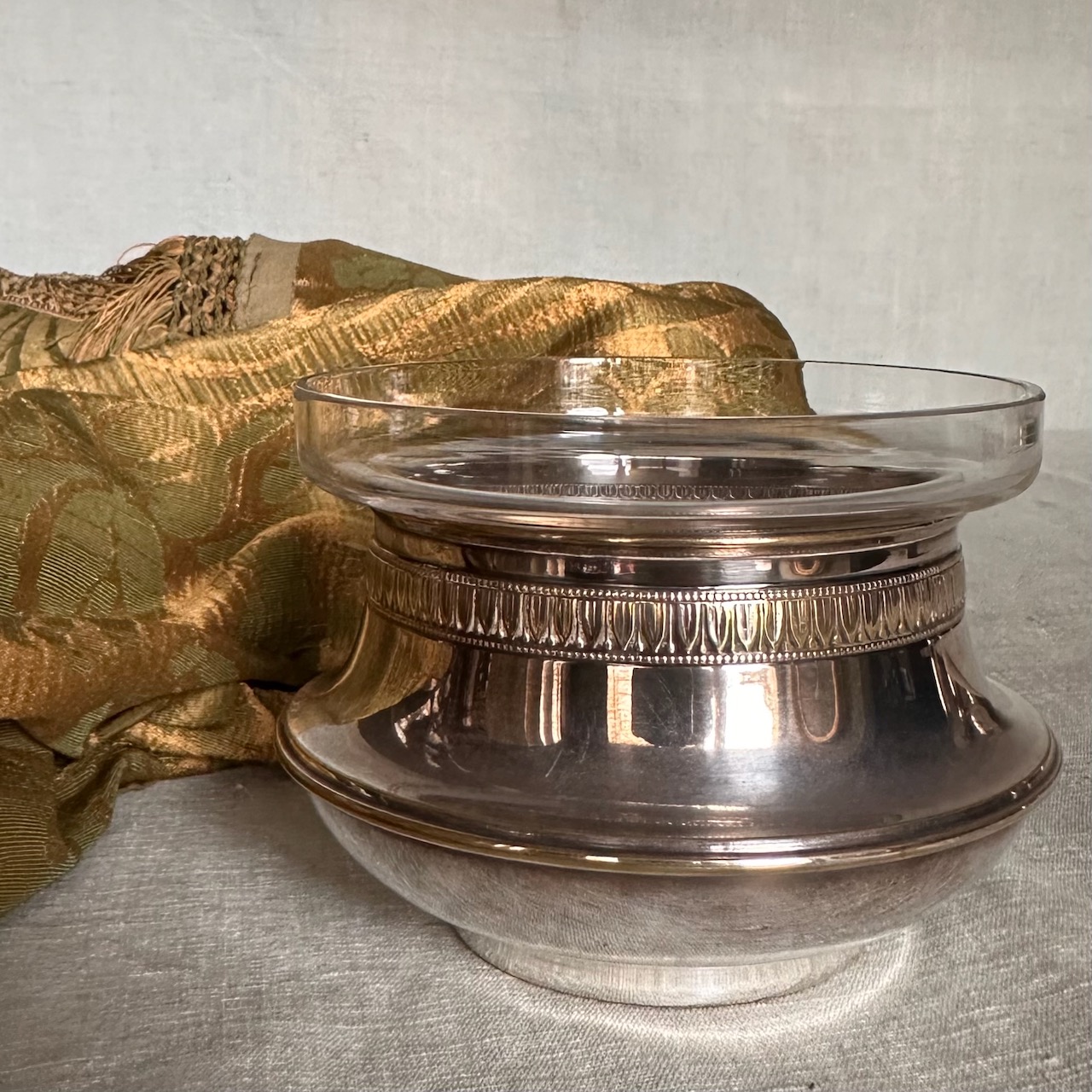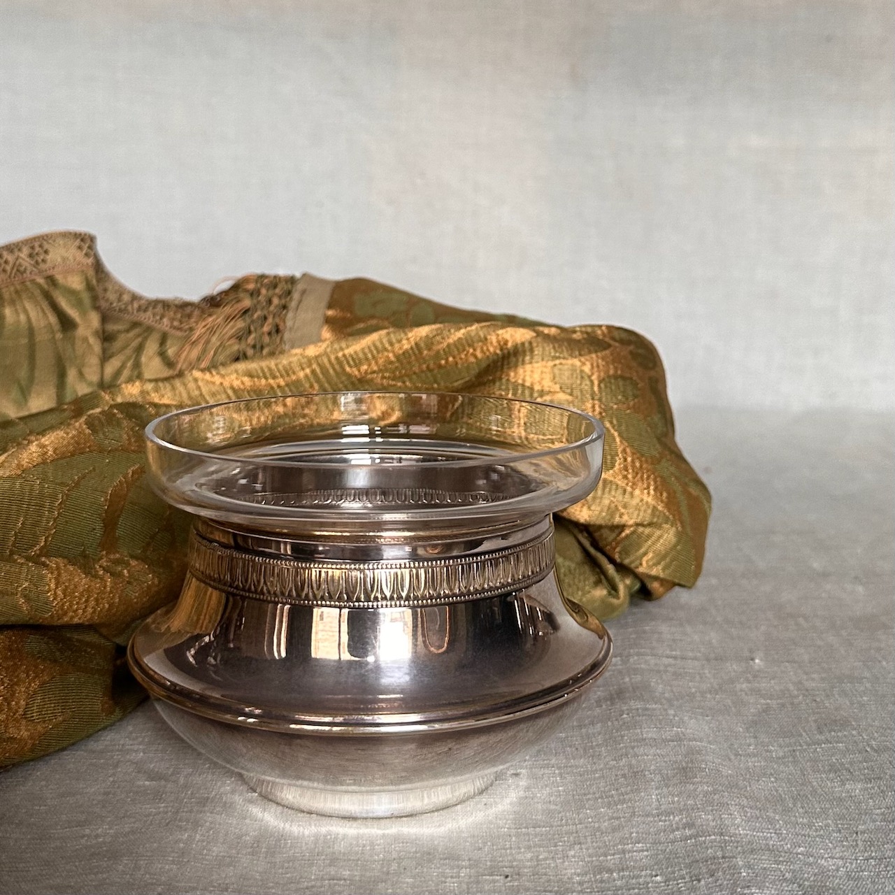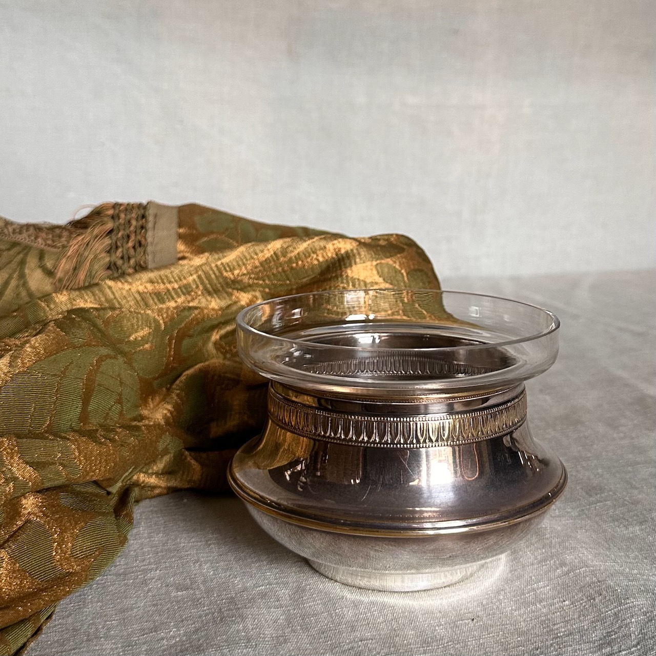 Portacaviale in argento su rame e vetro, bordo cesellato. Italia, sec. XX