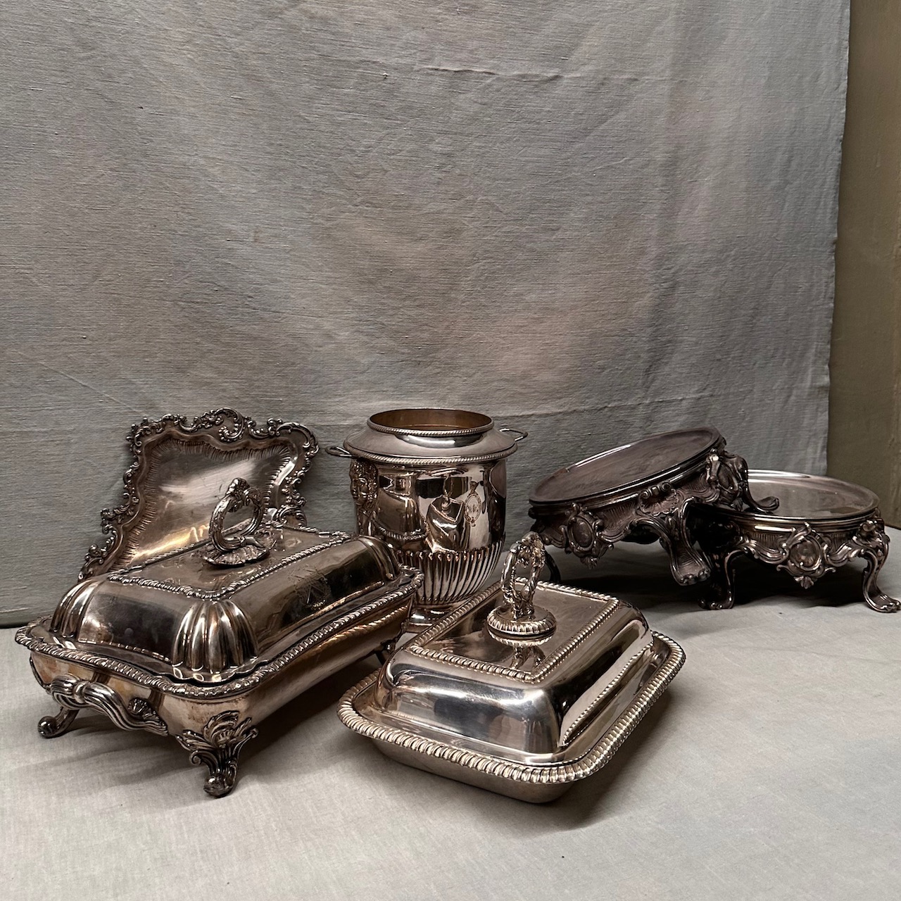 Set accessori argento, coppia di basi, due legumiere, un vassoio e un rinfrescatoio. Italia. sec. XIX