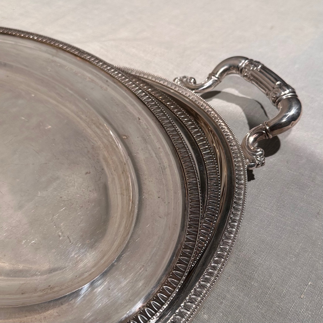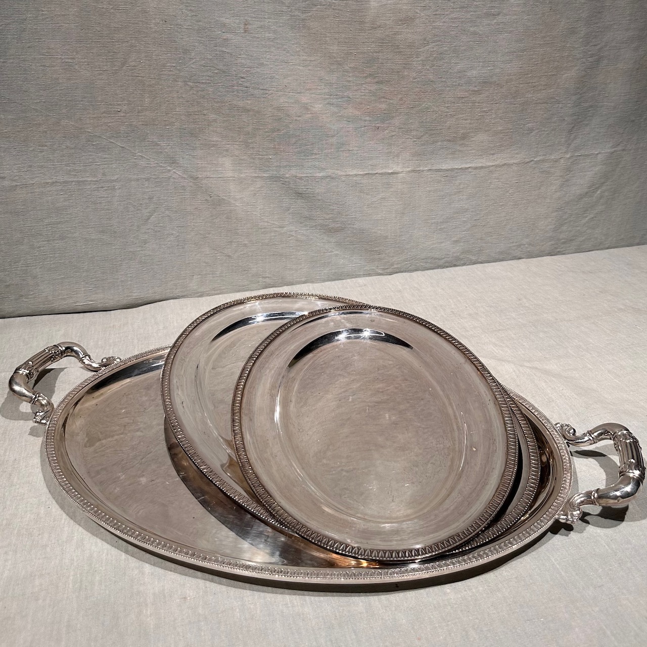 Tre vassoi cesellati argento, ovali, uno a due manici. Italia, sec. XIX