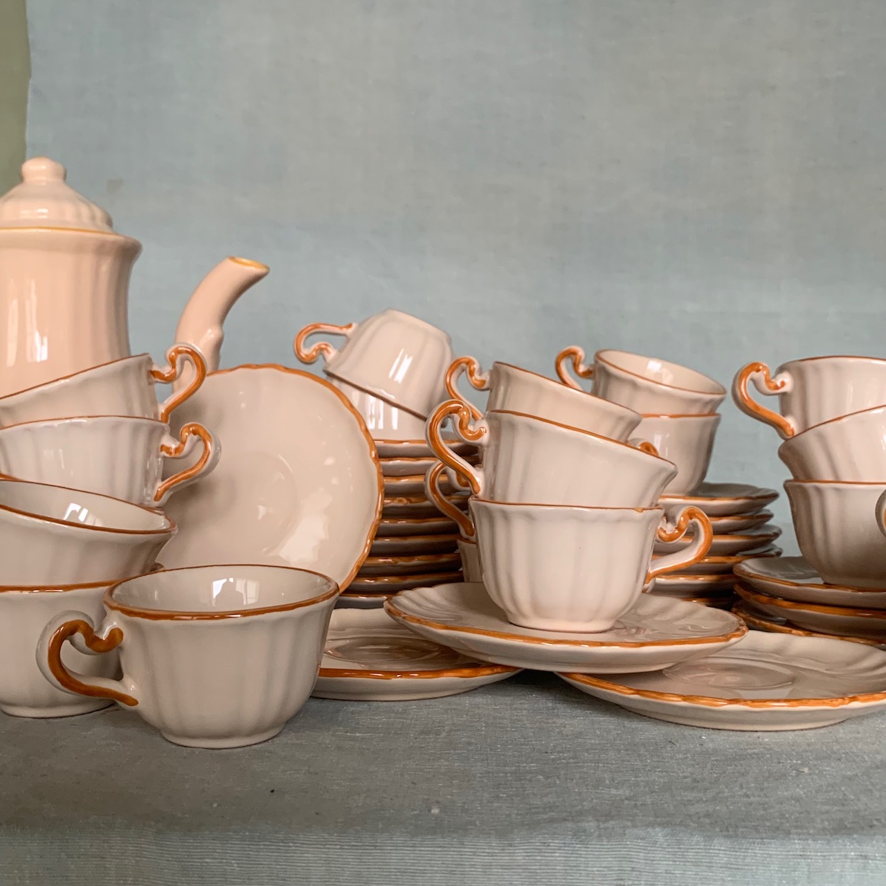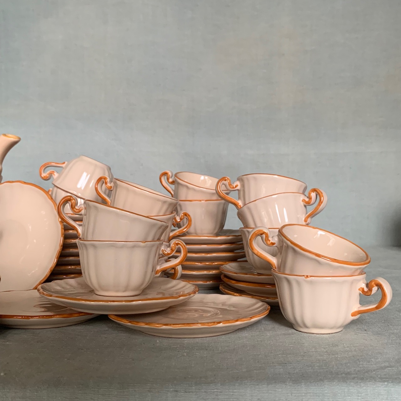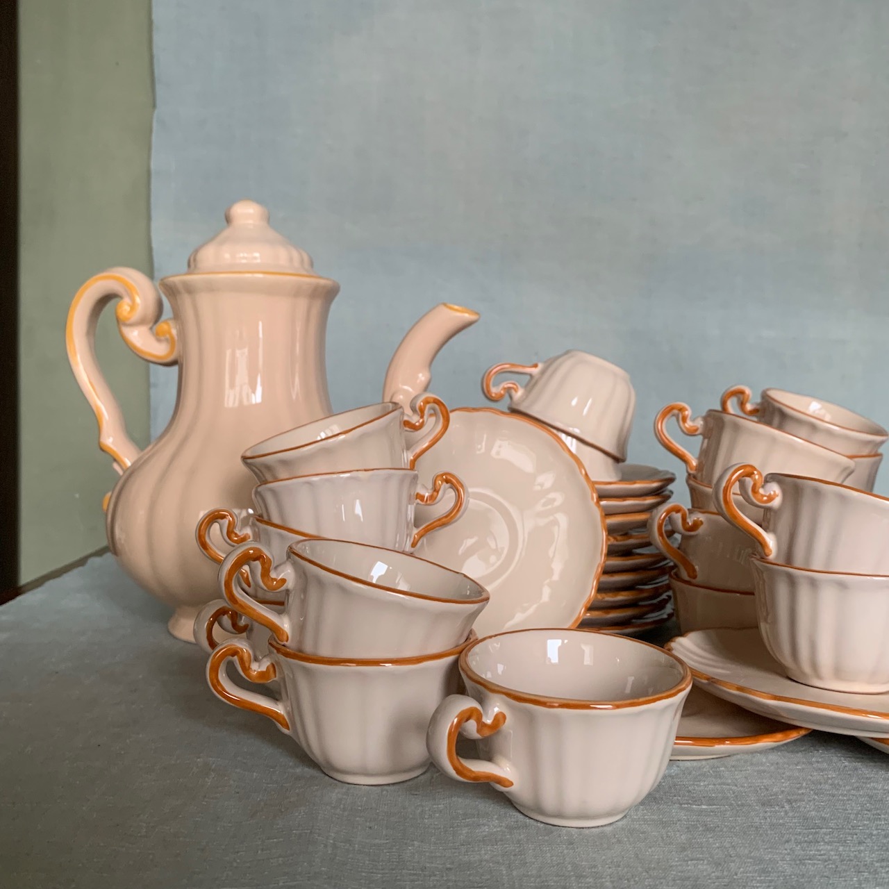 Servito caffè, caffettiera e tazzine con piattino, in maiolica a policromia pastello, disponibili in sette diversi colori. Collebi, Toscana