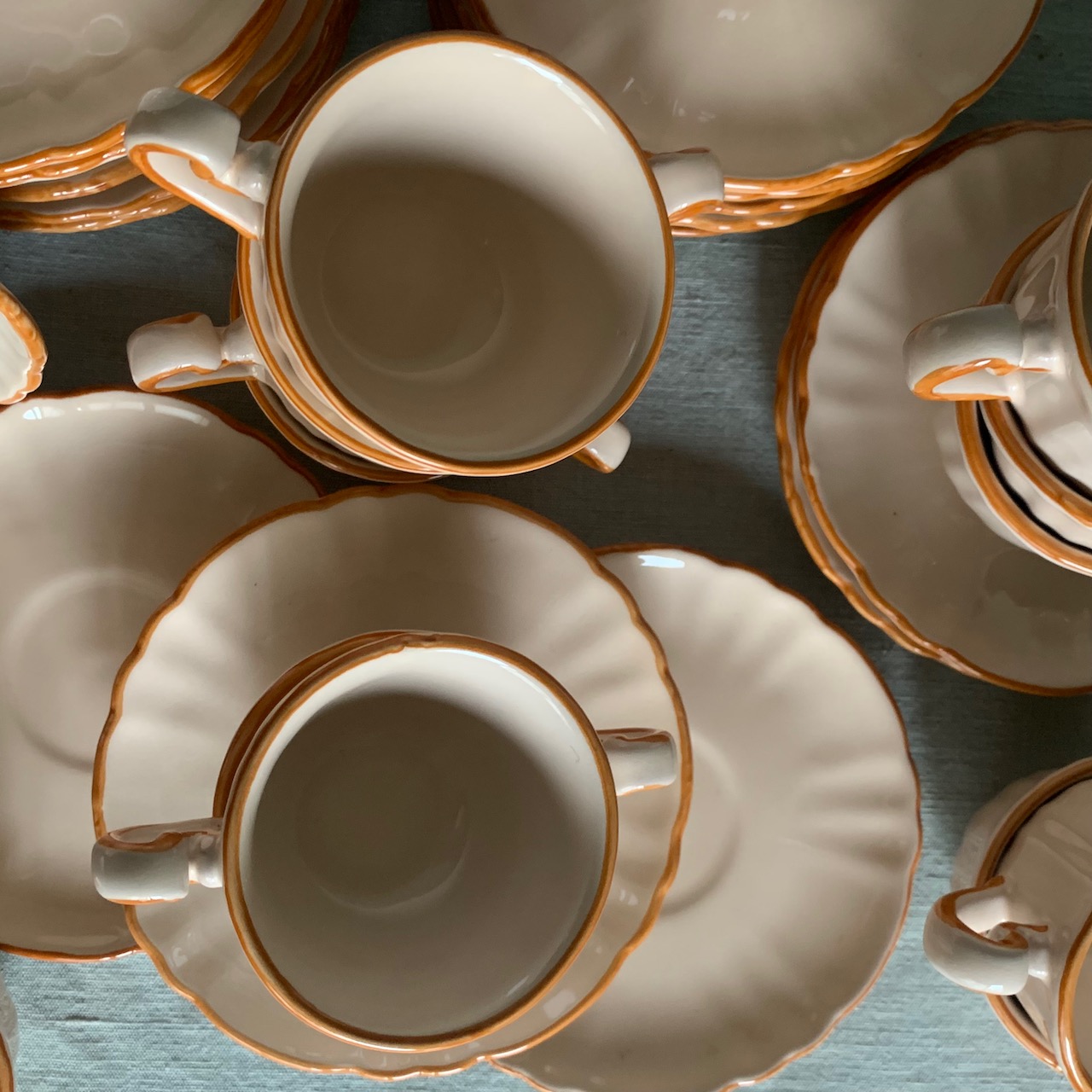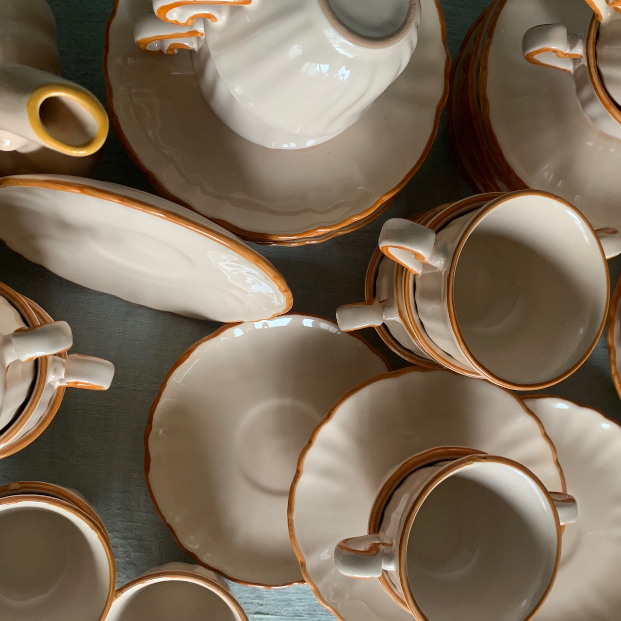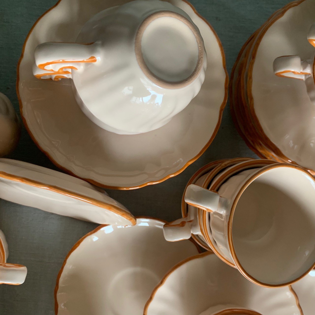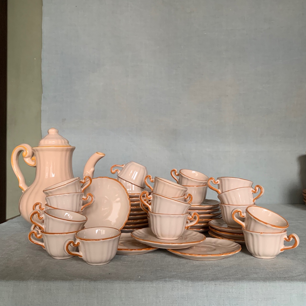 Servito caffè, caffettiera e tazzine con piattino, in maiolica a policromia pastello, disponibili in sette diversi colori. Collebi, Toscana
