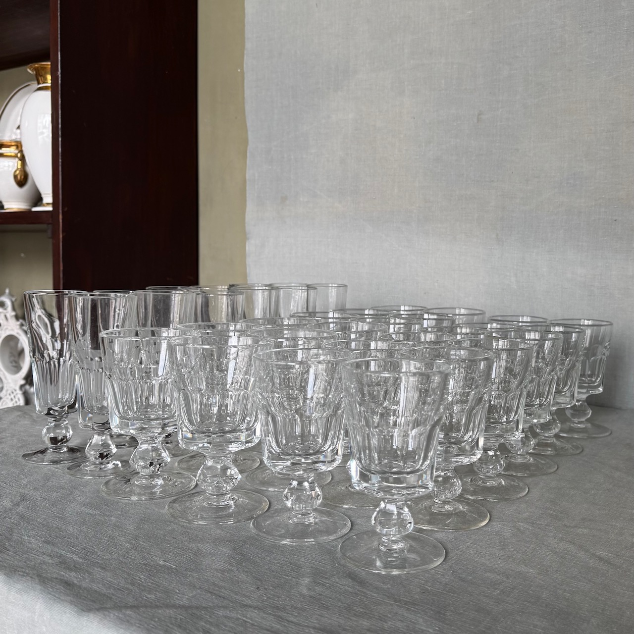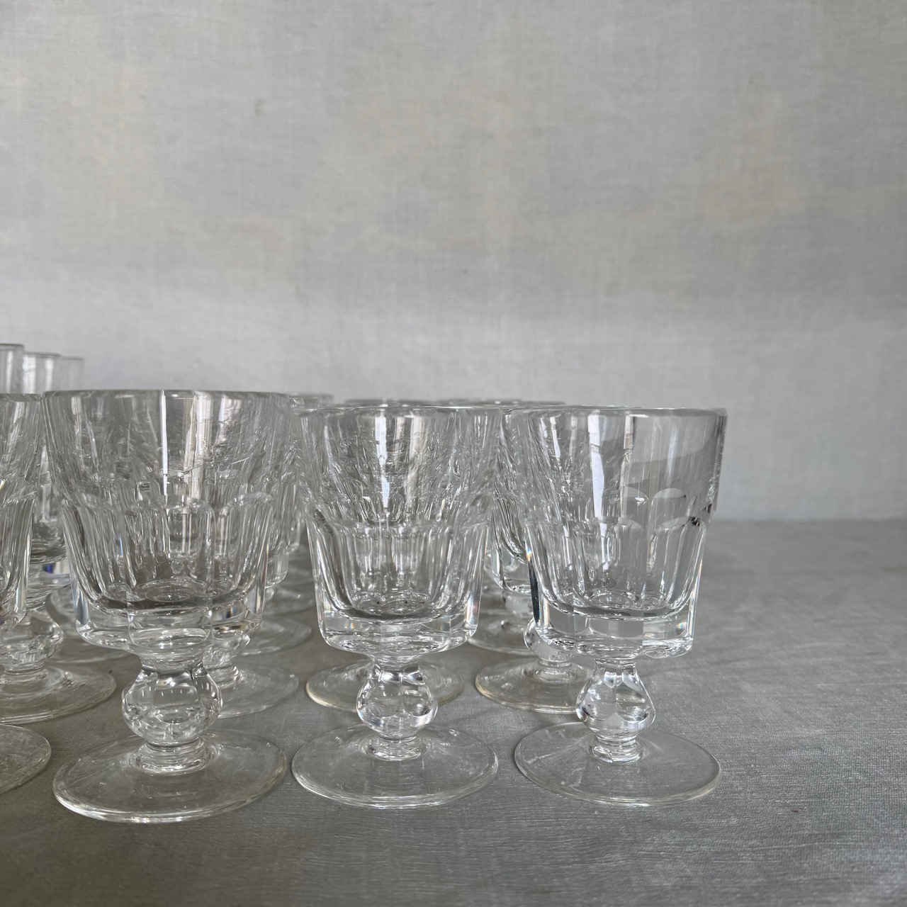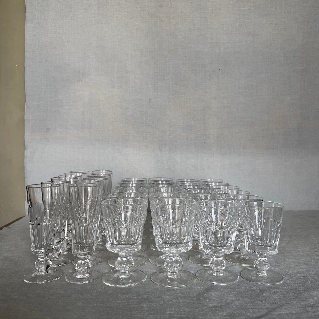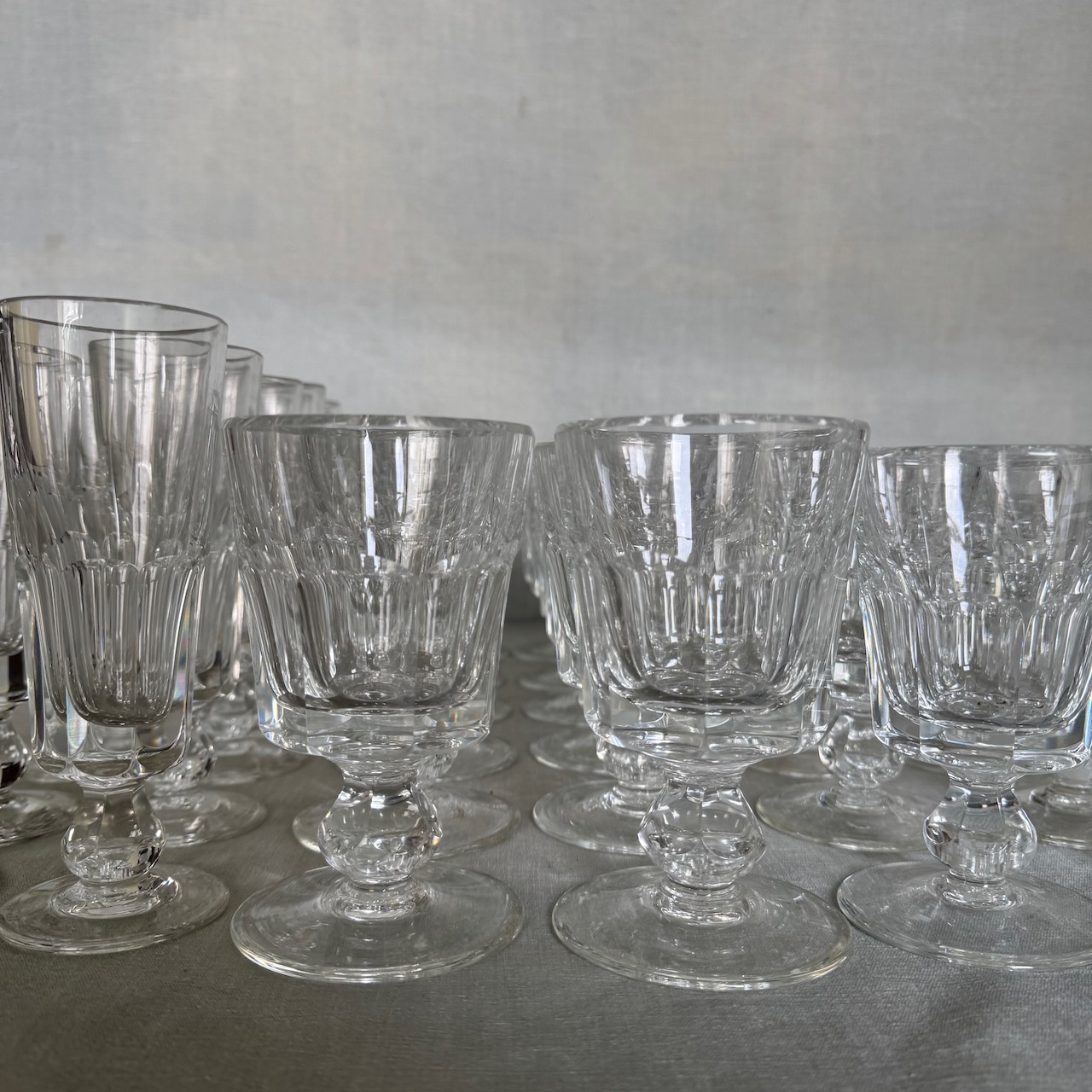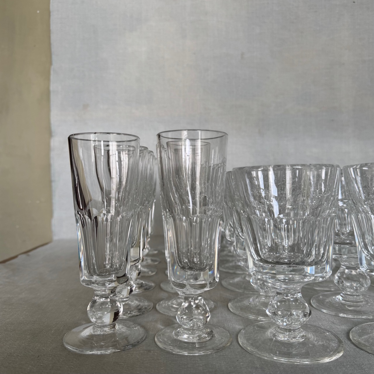 Calici in cristallo molato, dodici flutes, dodici acqua, dodici vino. Italia, sec. XX