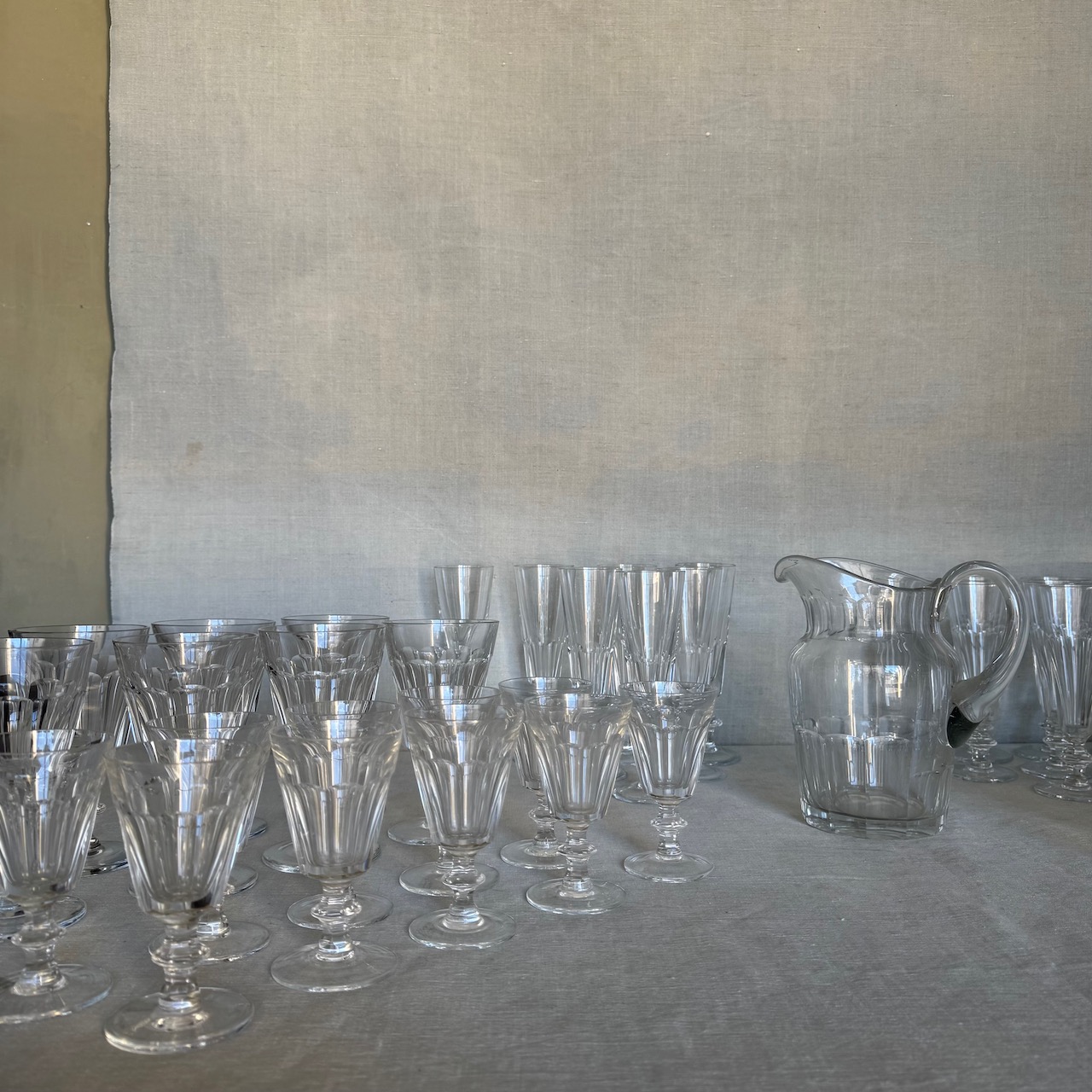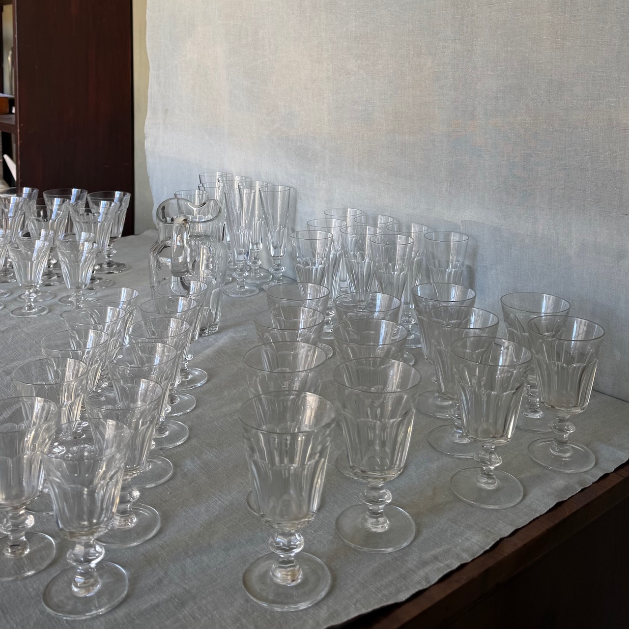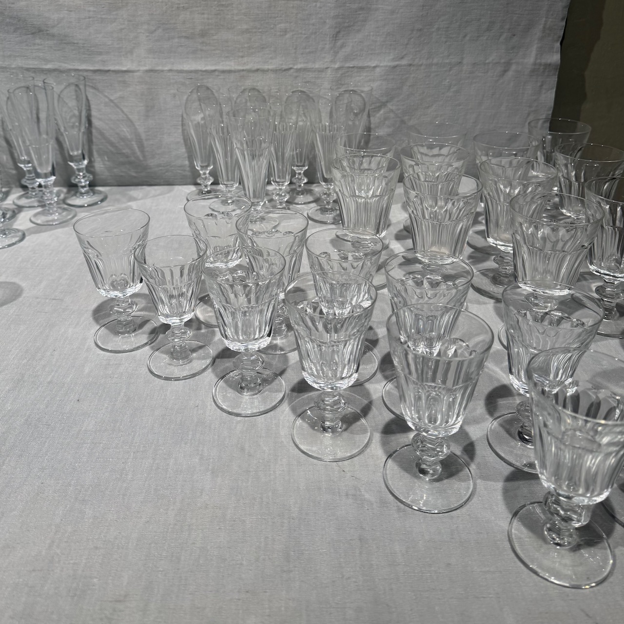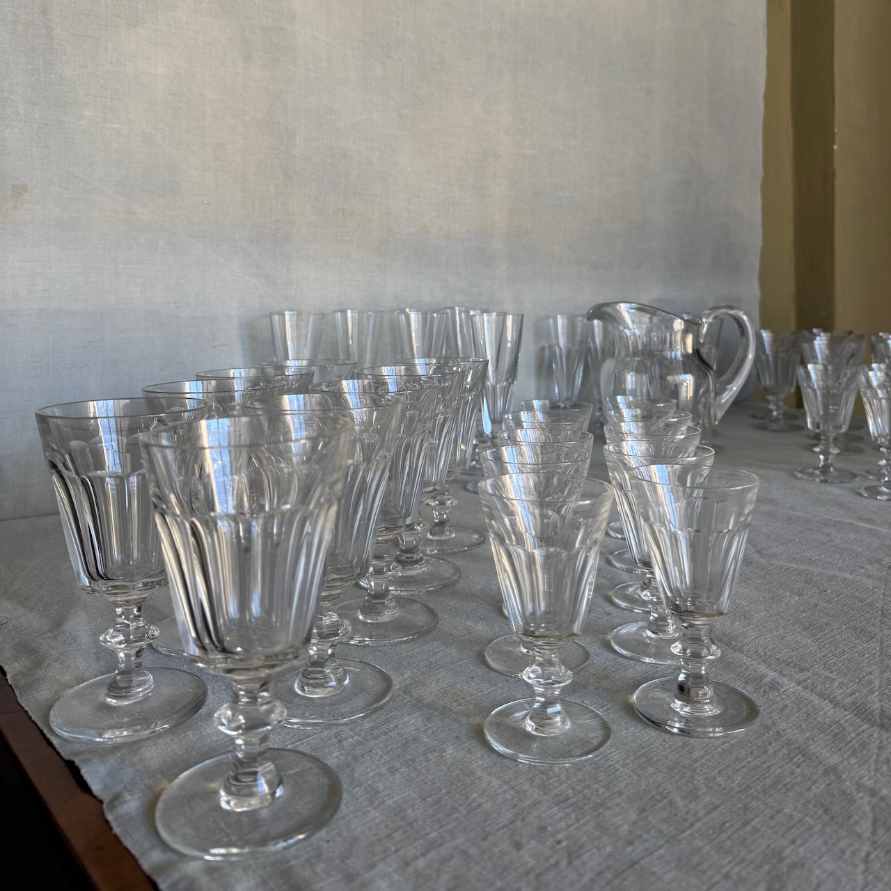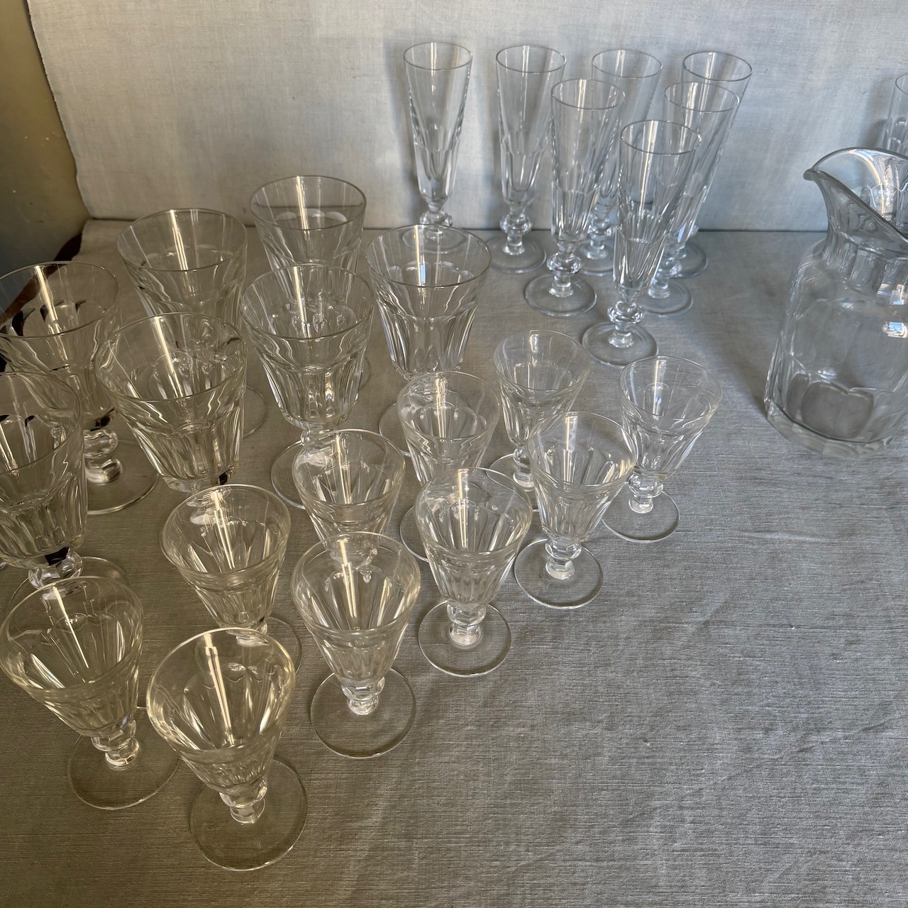 Servito calici cristalli, sette flûte, 8 flûte, 9 calici acqua, 11 calici vino, 21 calici vin santo (due misure diverse, 10+11), 1 brocca. Italia, sec. XX
