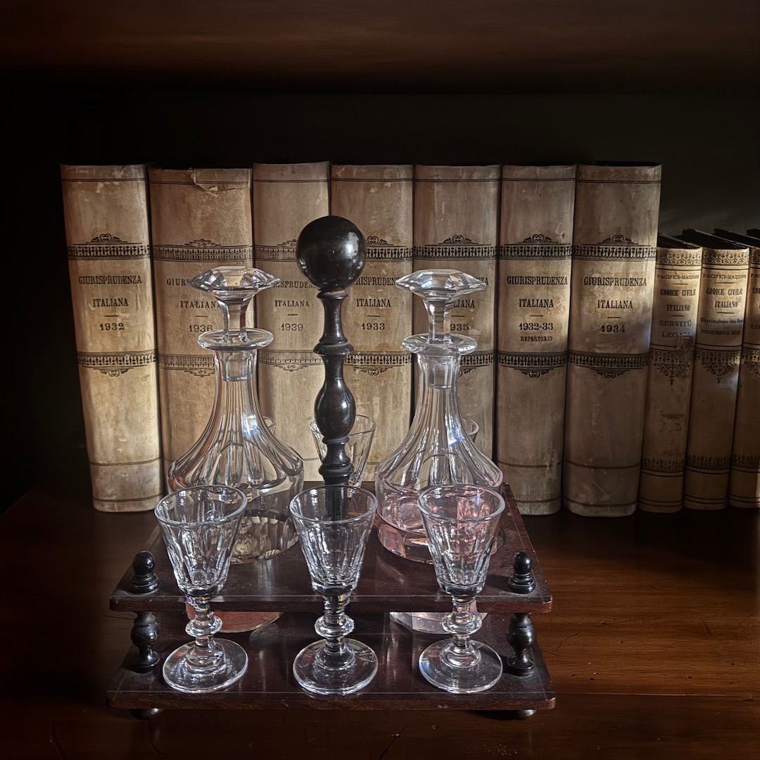 Servito da rosolio in cristallo, sei coppe e due bottiglie. in con porta bicchieri e bottiglie in noce . Italia, sec. XIX