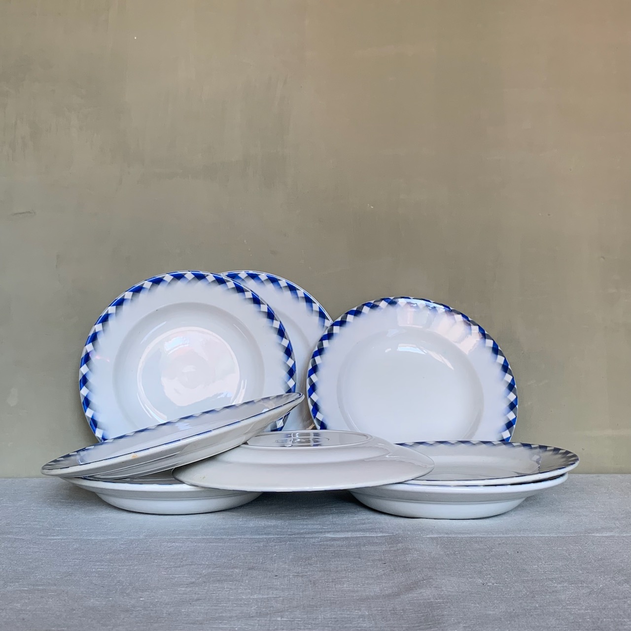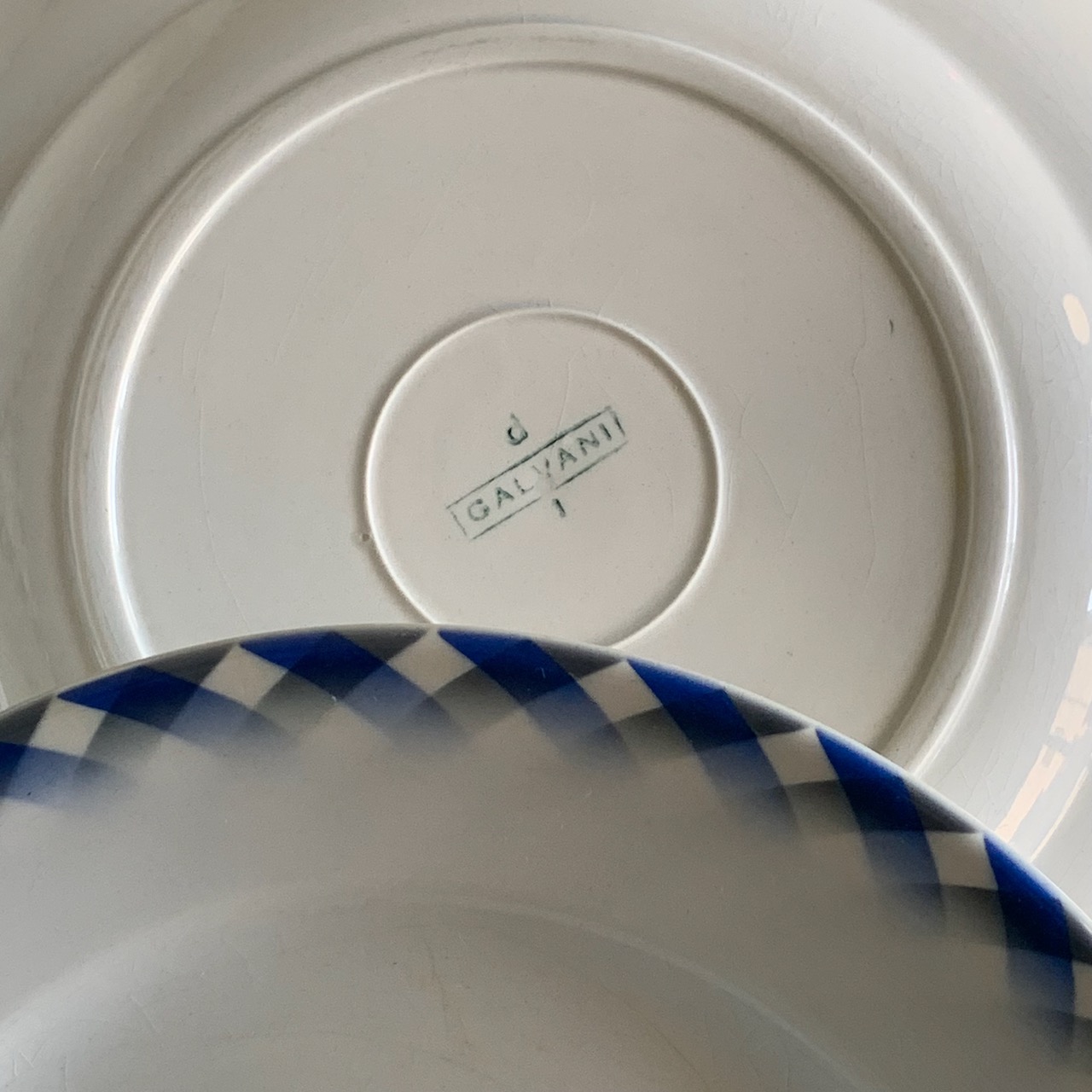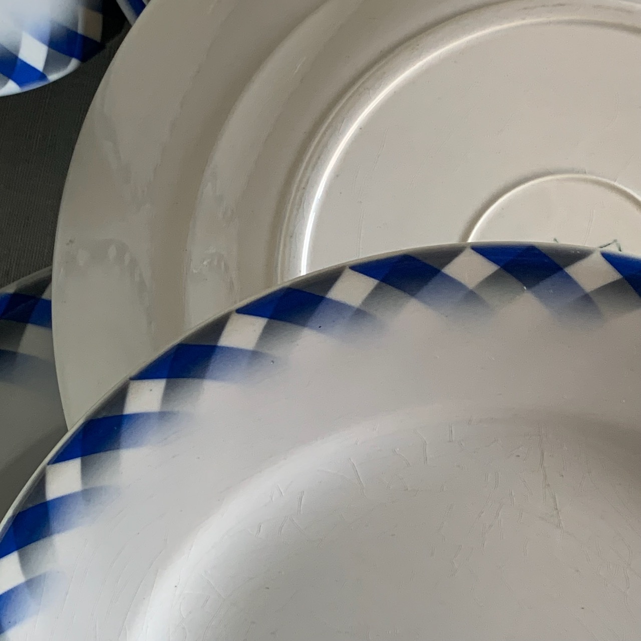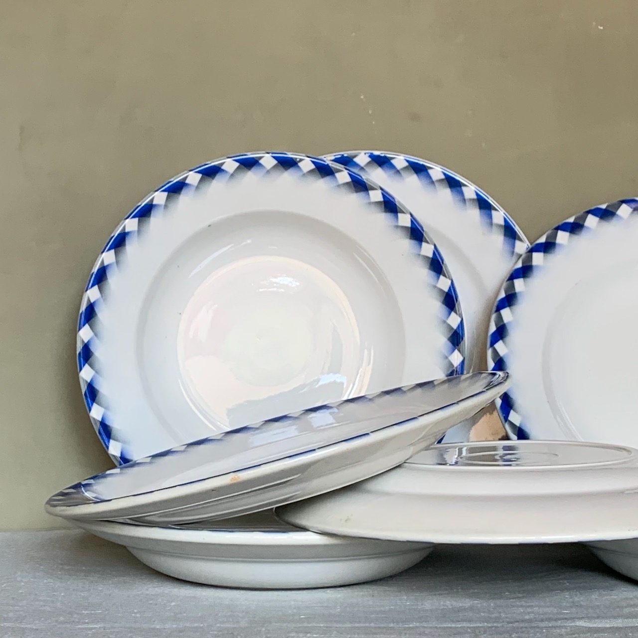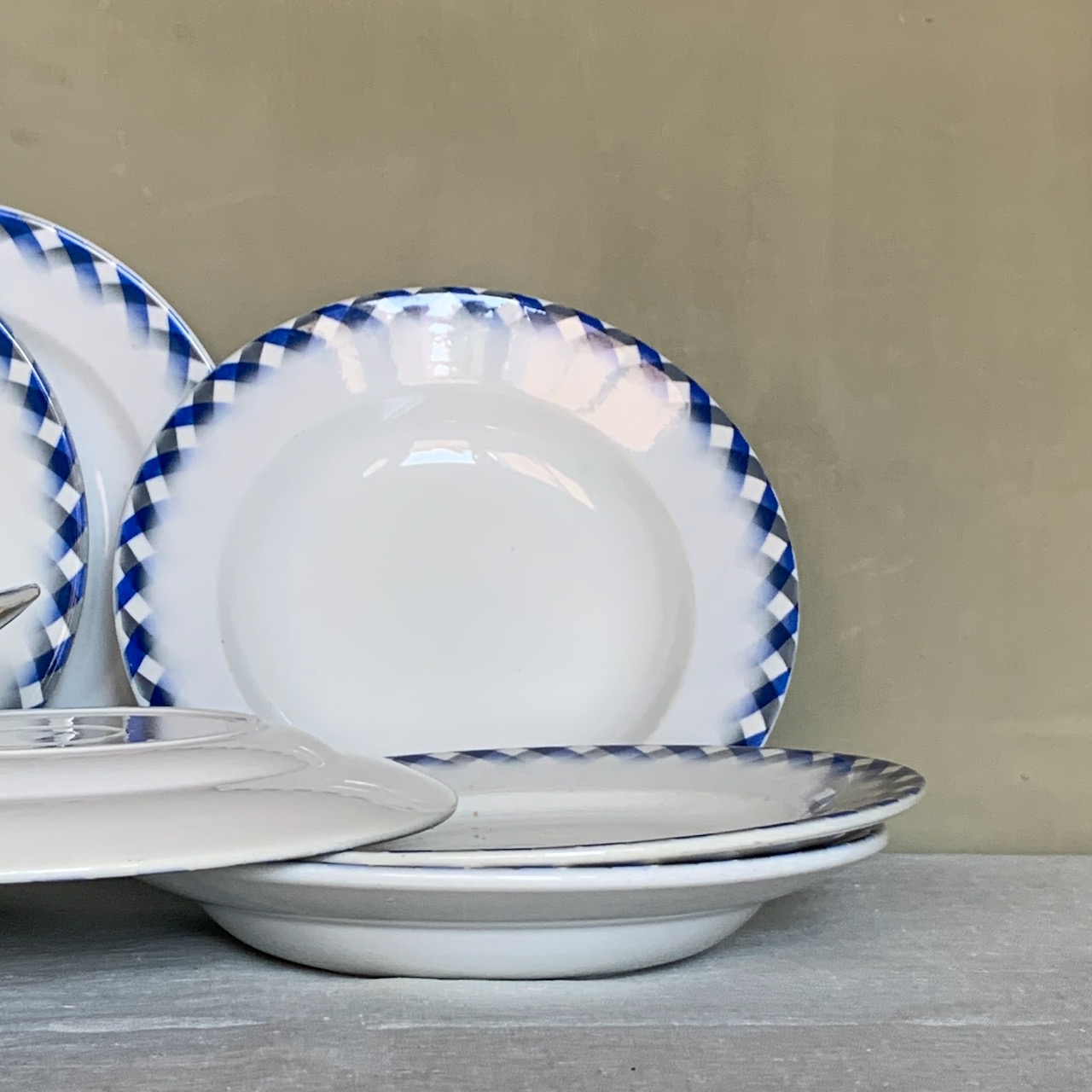 Set quattro piatti piani e quattro fondi in maiolica smaltata bianca con bordo a decoro tartan blu, Galvani. Italia, sec. XX