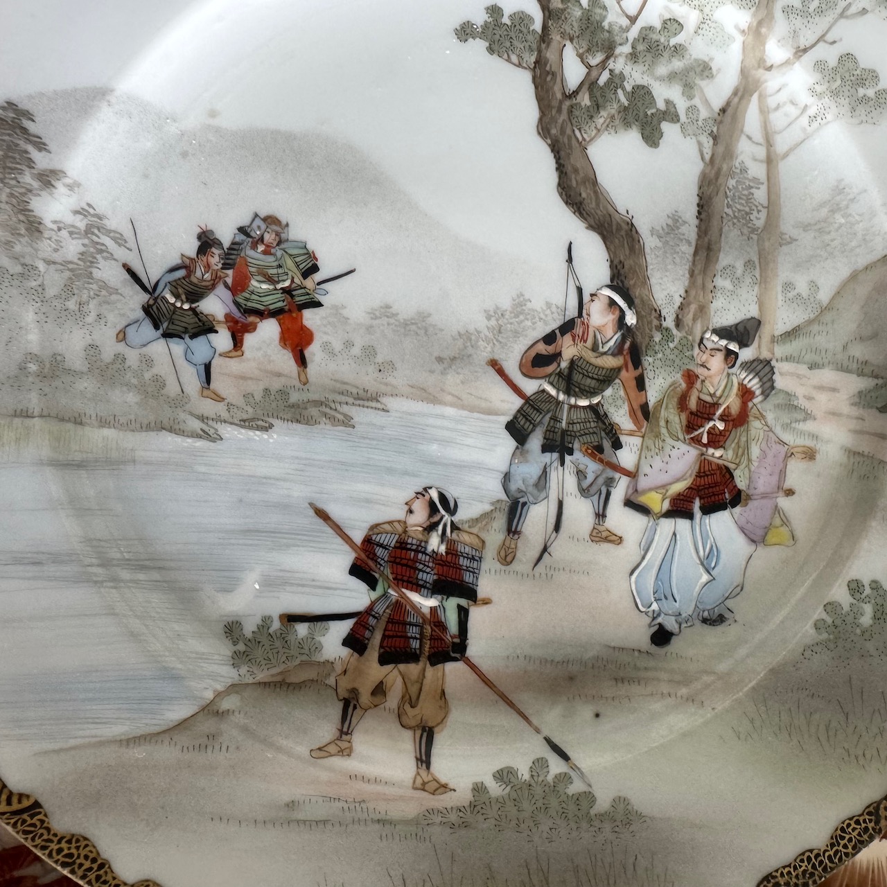 Dodici piatti in porcellana bianca dipinta a policromia e oro con figure e paesaggi, samurai. Giappone, inizio sec. XX