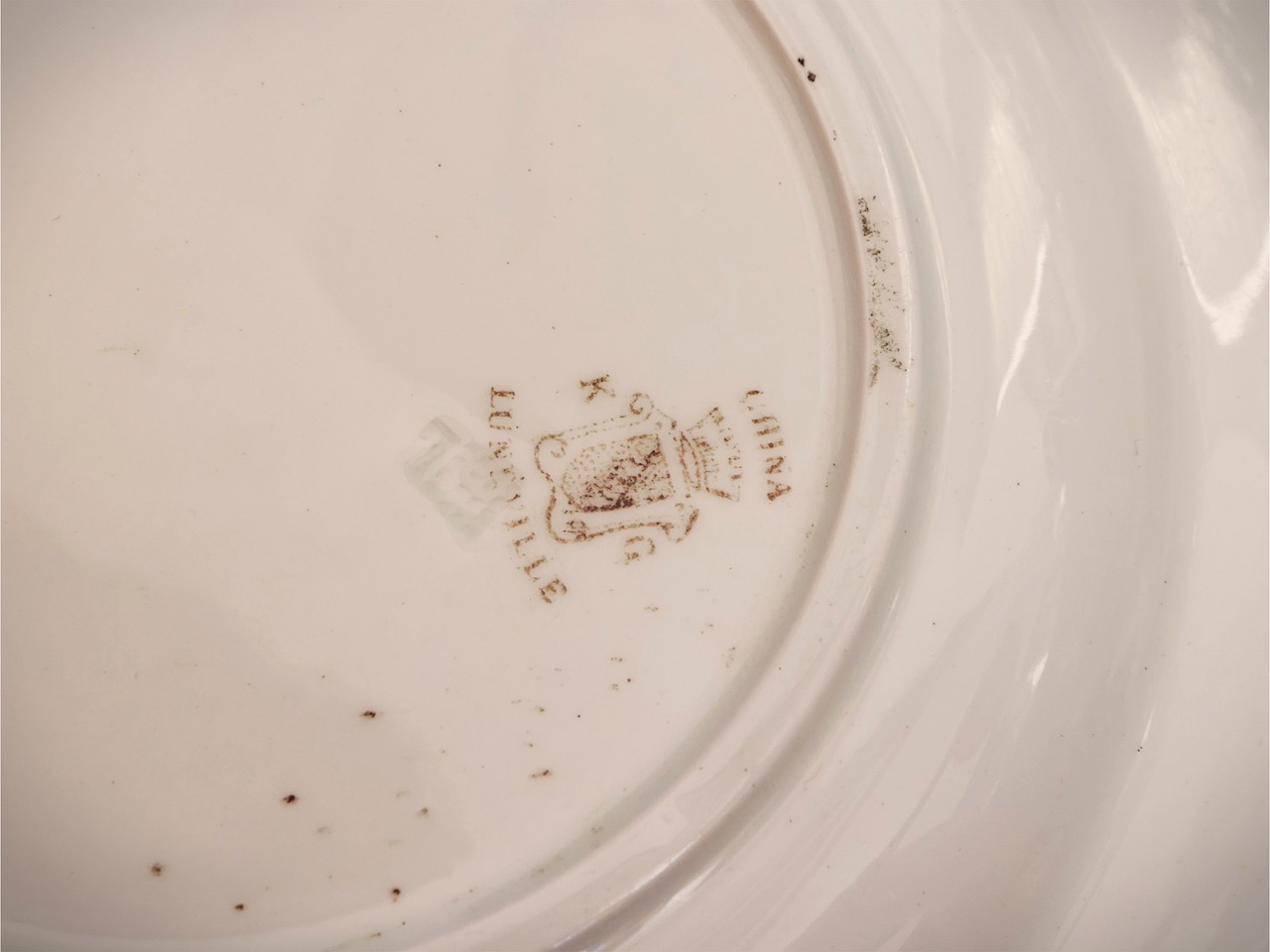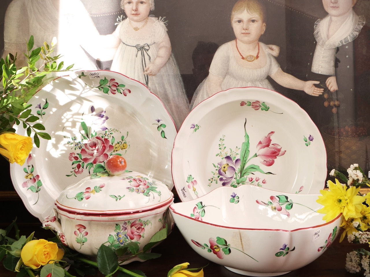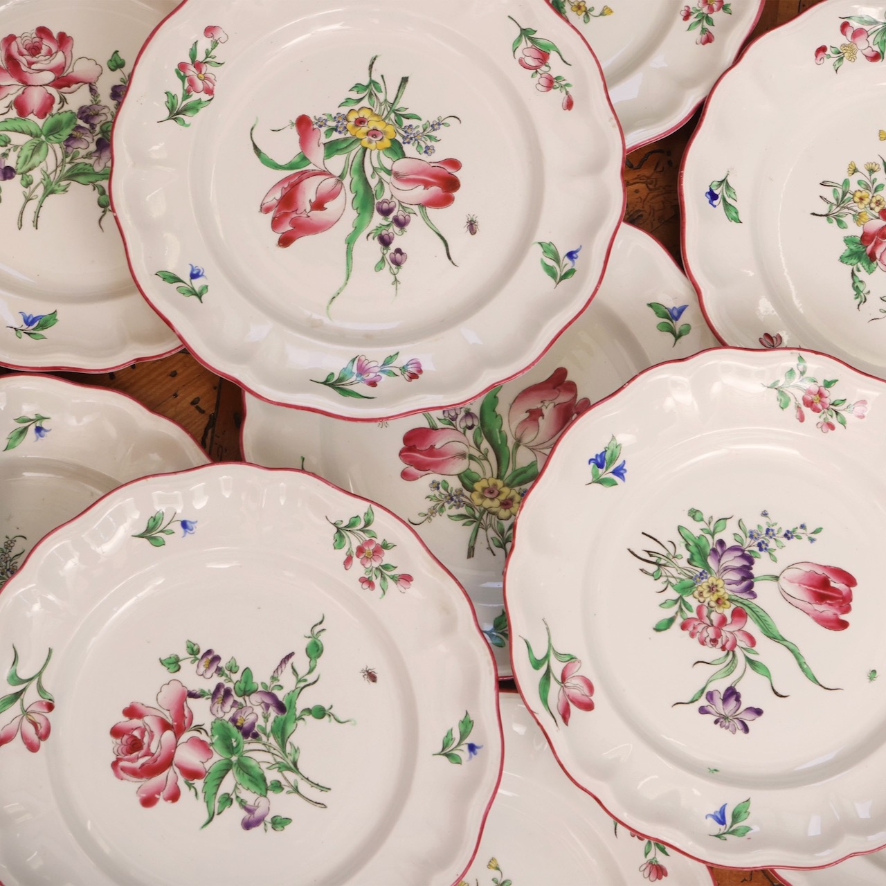 Servito piatti Luneville in terraglia, decoro floreale policromo e bordo magenta. Francia, sec. XX