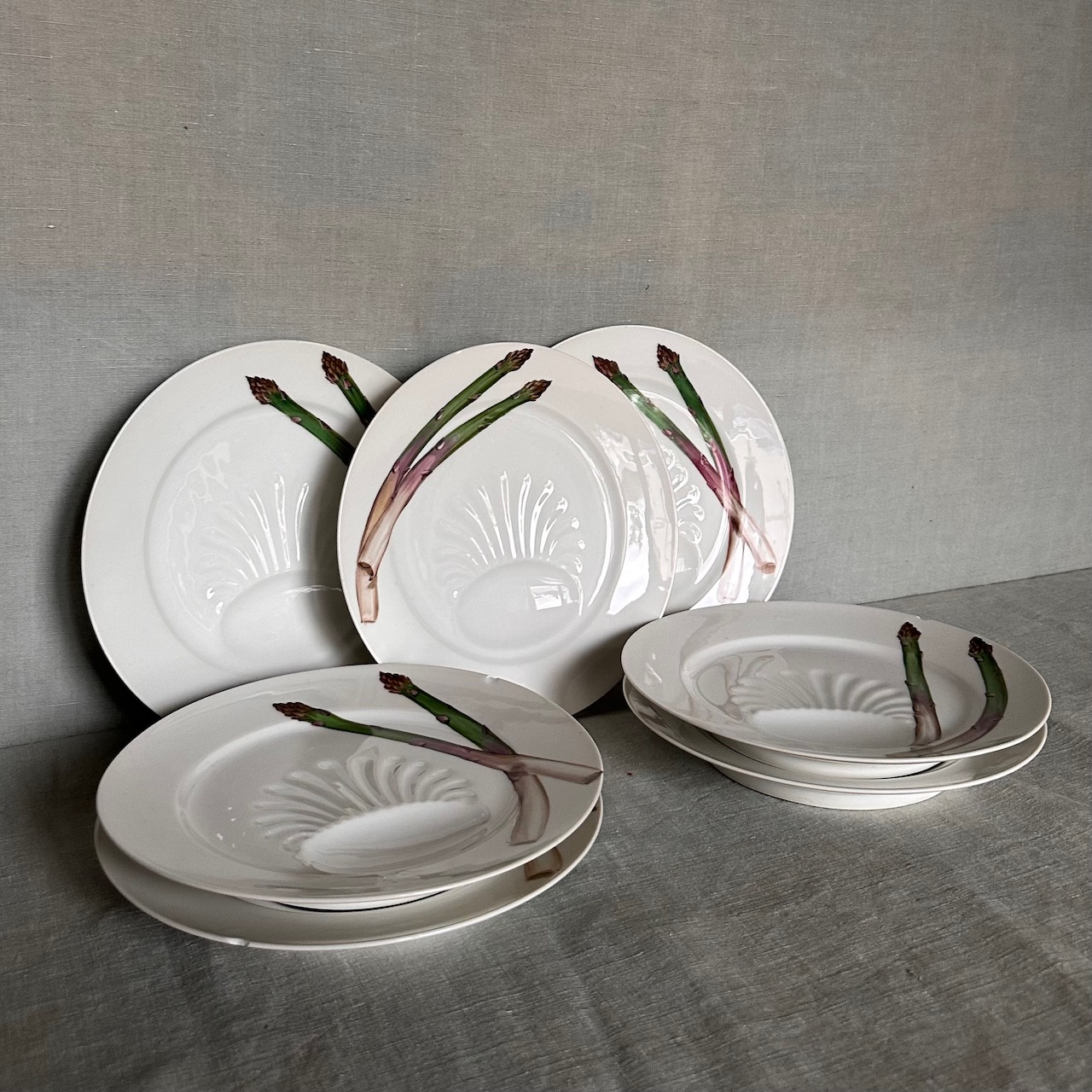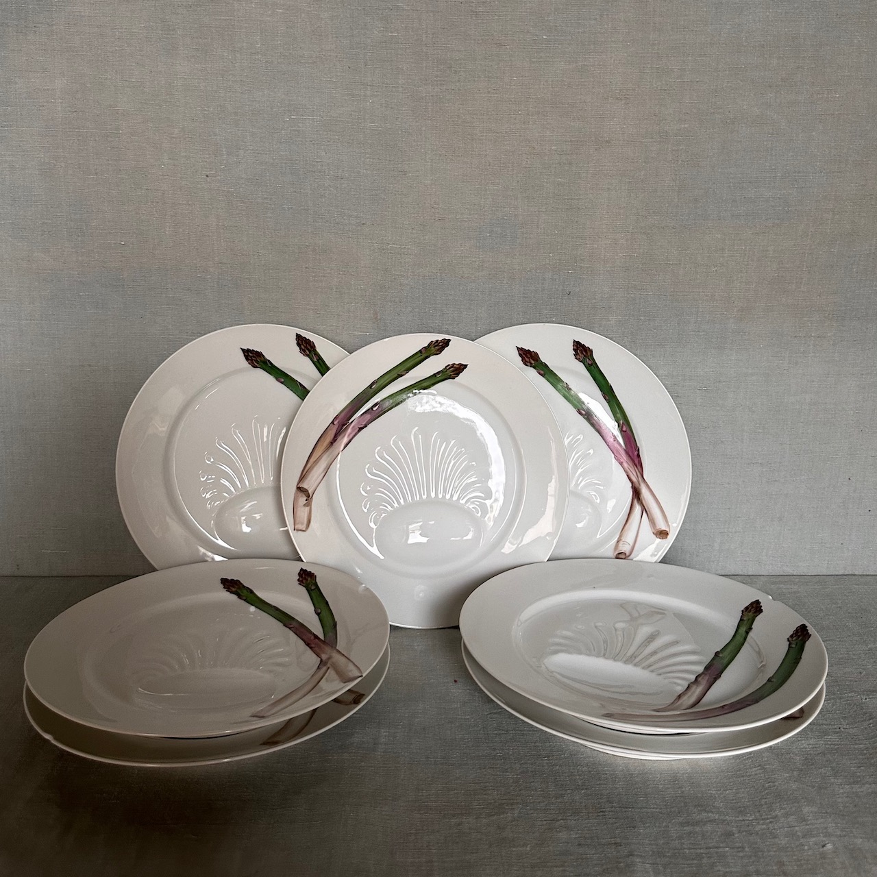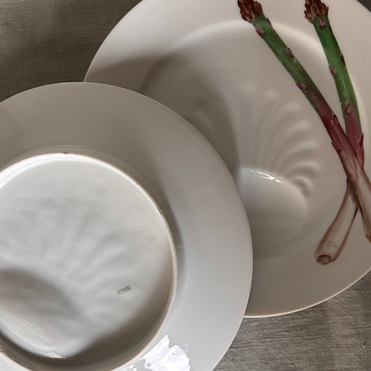 Set piatti per asparagi in porcellana bianca con decoro policromo, Doccia Manifattura Ginori. Italia, inizio sec. XX