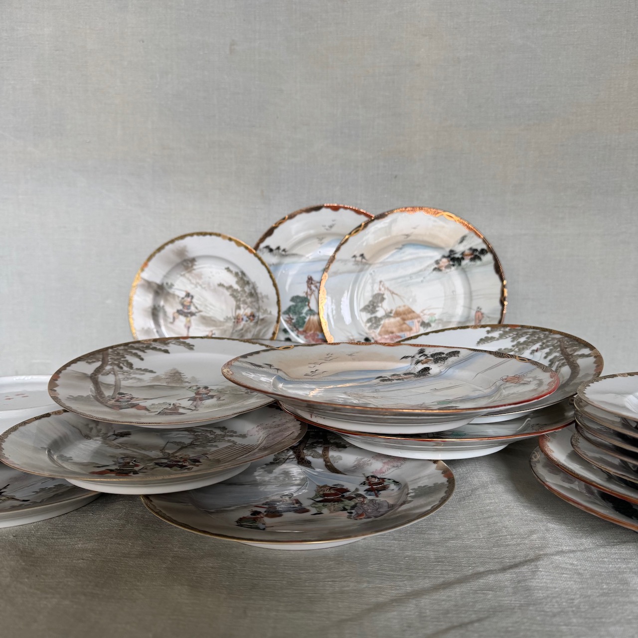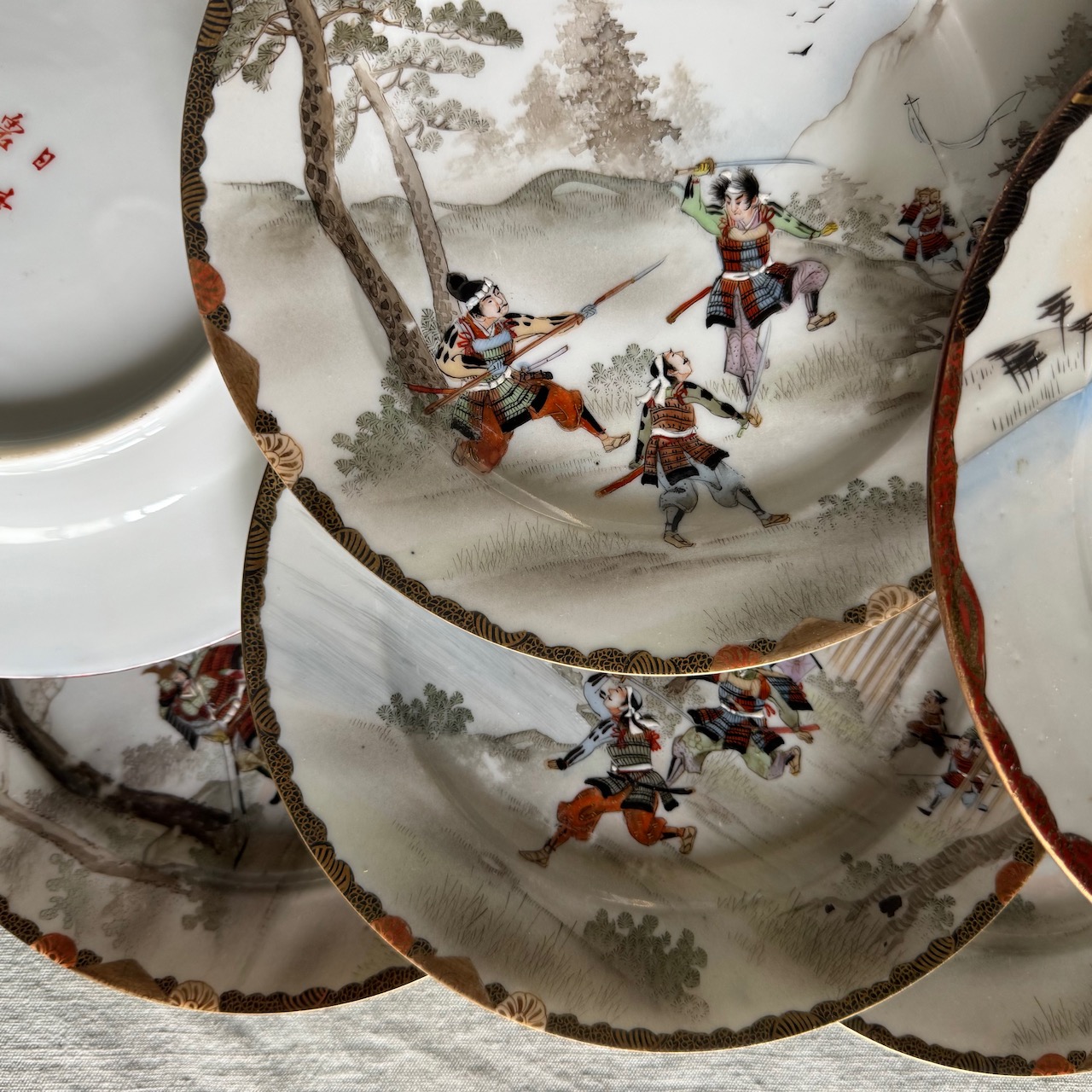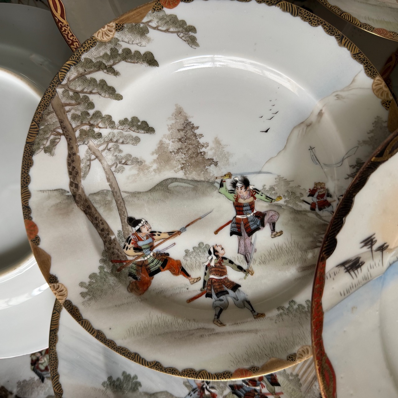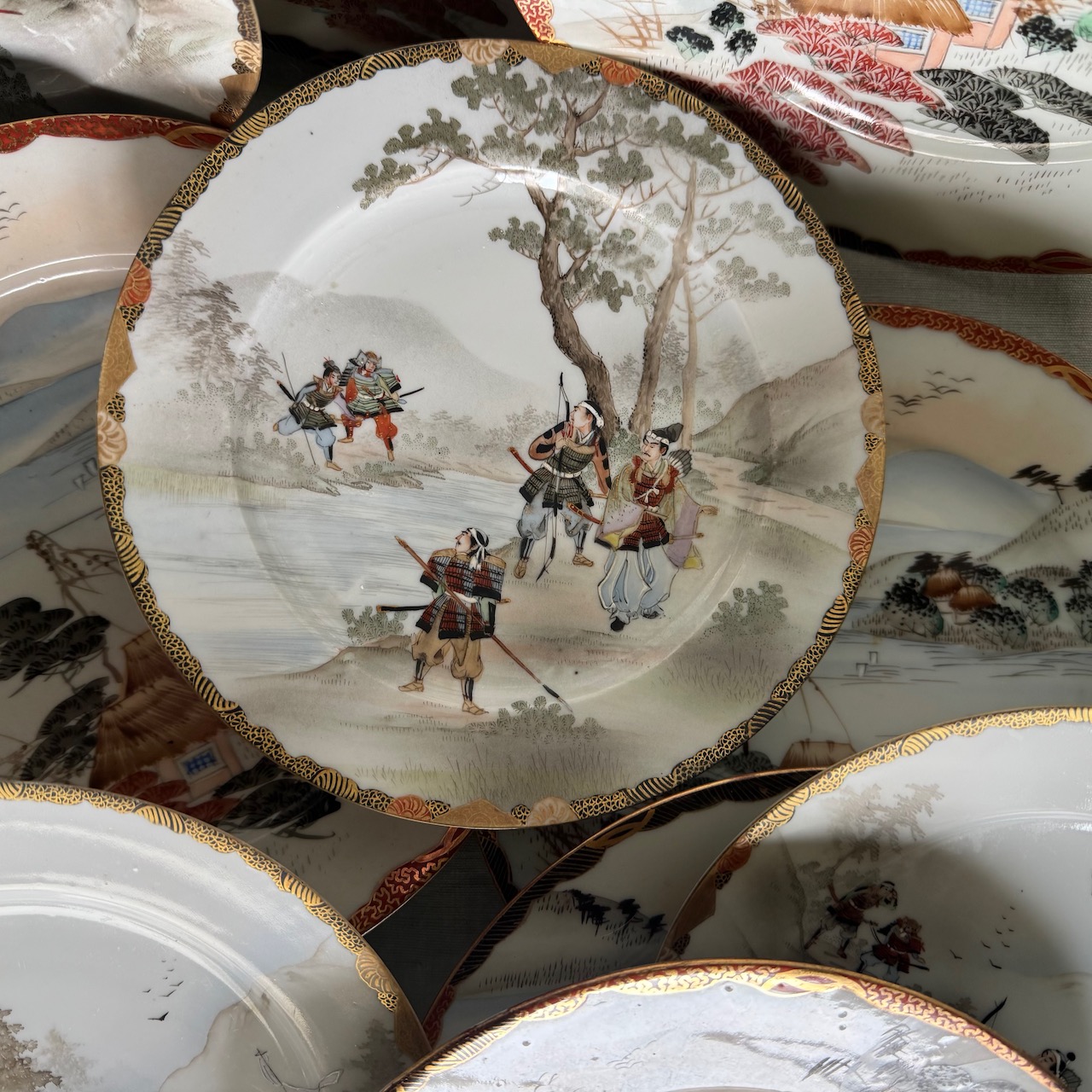 Dodici Piatti Samurai e dieci piatti Satsuma, in porcellana bianca dipinta a policromia e oro con figure e paesaggi, samurai. Giappone, sec. XIX
