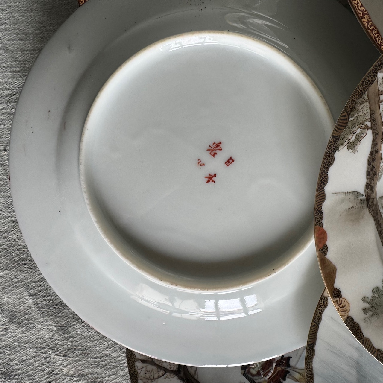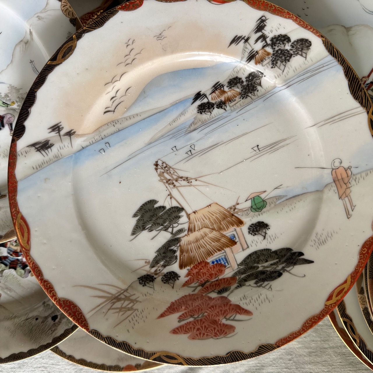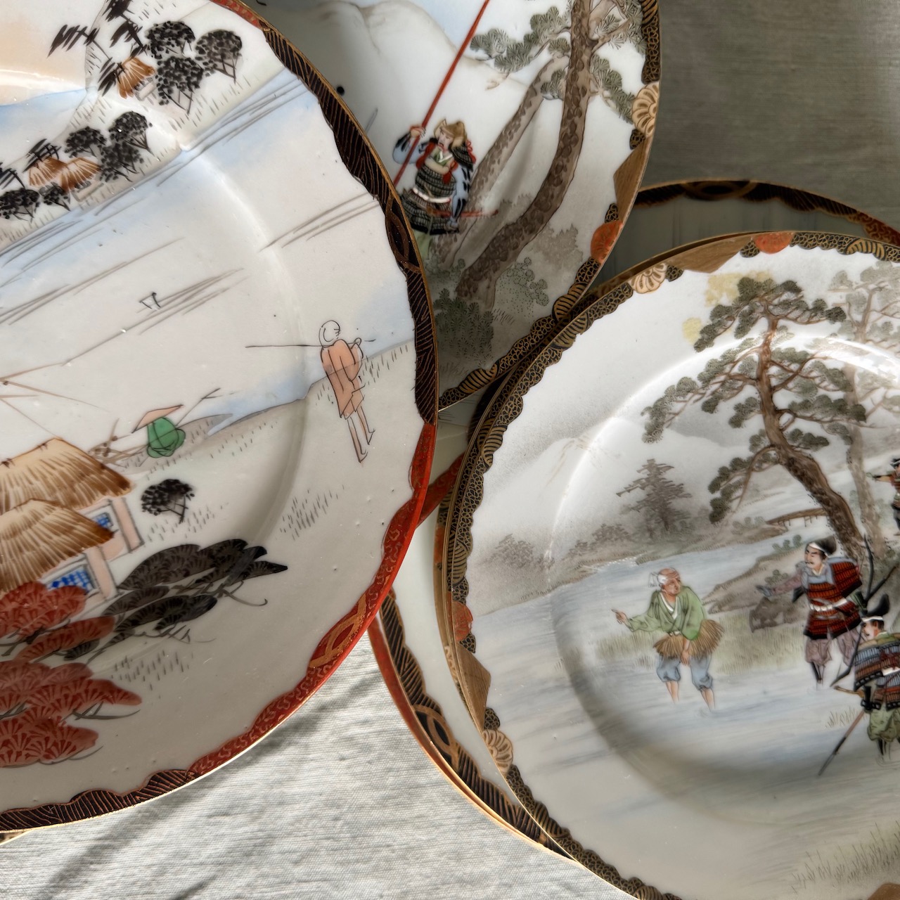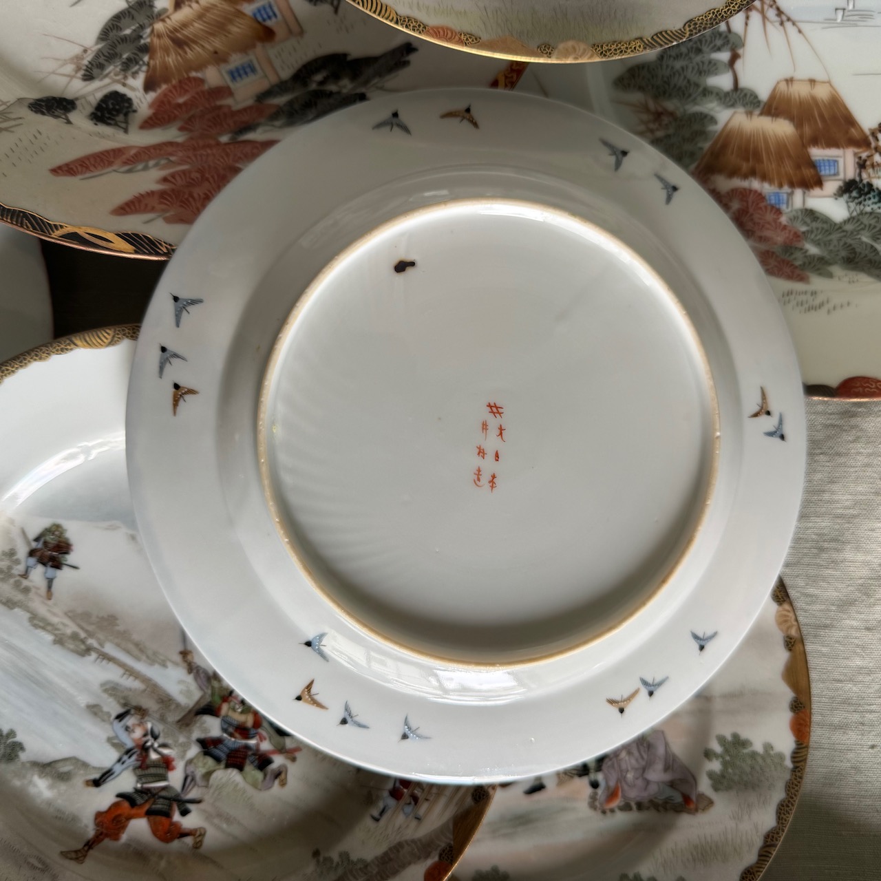 Dodici Piatti Samurai e dieci piatti Satsuma, in porcellana bianca dipinta a policromia e oro con figure e paesaggi, samurai. Giappone, sec. XIX