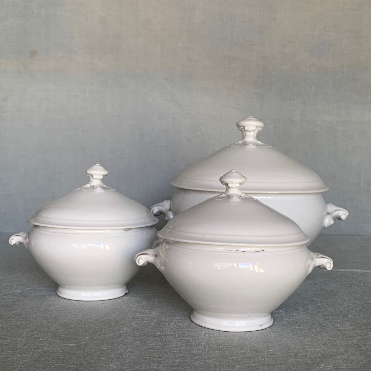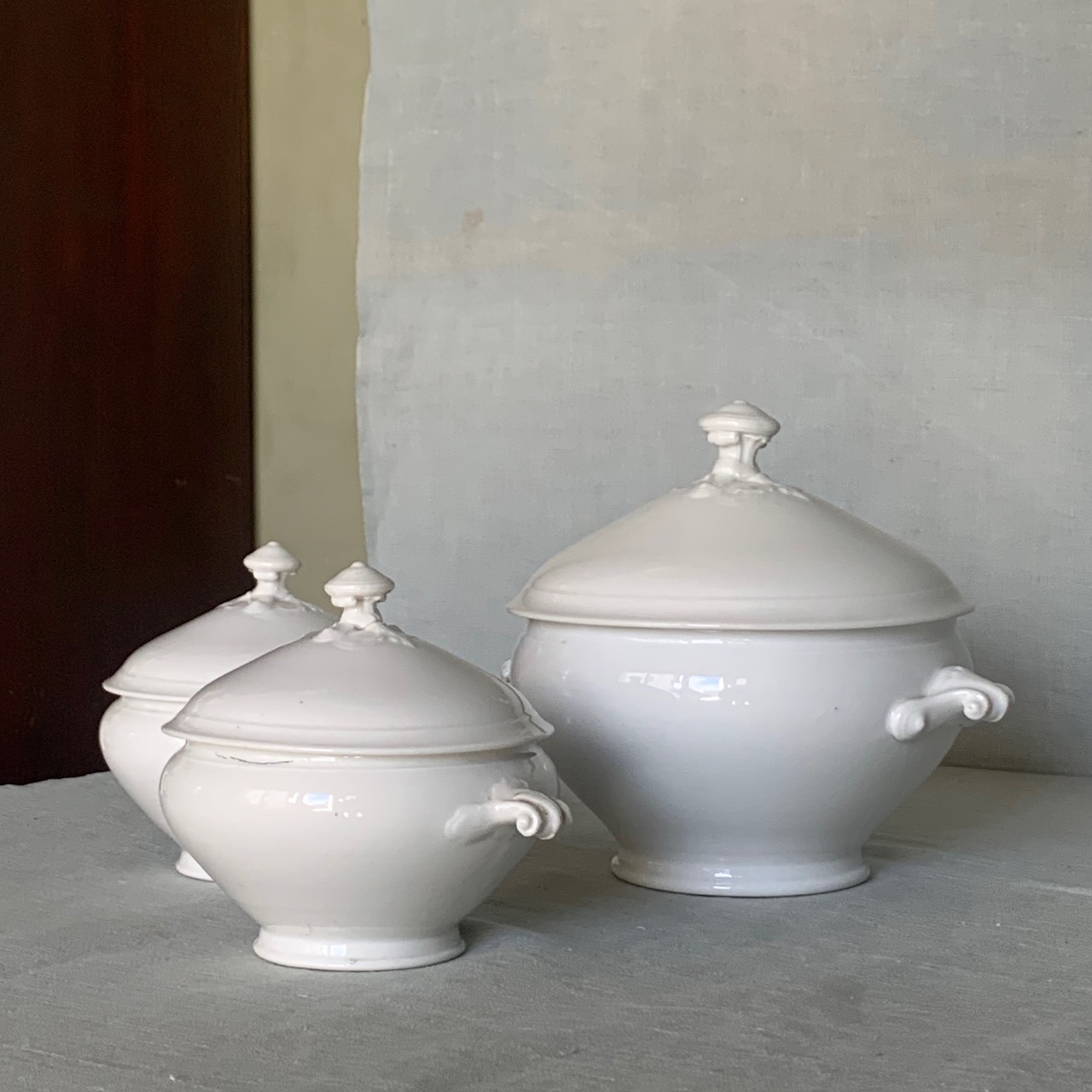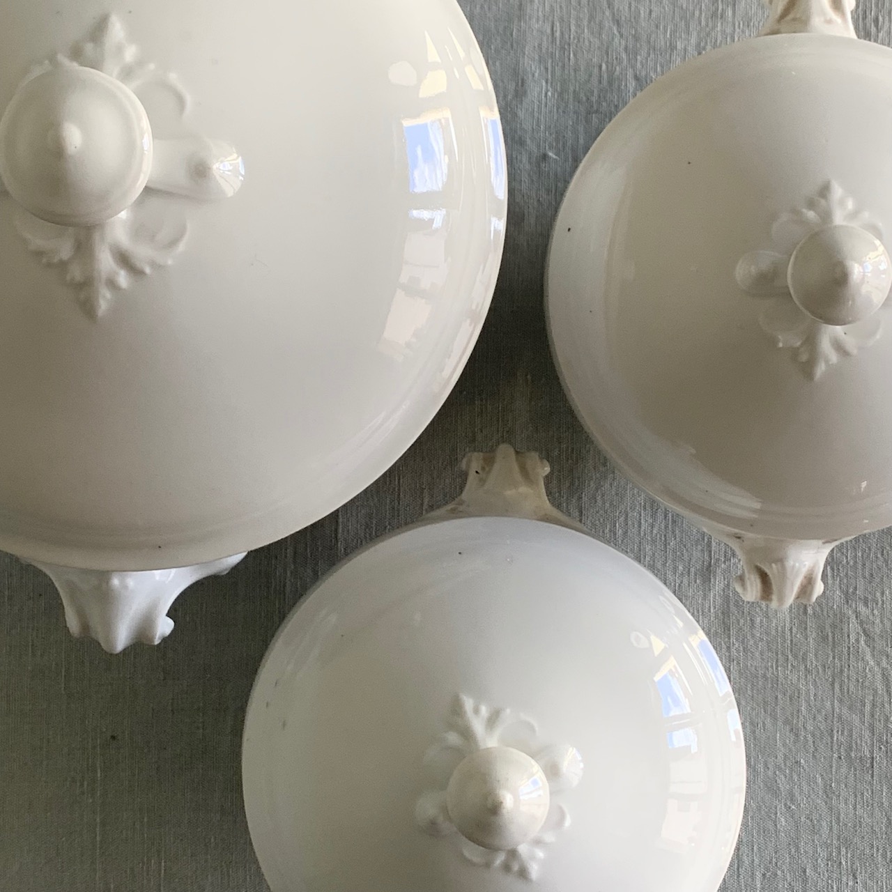 Tre zuppiere in maiolica bianca con prese a melograno, Ginori. Italia, sec. XIX