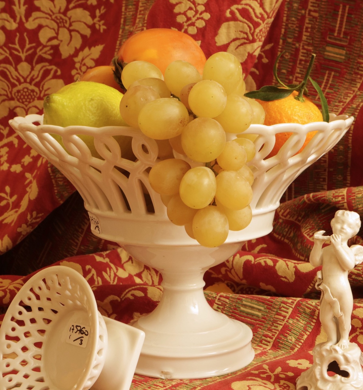 Alzata centrotavola in porcellana traforata, con motivo a grata. Italia, sec. XIX