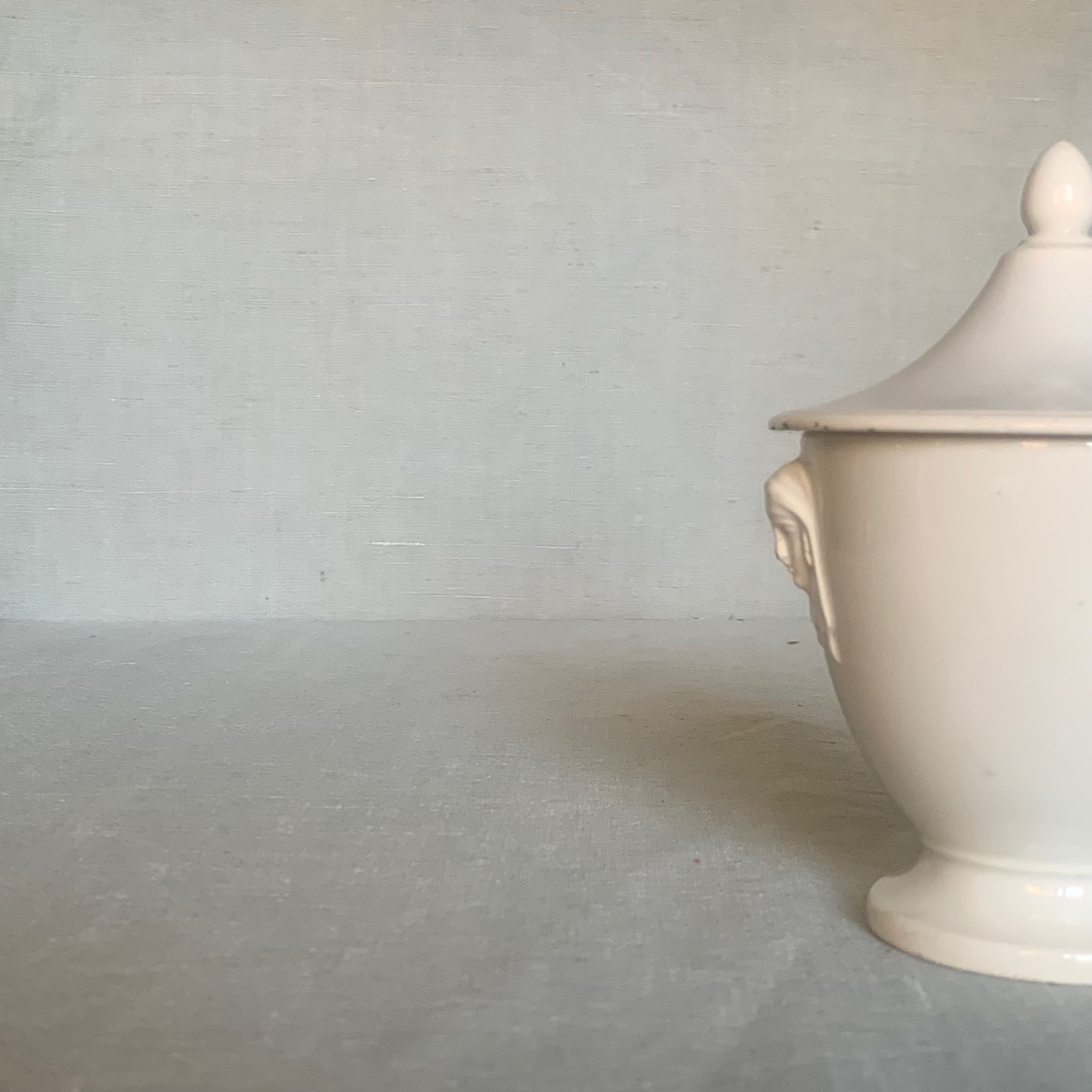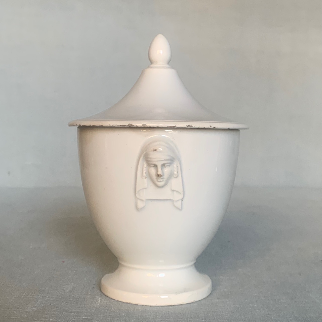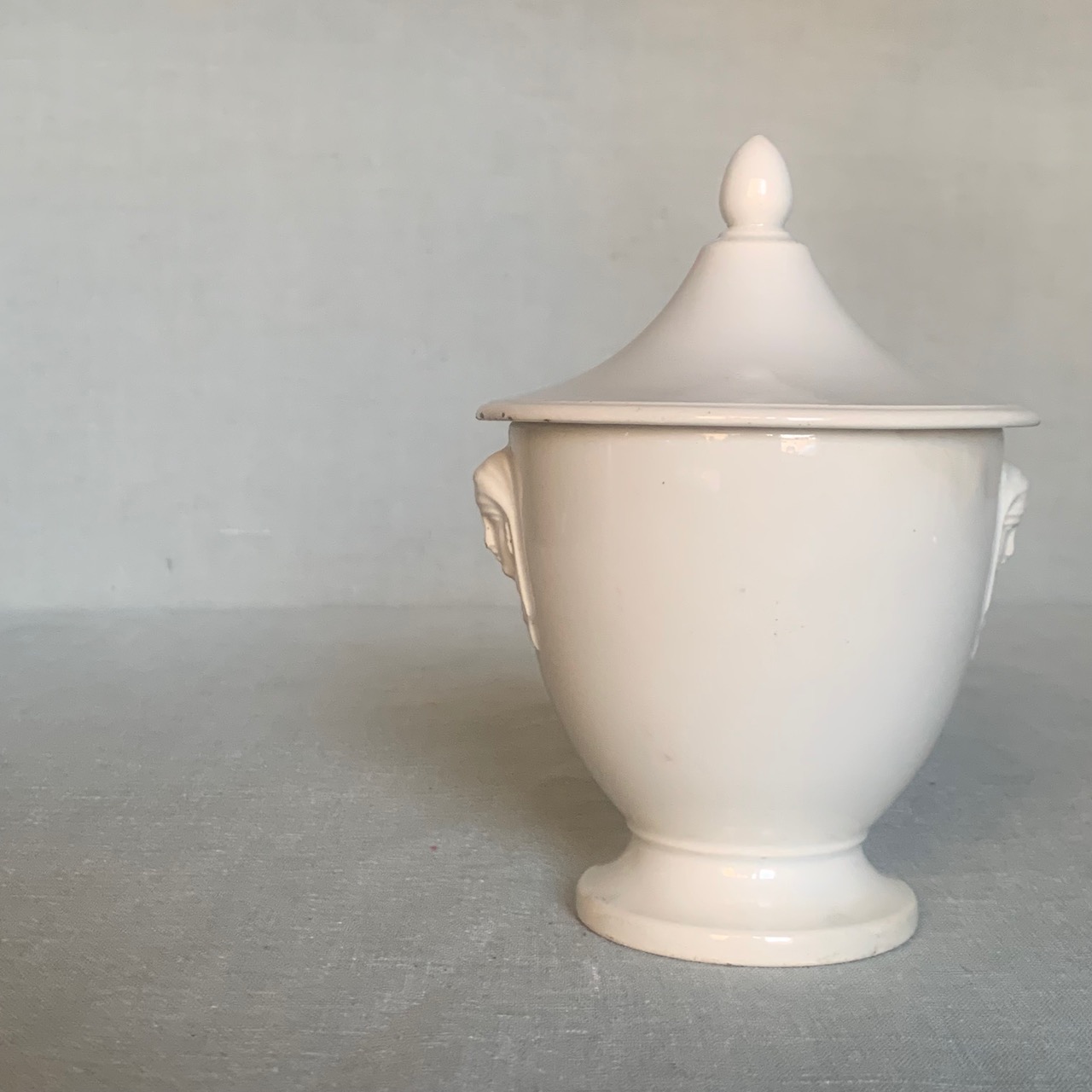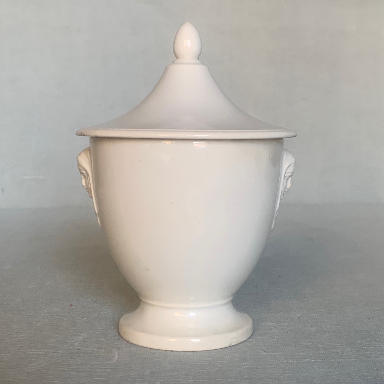 Potiche ad urna in terracotta smaltata bianca, laterali con teste di leoni. Italia, sec. XIX