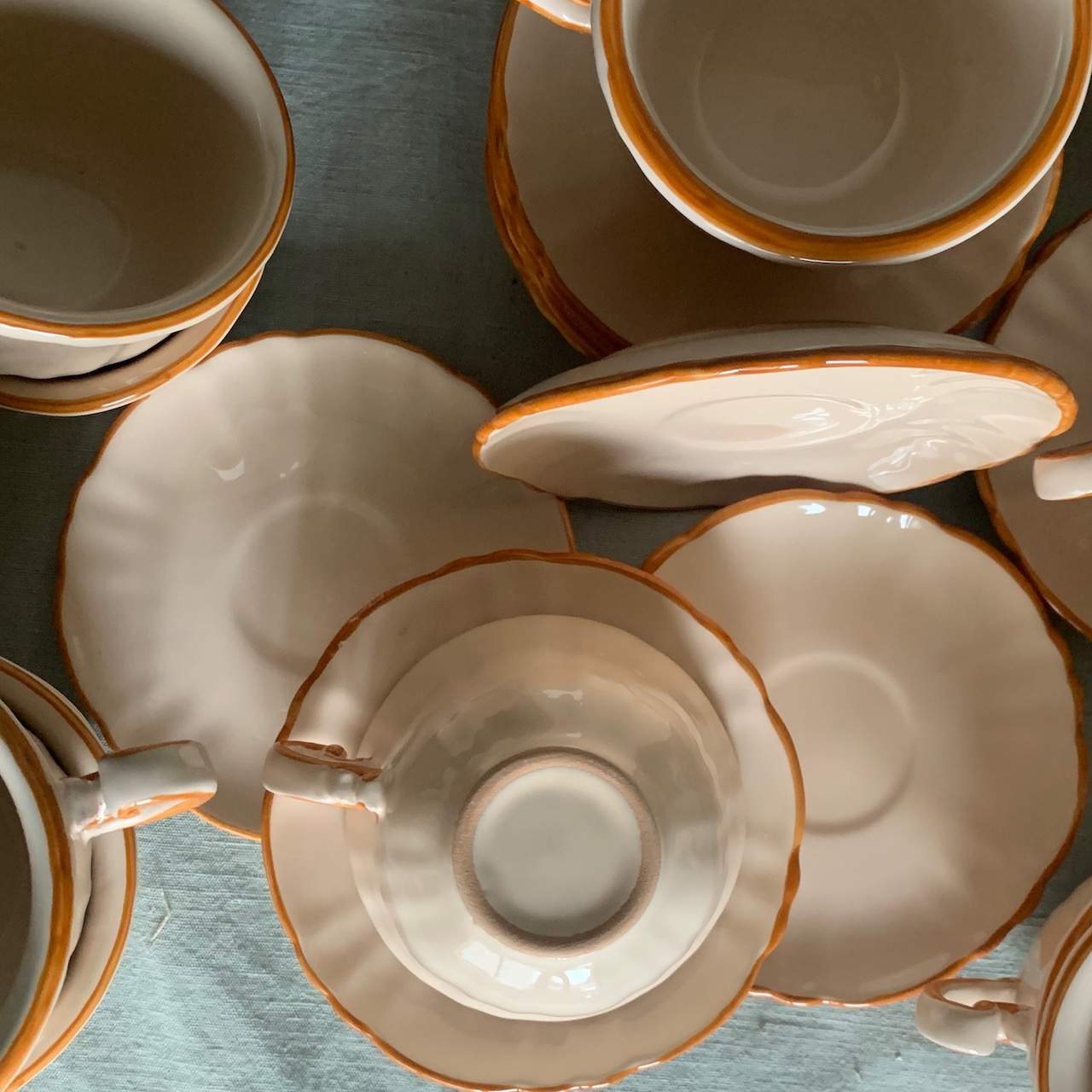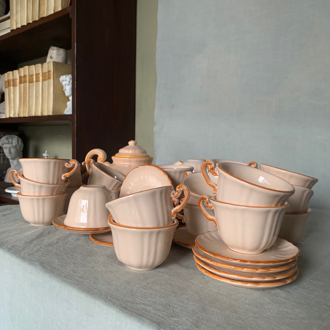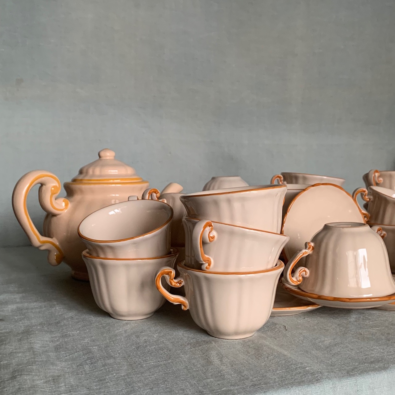 Servito da tè incarnato, in maiolica smaltata, disponibile in sette colori diversi. Collebi, Toscana