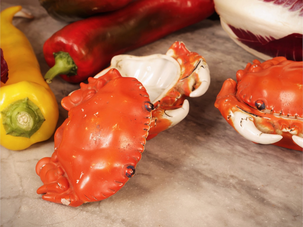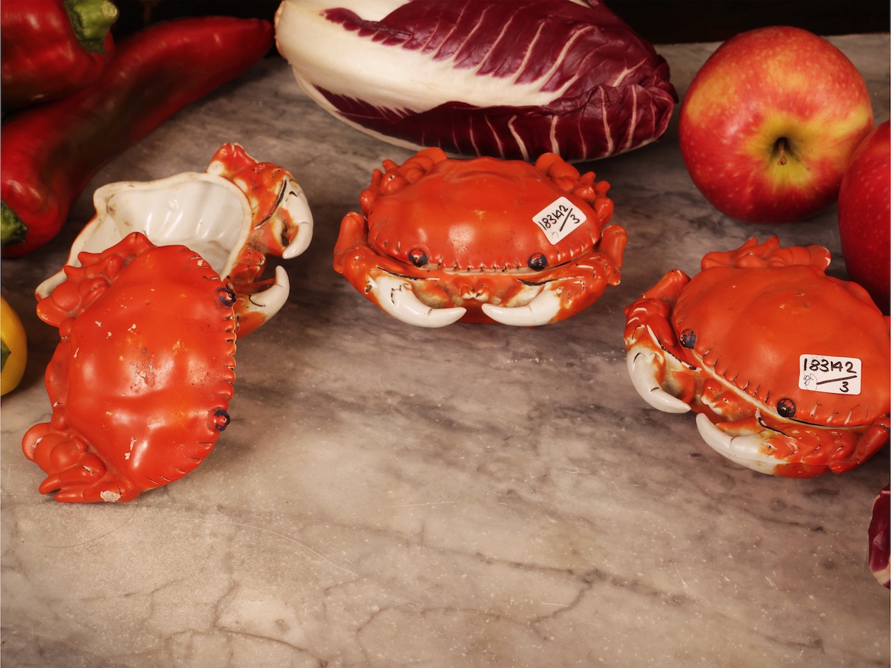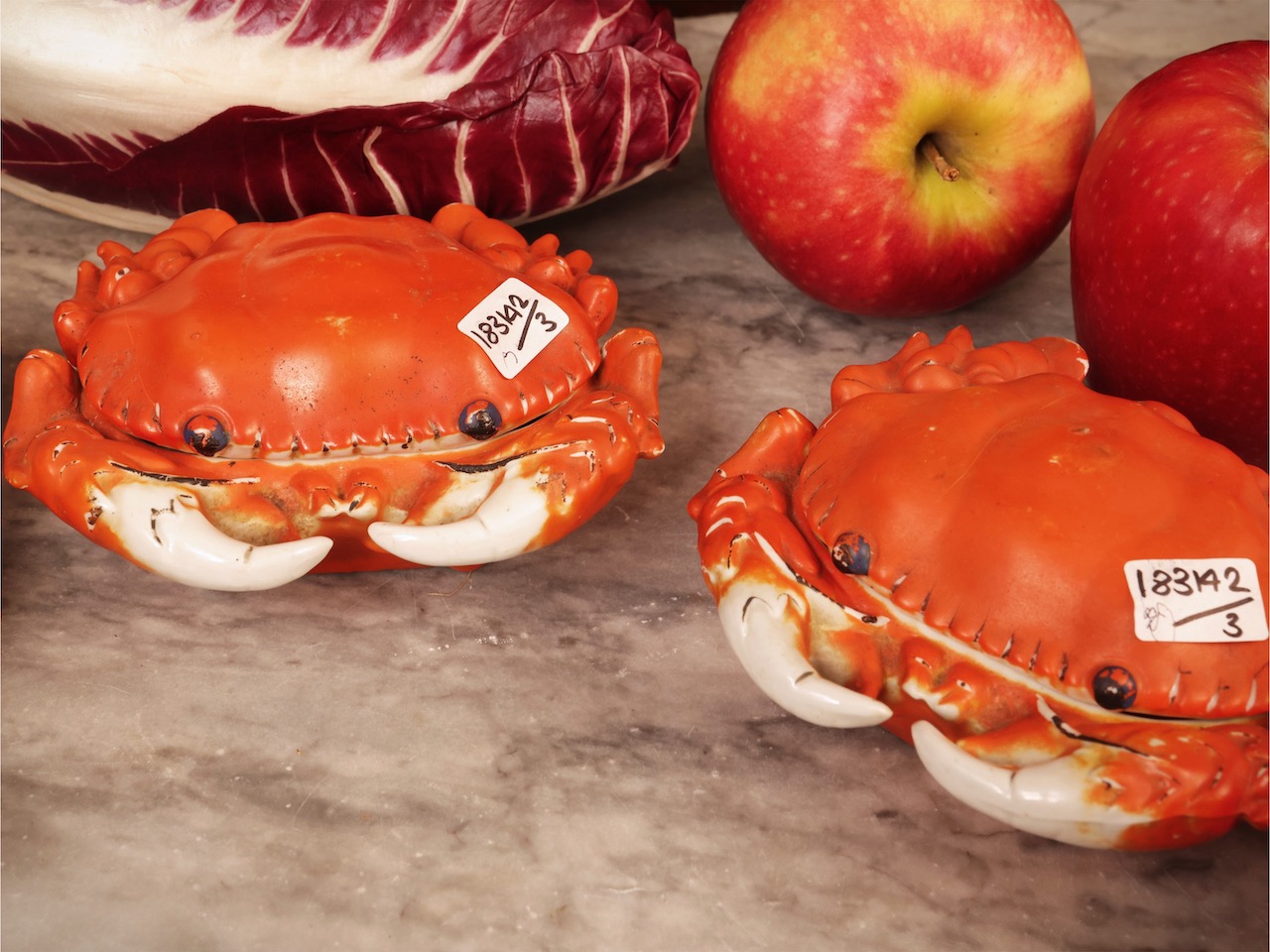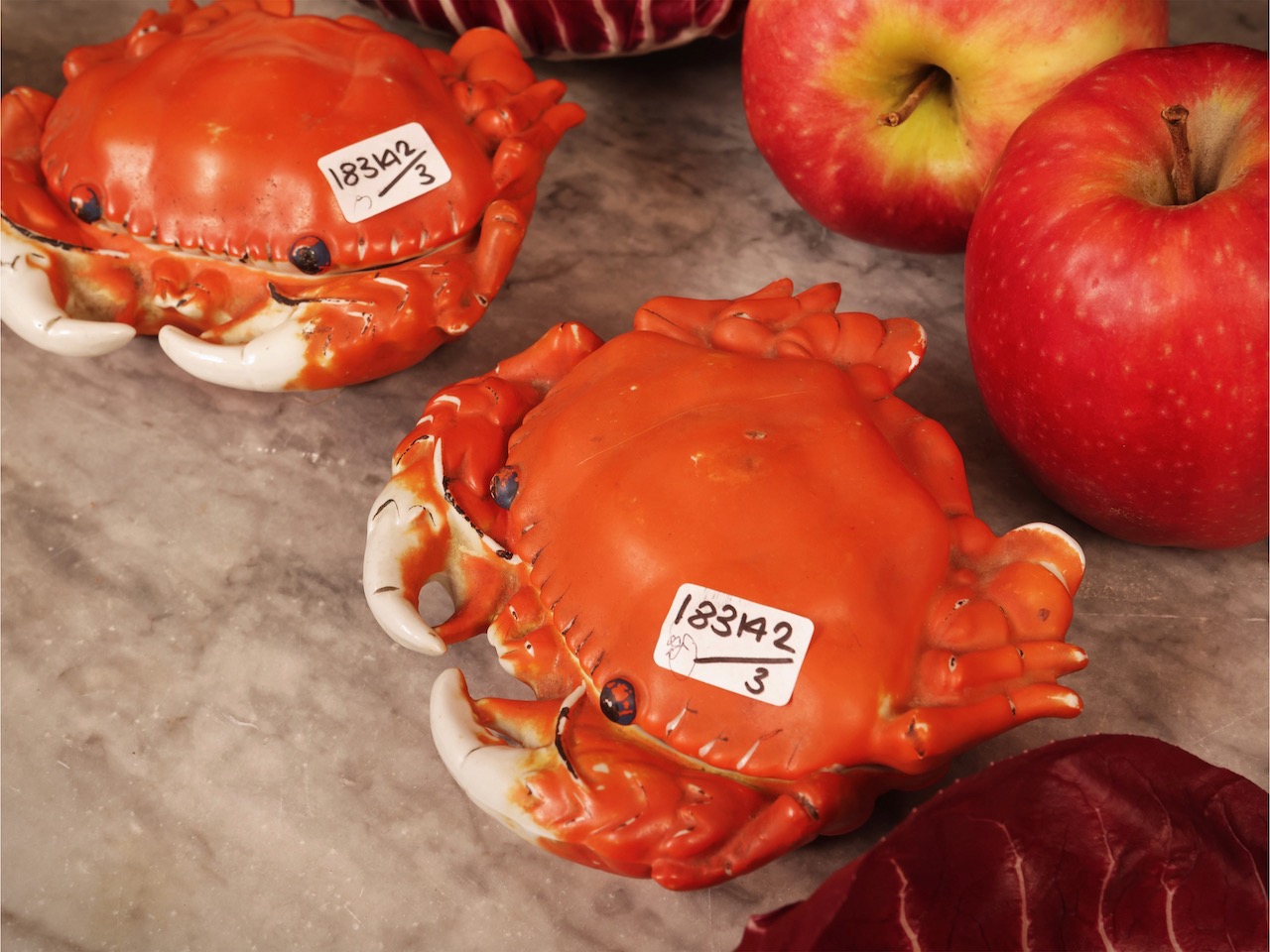 Set portapatè in porcellana smaltata, a foggia di granchio. Italia, sec. XX