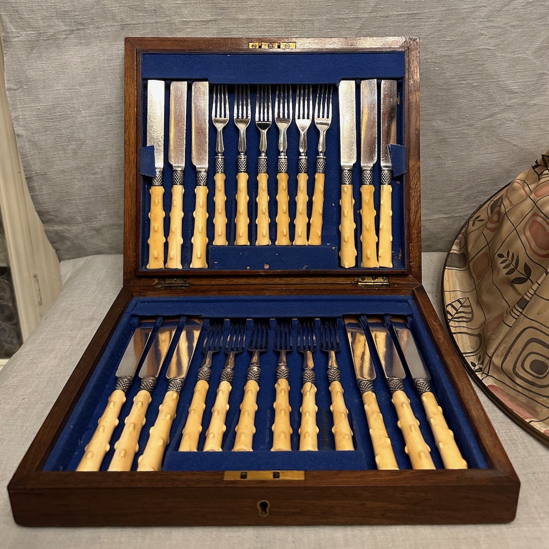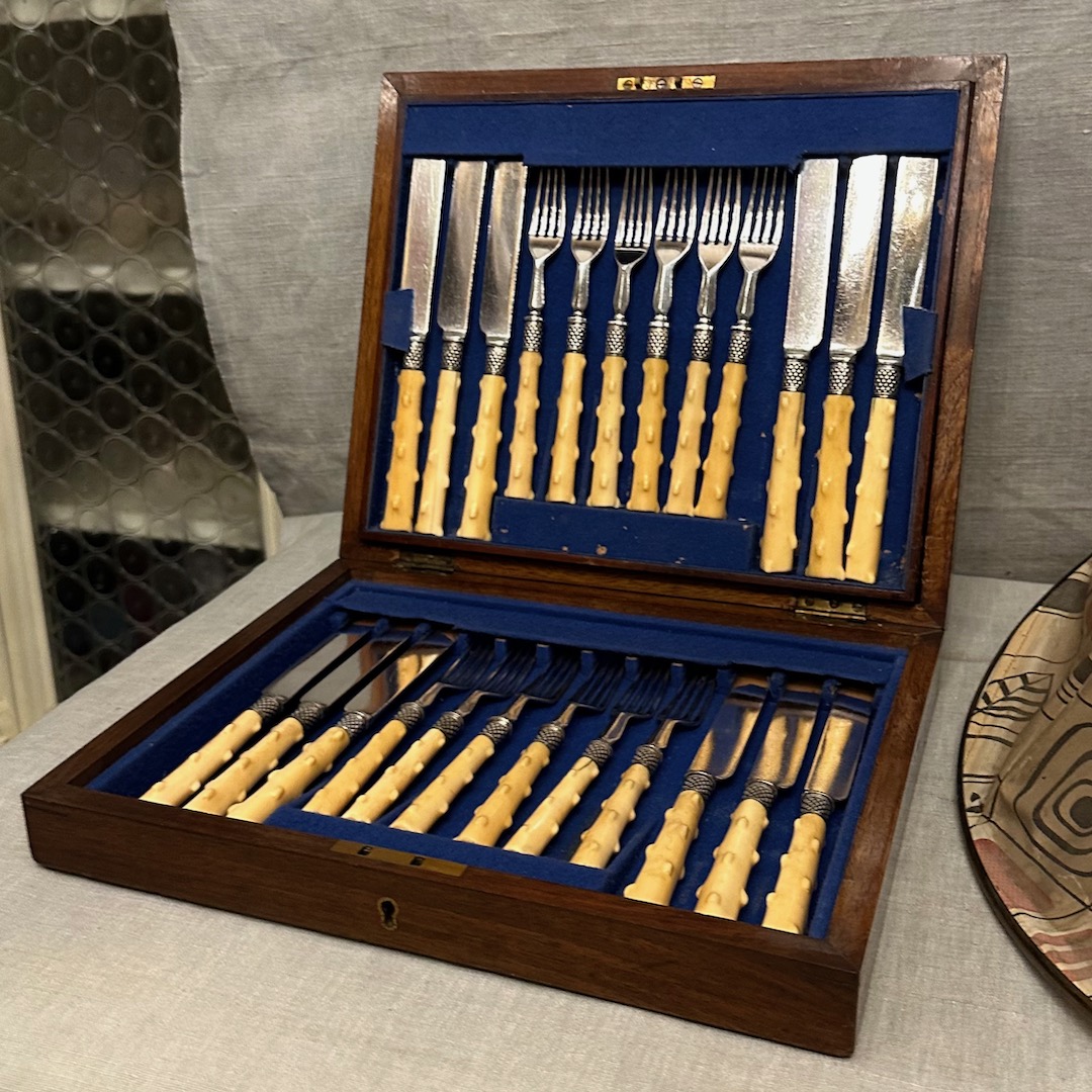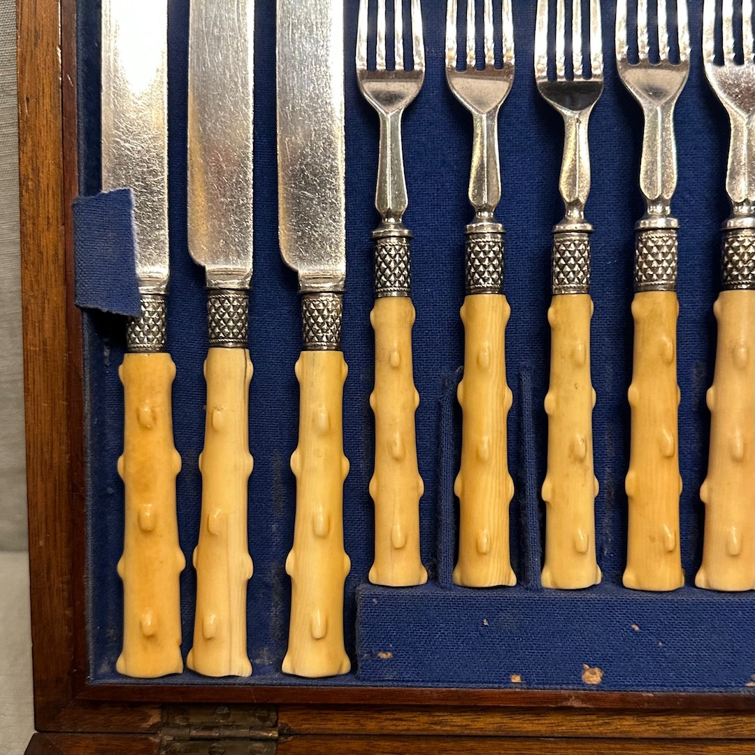 Servito di posate in argento con manici in avorio modellati a rametto, completo per dodici persone, entro sua scatola in radica di tuia. Inghilterra, metà sec. XIX