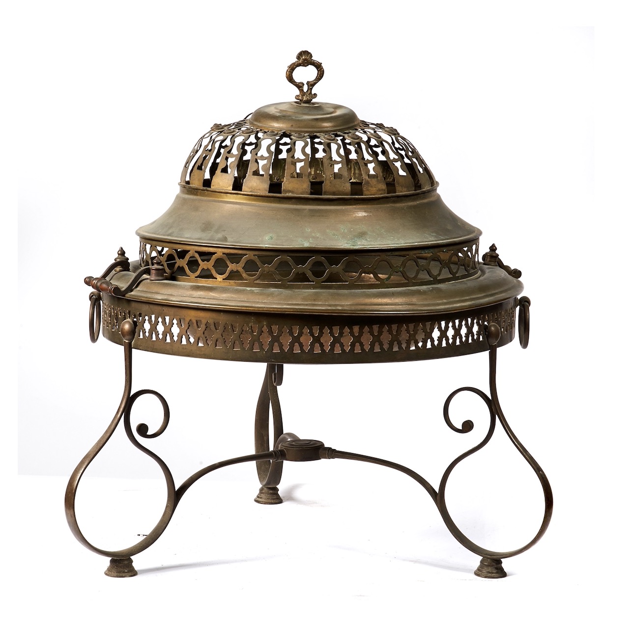 Braciere in bronzo dorato, base a tre sostegni a voluta, fascia e coperchio traforati. Italia, sec. XIX