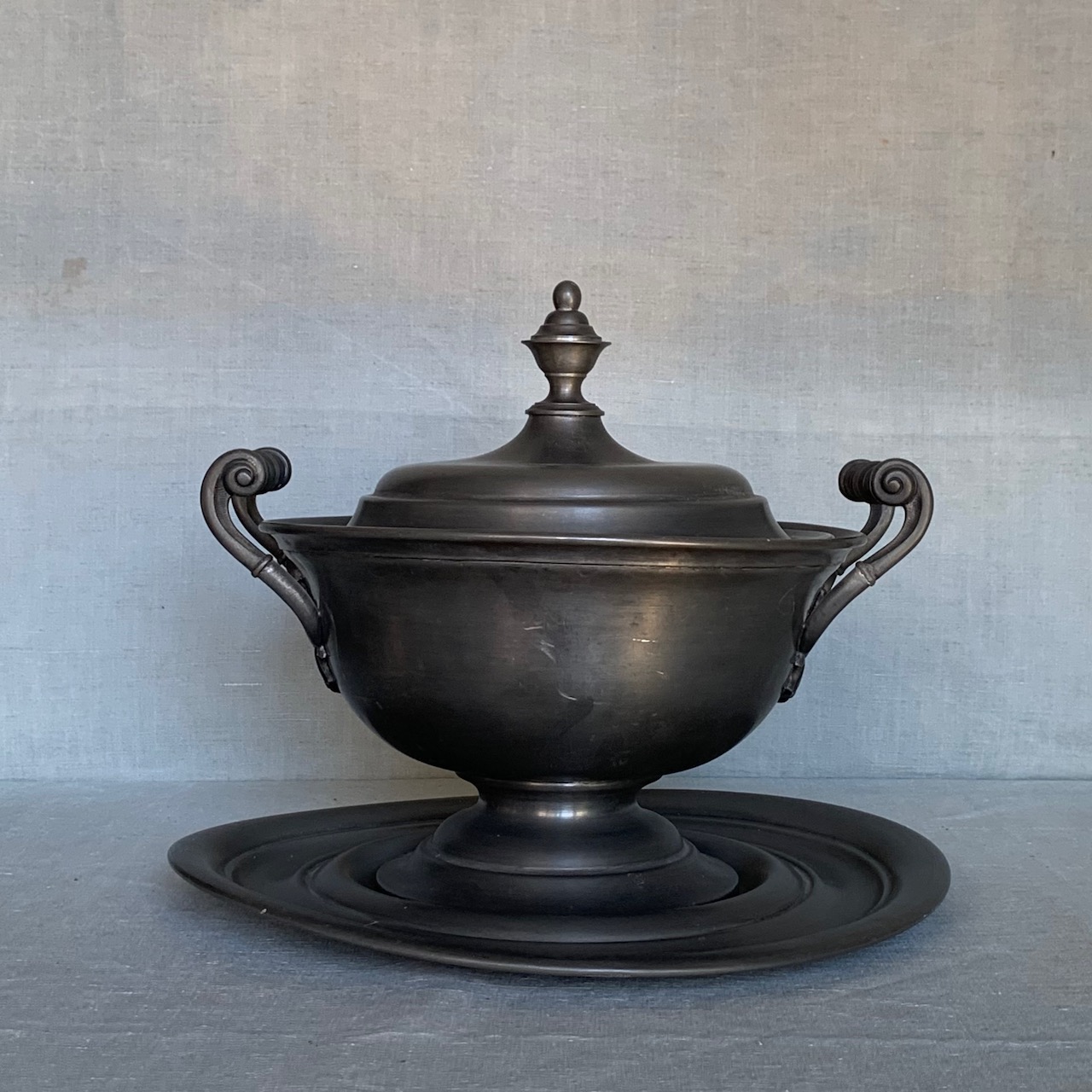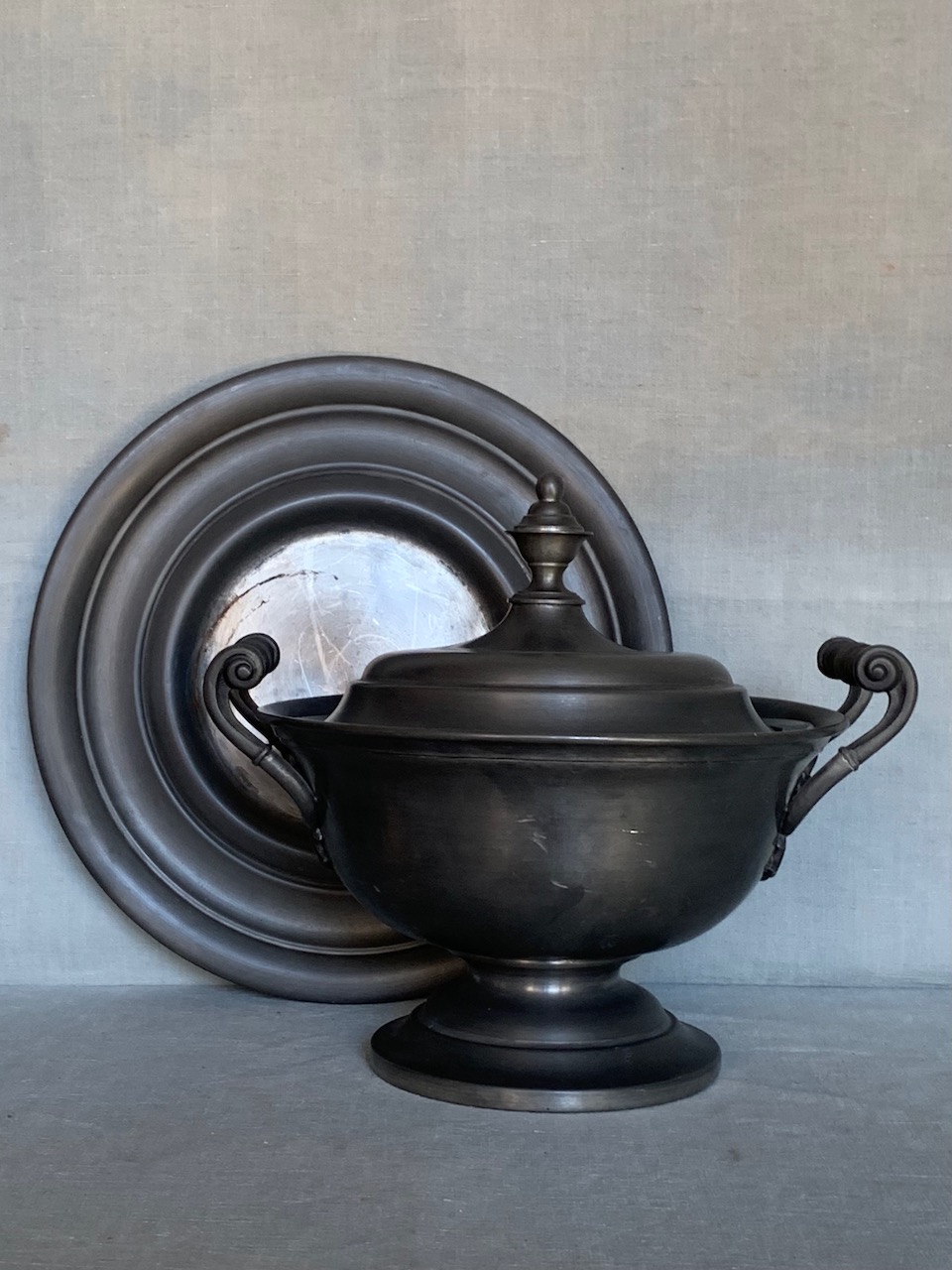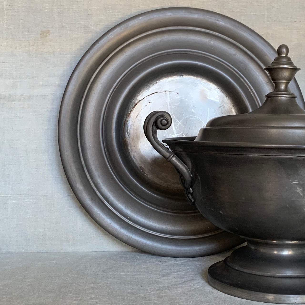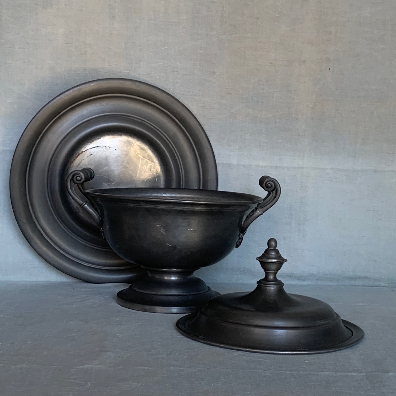Grande zuppiera in peltro, con anse a ricciolo, coperchio e vassoio, Metalars. Italia, sec. XIX