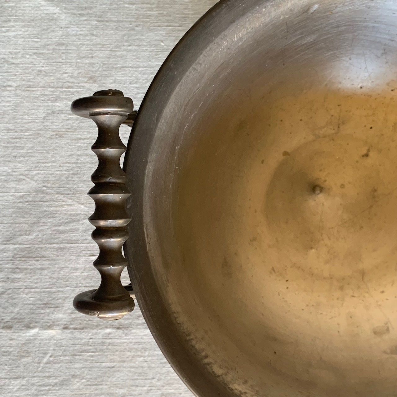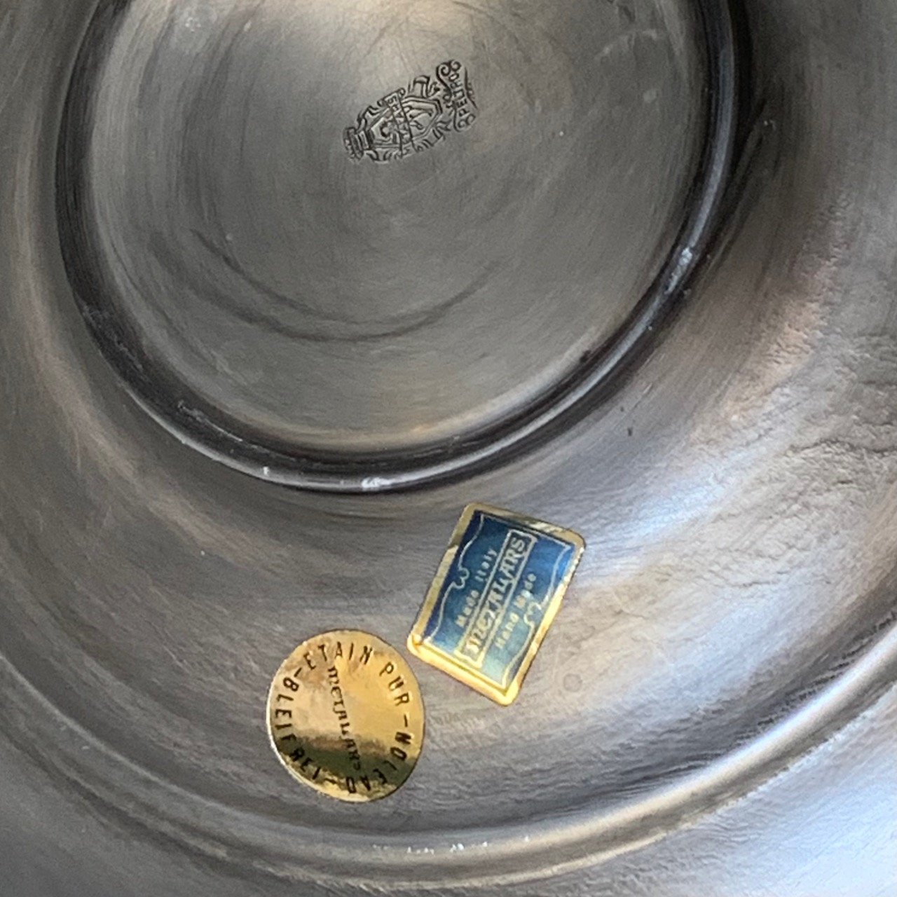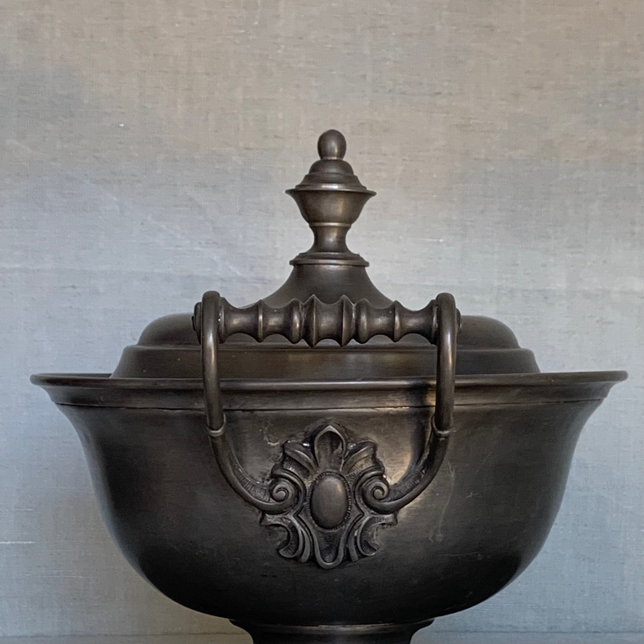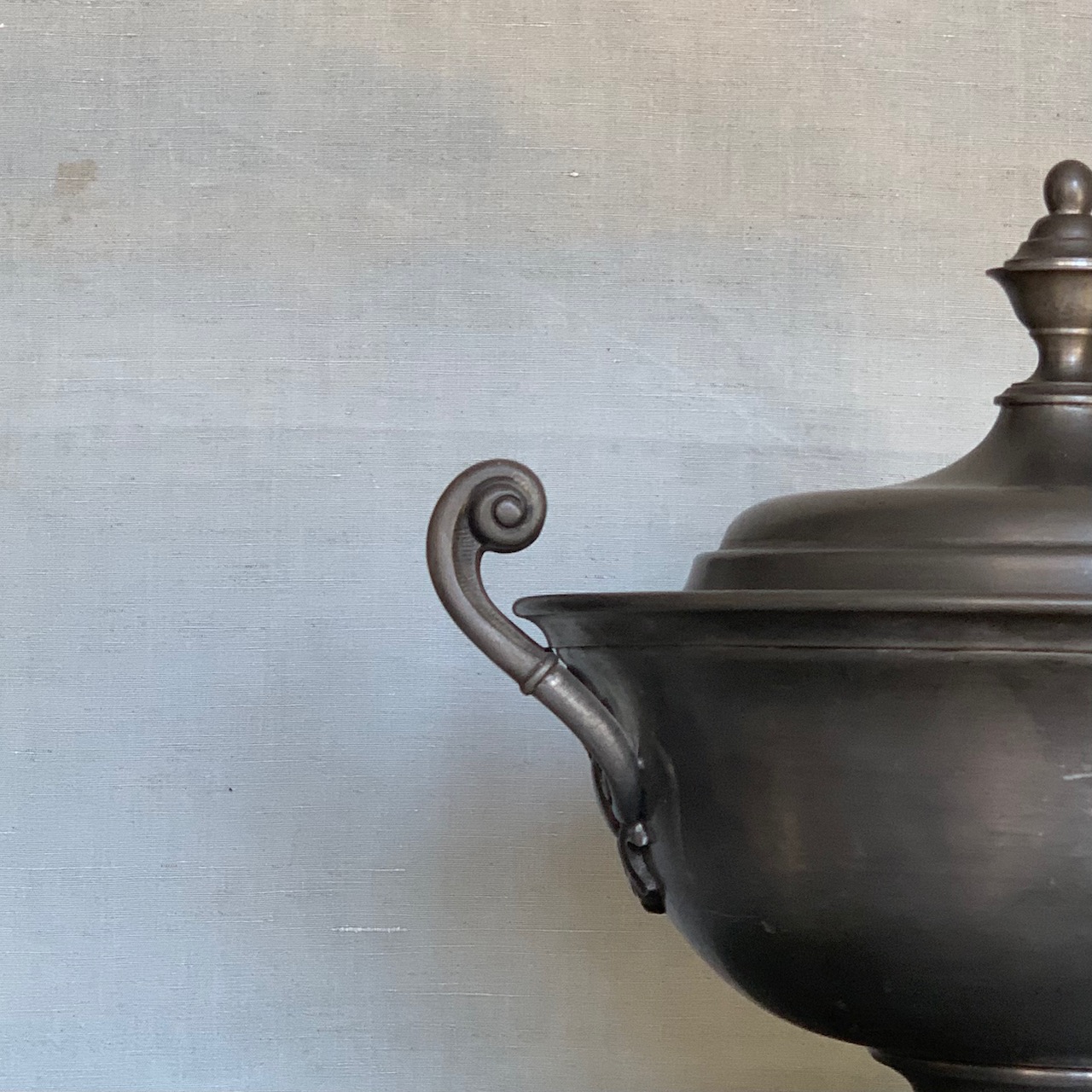 Grande zuppiera in peltro, con anse a ricciolo, coperchio e vassoio, Metalars. Italia, sec. XIX