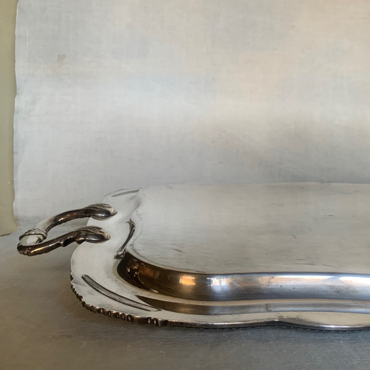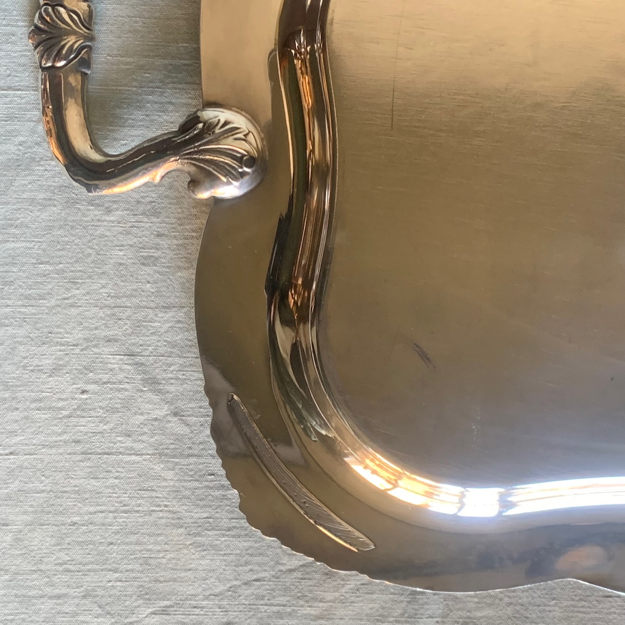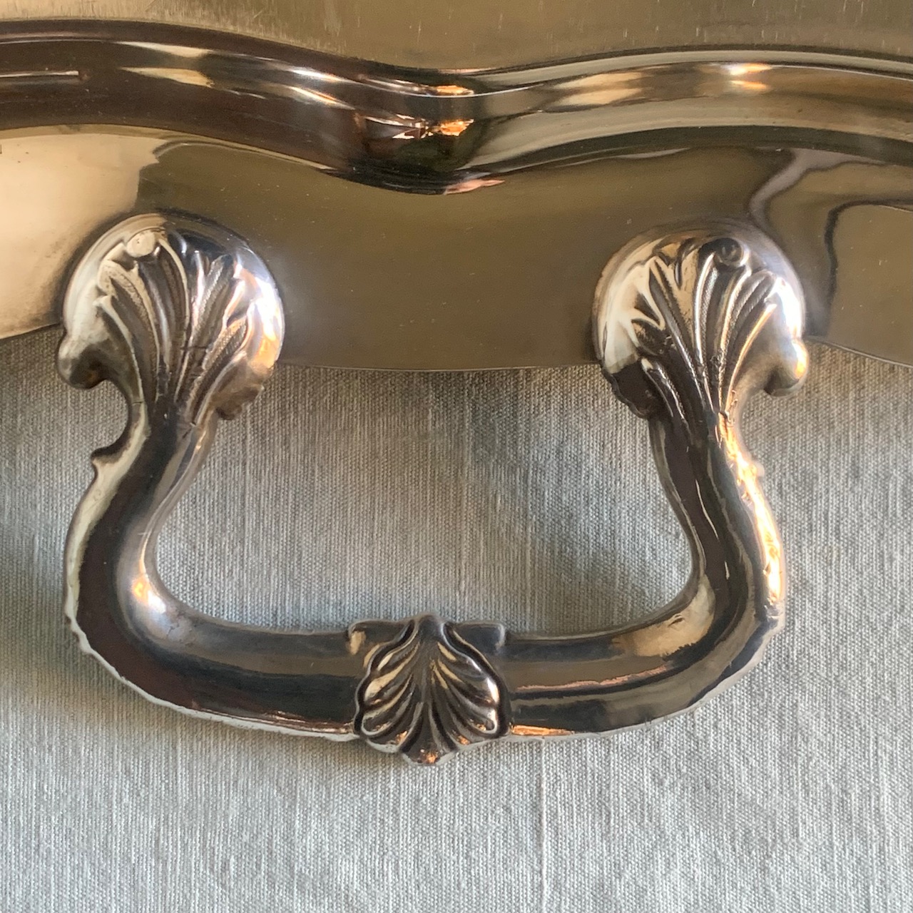 Grande vassoio argento su rame, decorato a volute vegetali, anse a conchiglia. Inghilterra, fine sec. XIX