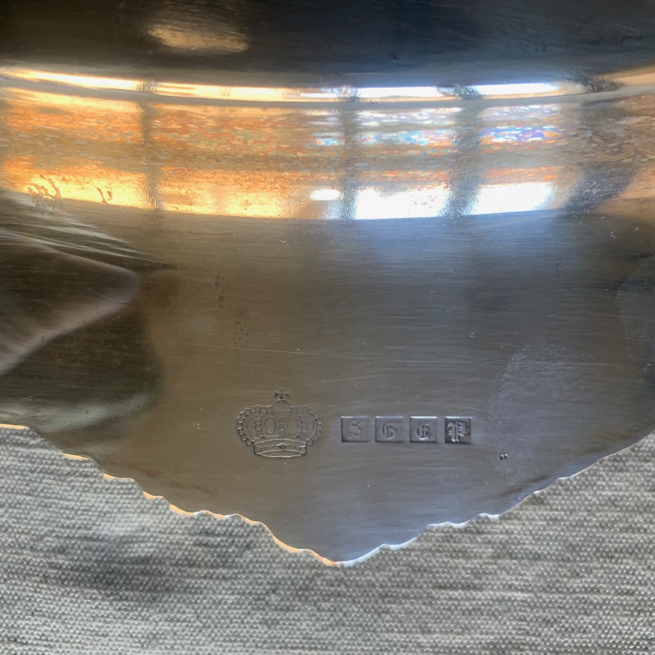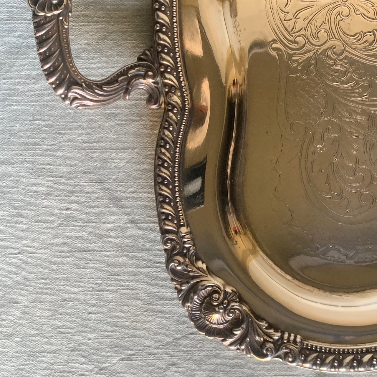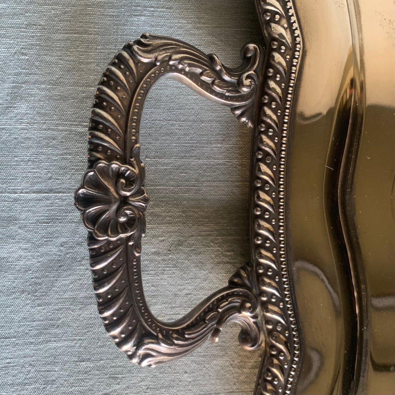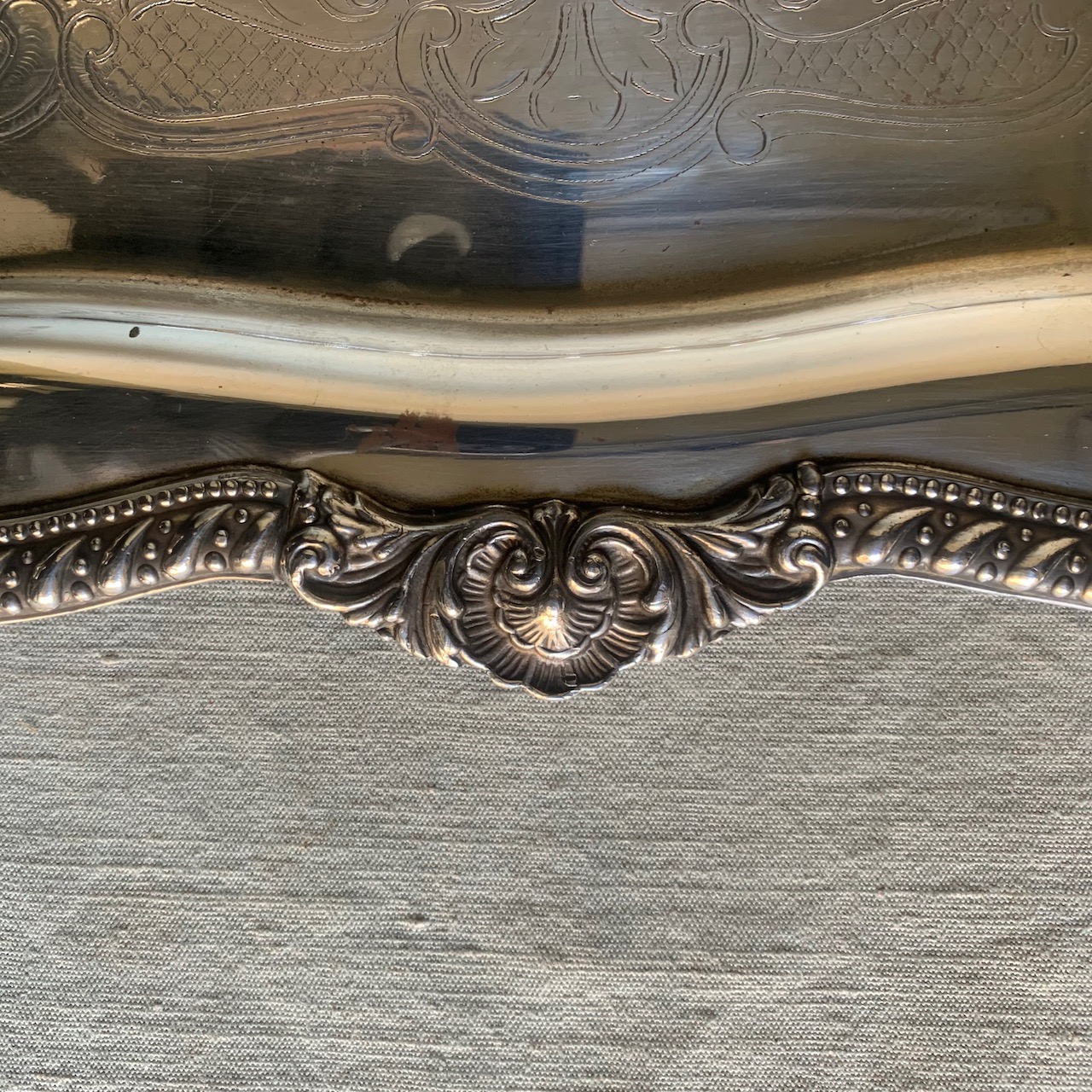 Grande vassoio argento su rame, decorato a volute vegetali, anse a conchiglia. Inghilterra, fine sec. XIX