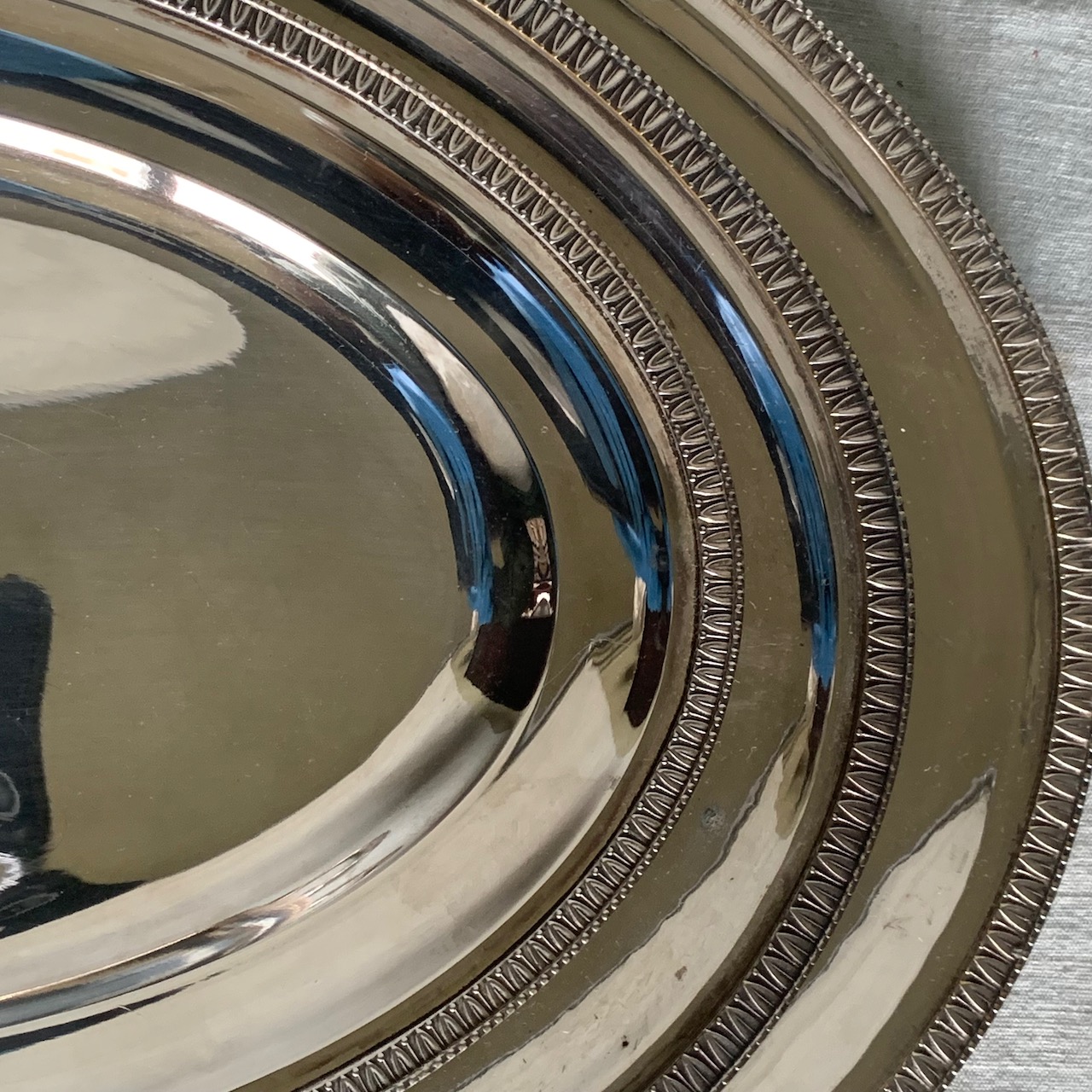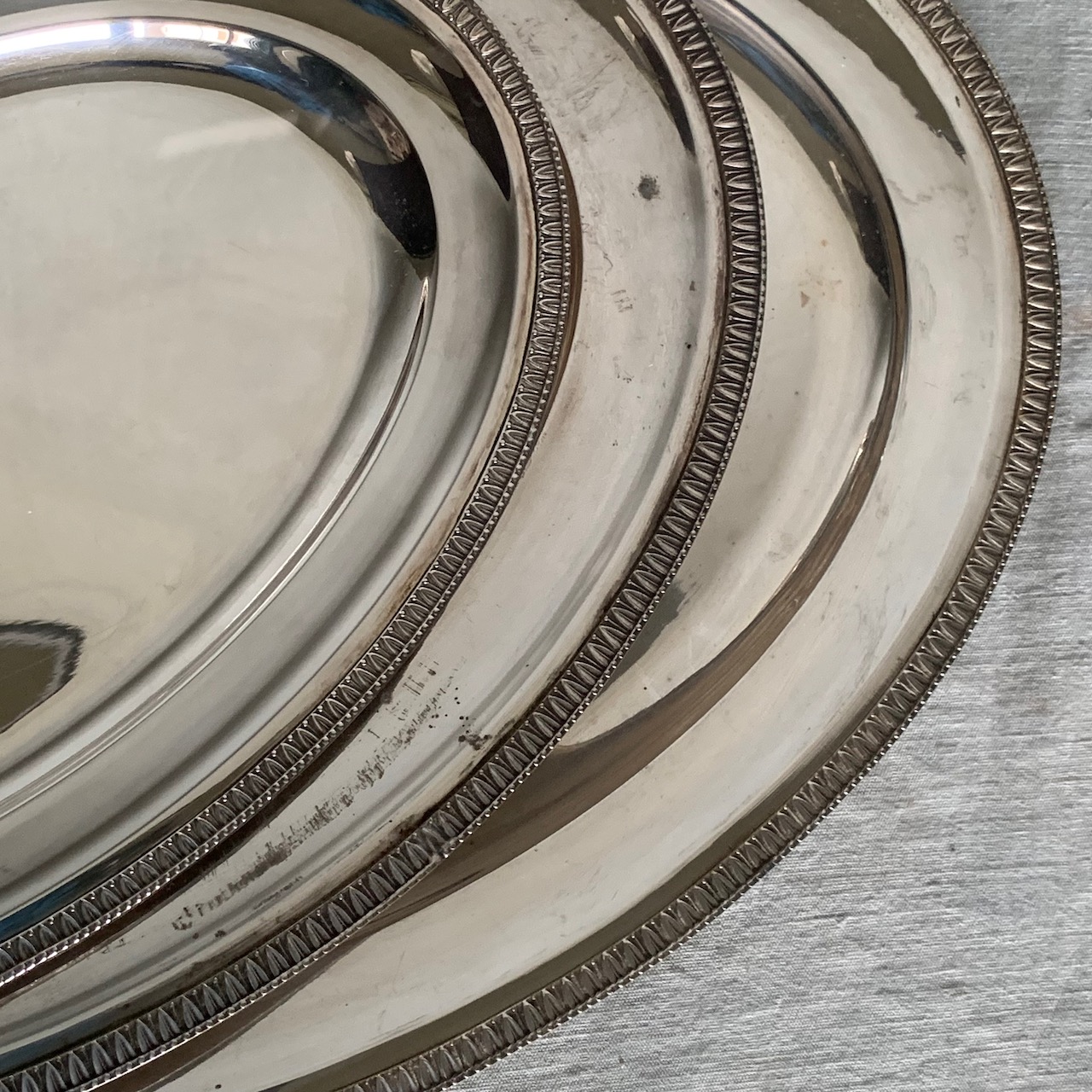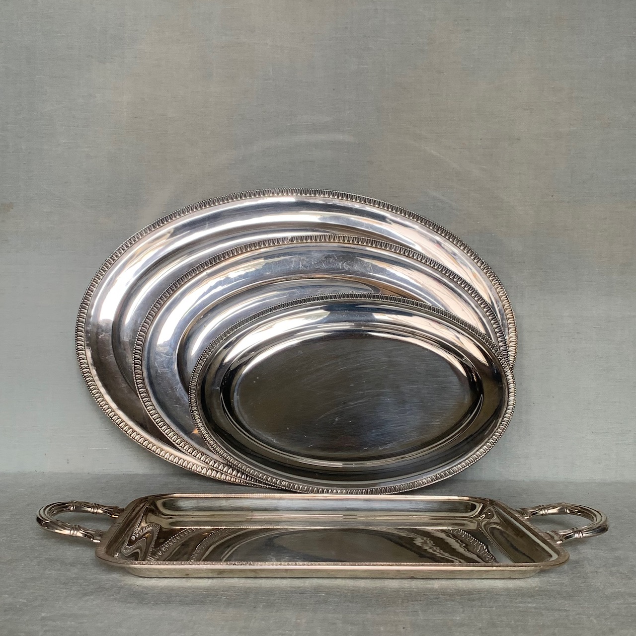 Tre vassoi ovali argento su rame tre misure e una guantiera rettangolare argento, bordo cesellato a palmette. Italia, sec. XIX