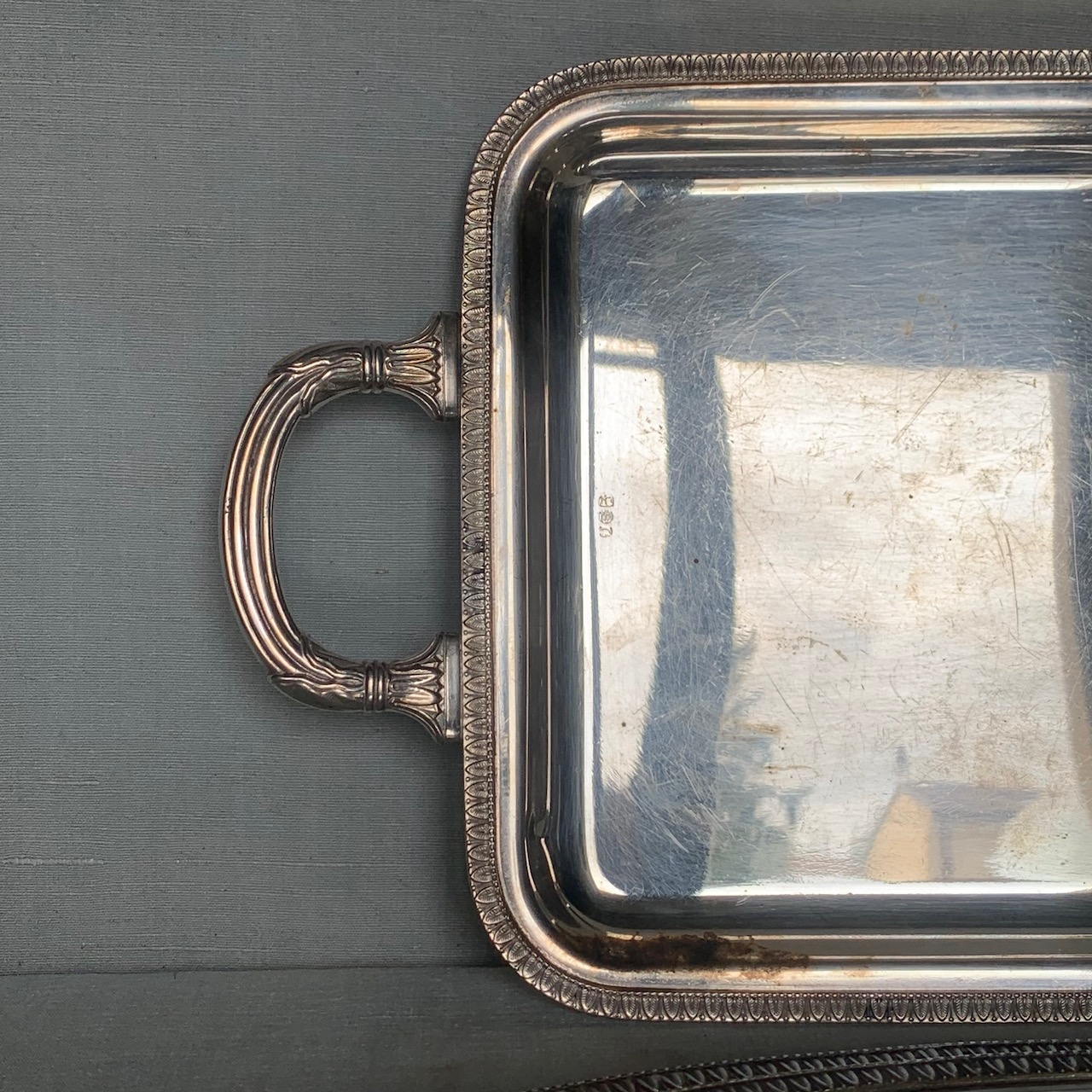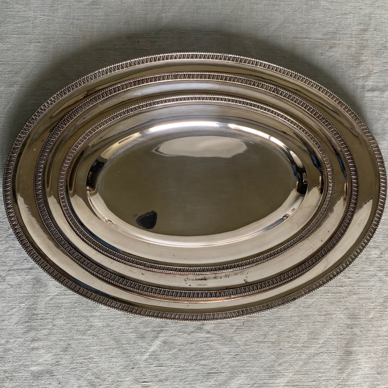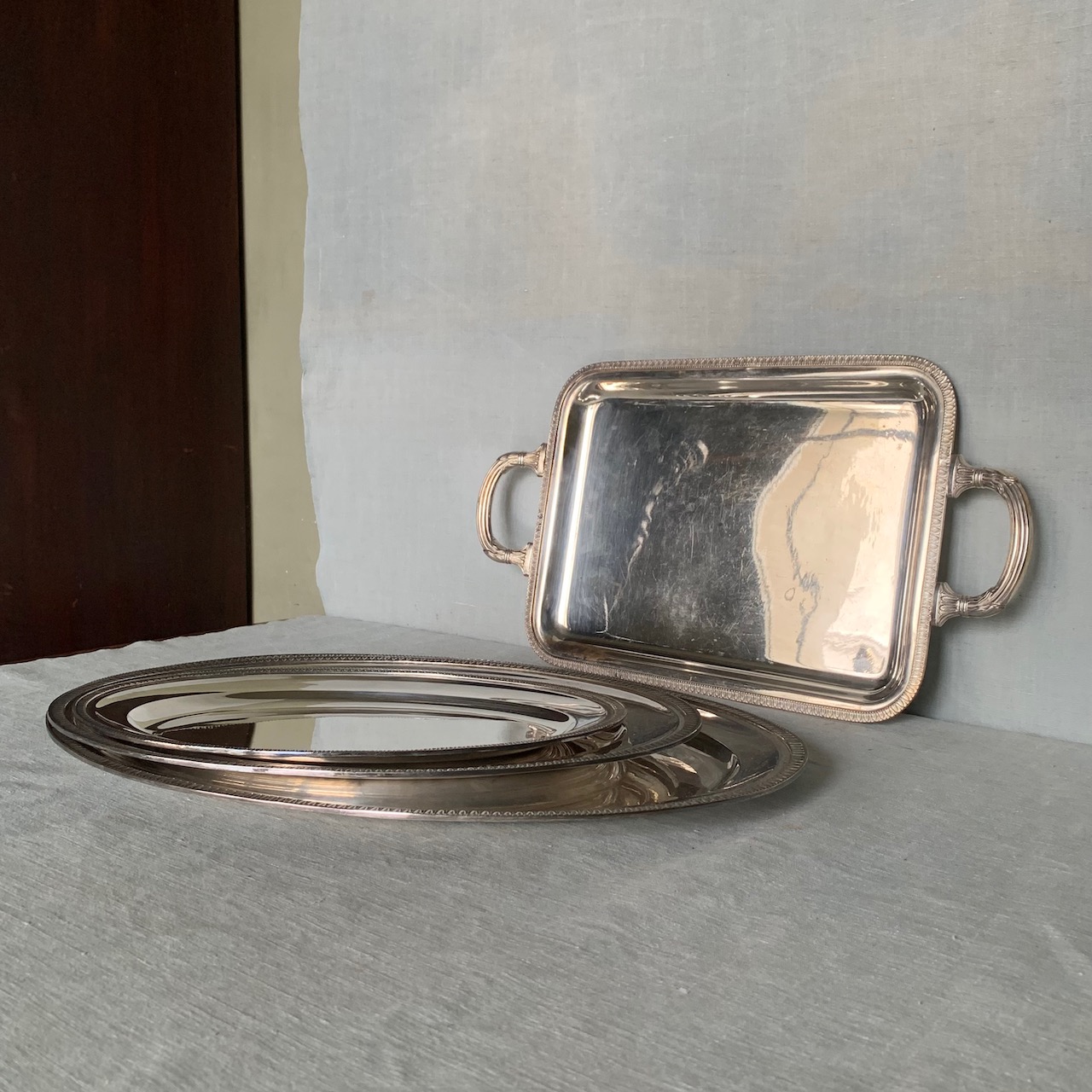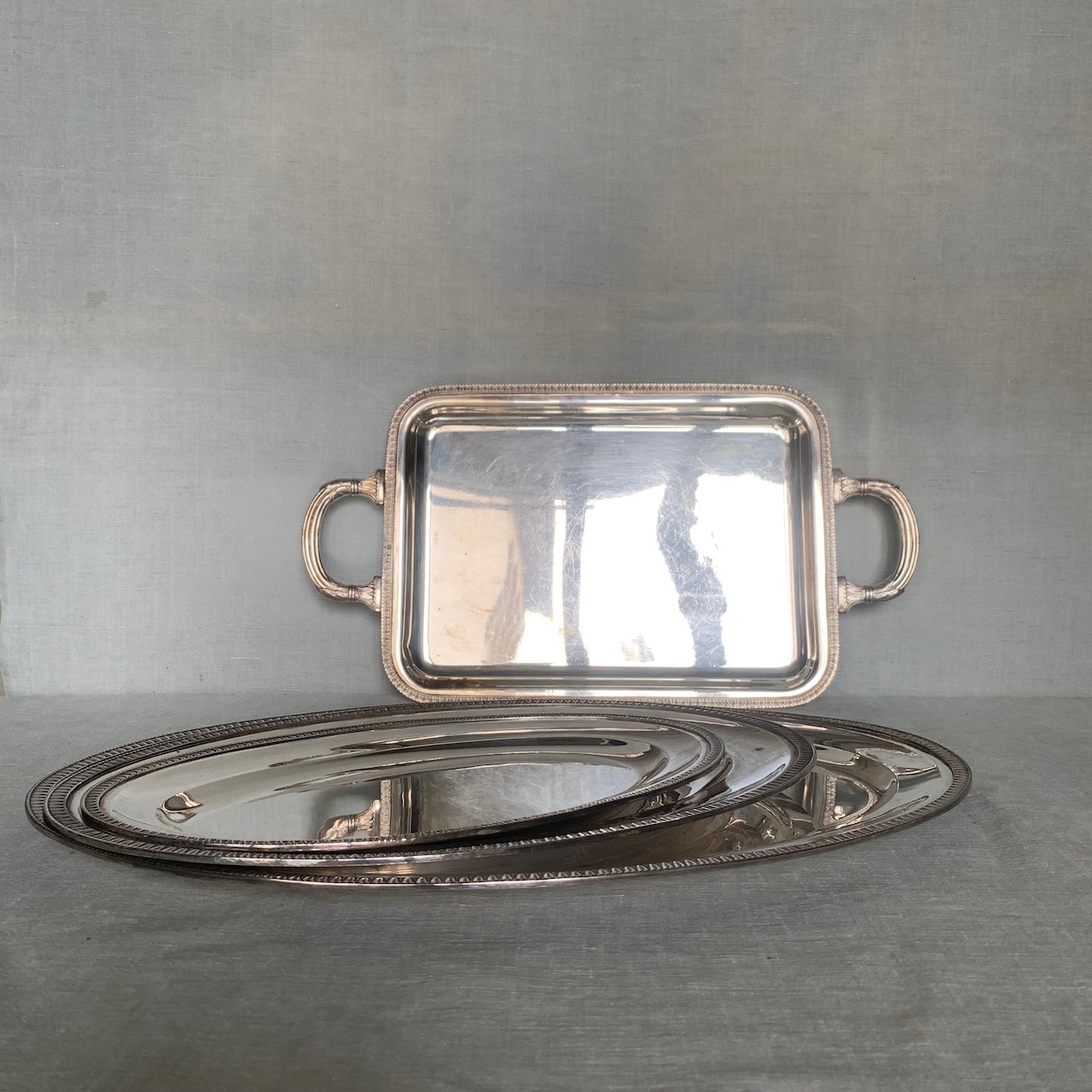 Tre vassoi ovali argento su rame tre misure e una guantiera rettangolare argento, bordo cesellato a palmette. Italia, sec. XIX