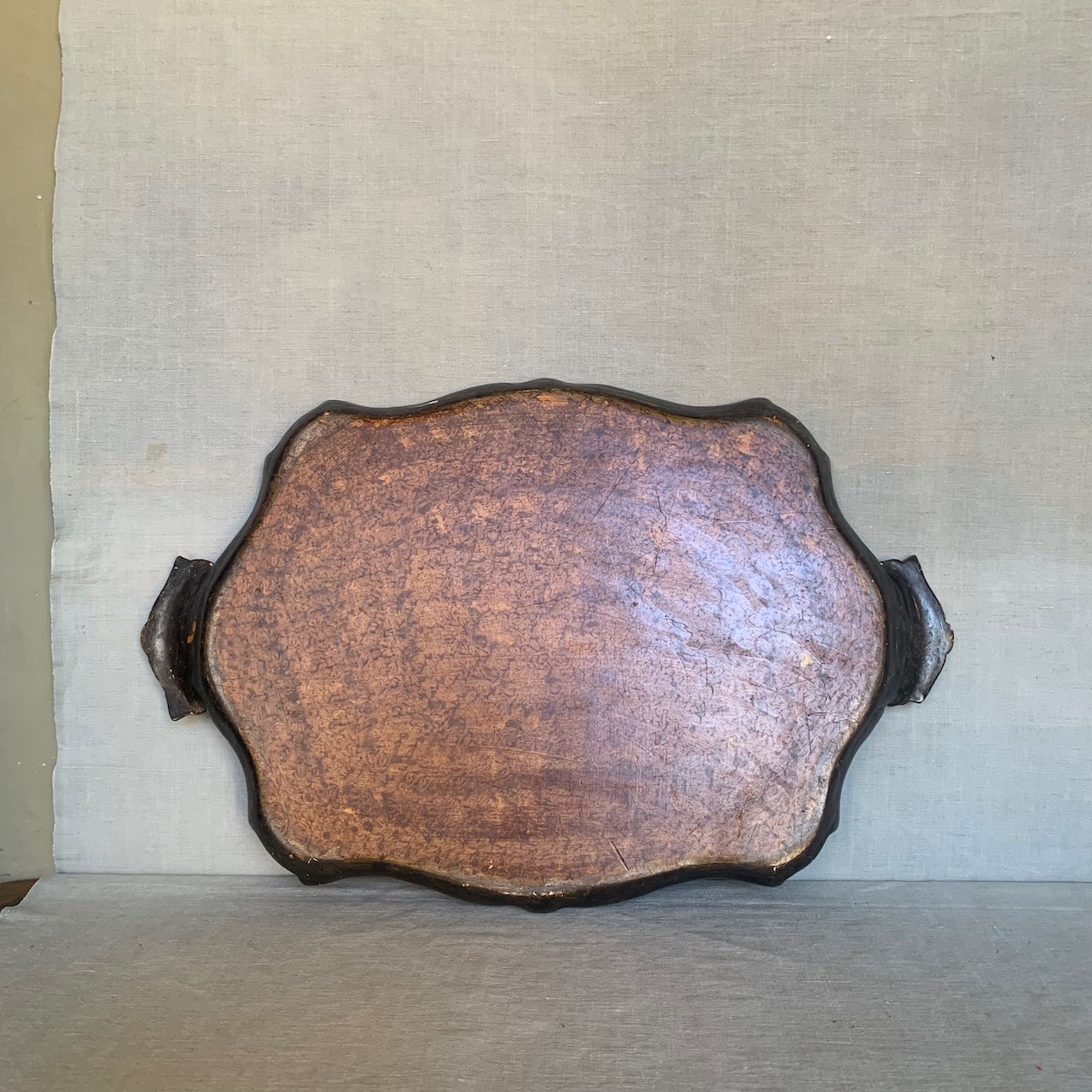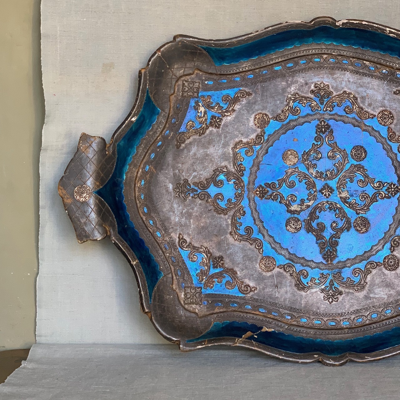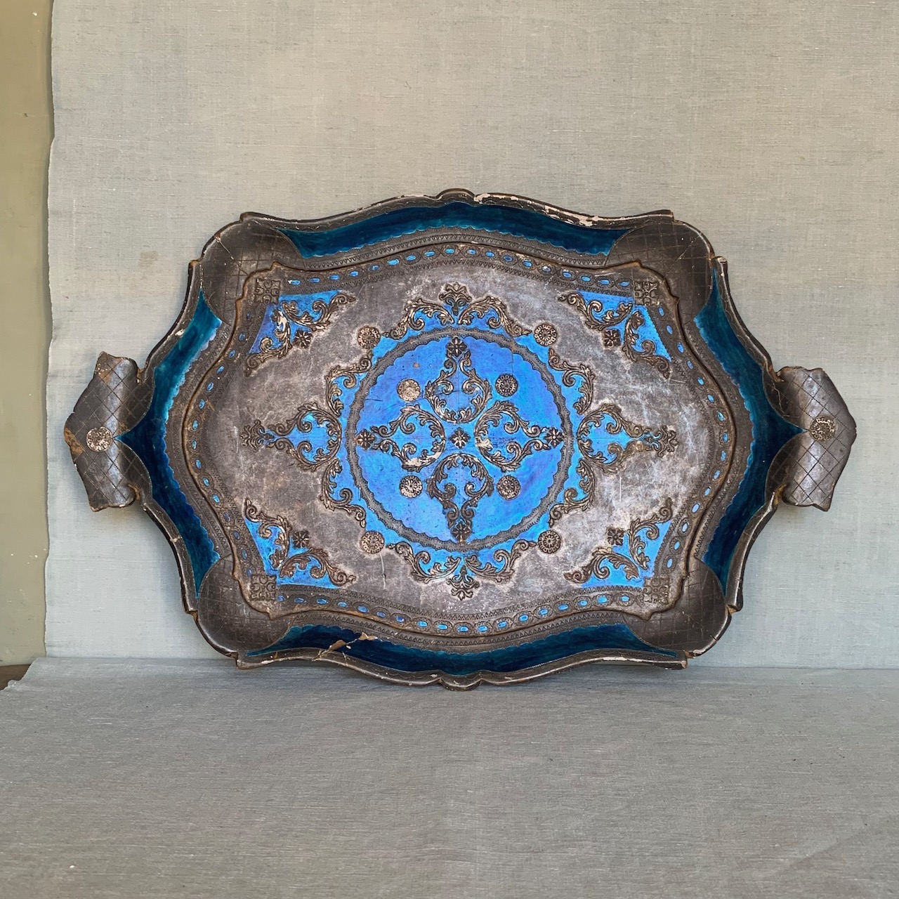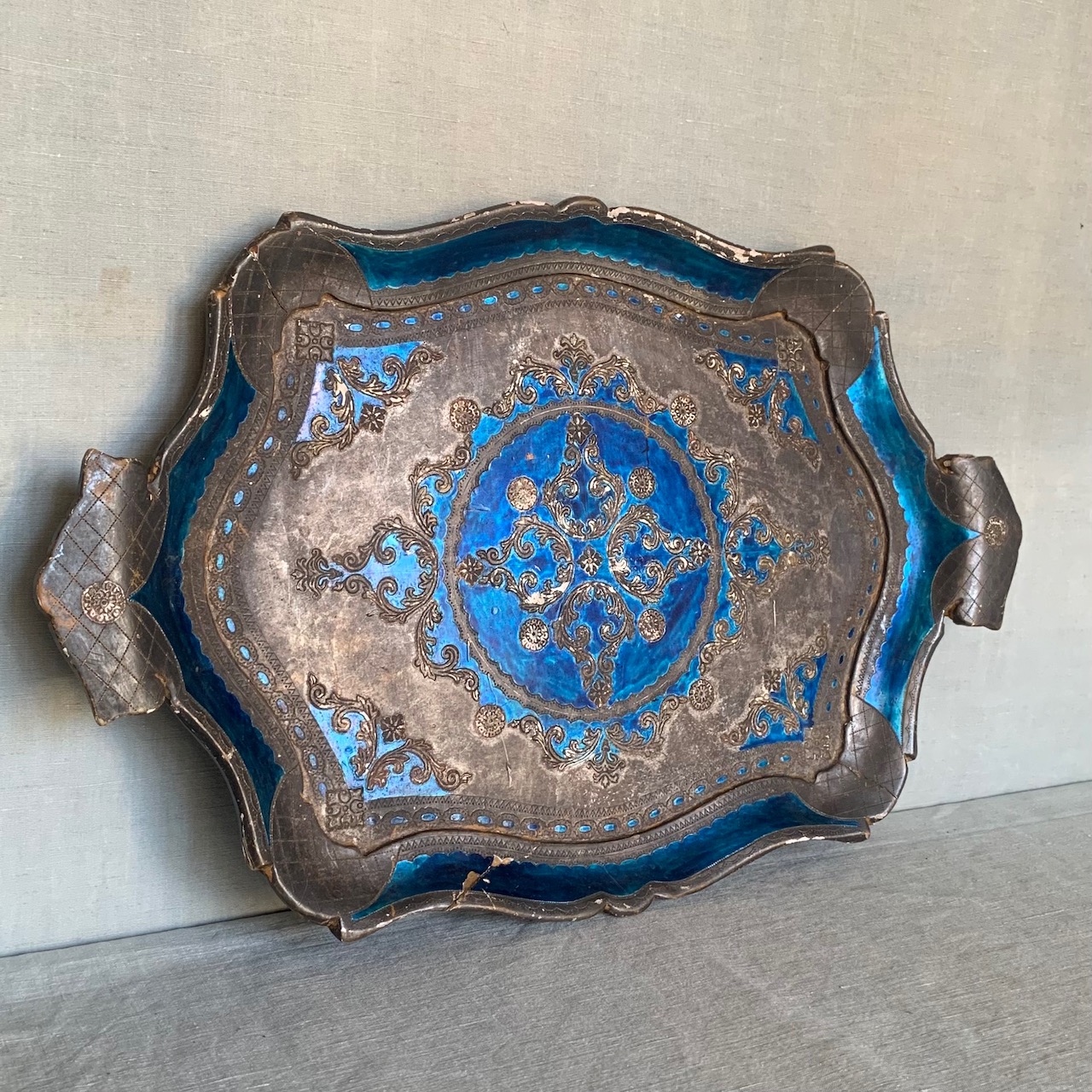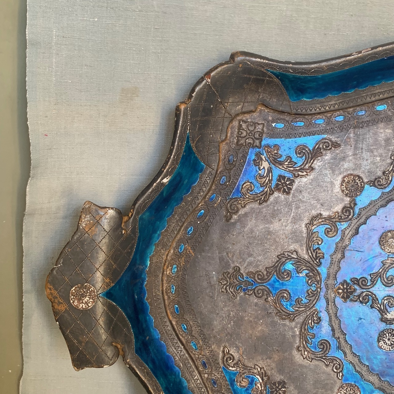 Vassoio fiorentino in legno sagomato, intarsiato con finitura a foglia argento dipinta blu cobalto. Italia, sec. XIX