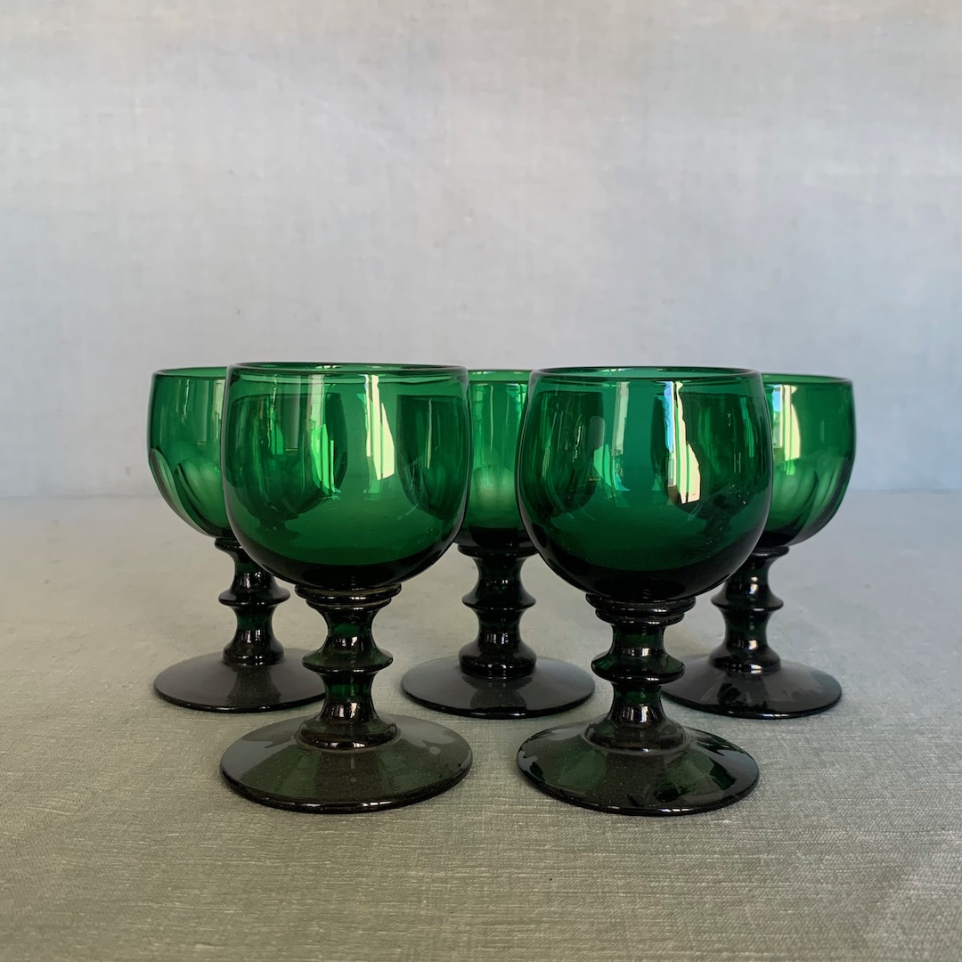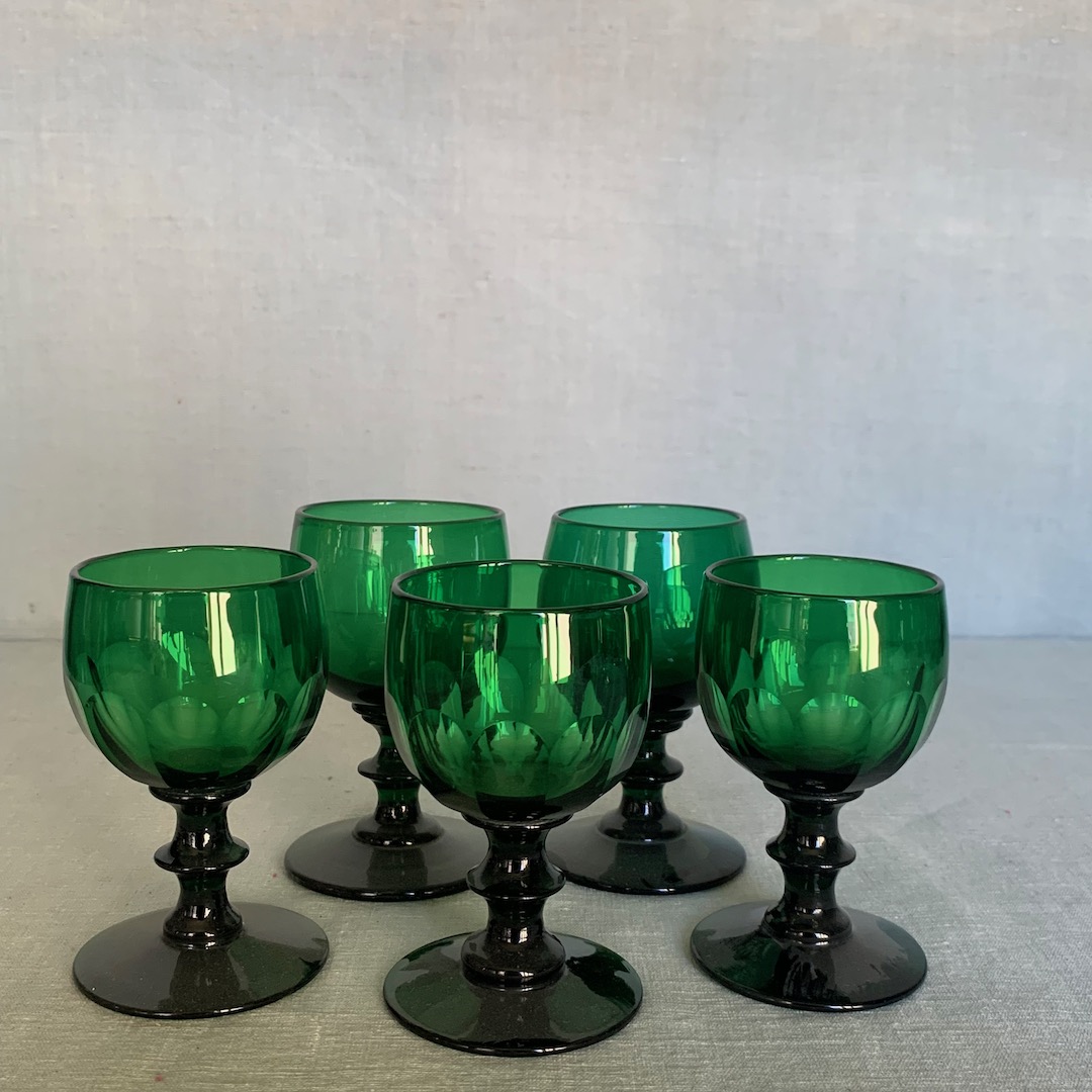 Cinque calici in vetro verde Empoli, con base a pettinatura. Empoli, sec. XX