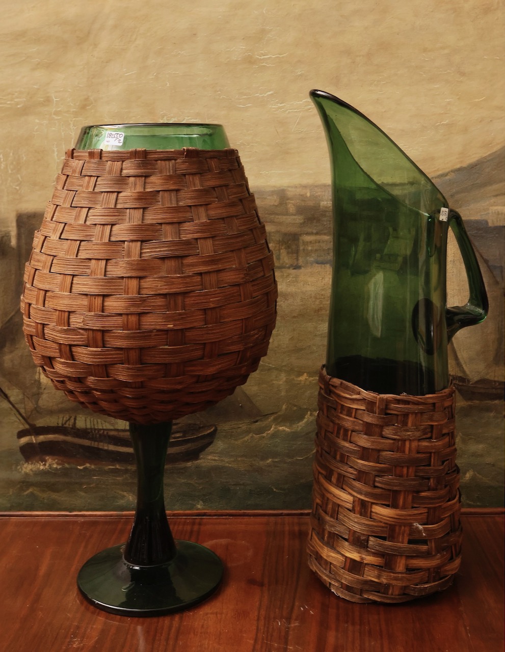 Due vasi verde Empoli rivestiti in paglia intrecciata. Italia, sec. XX