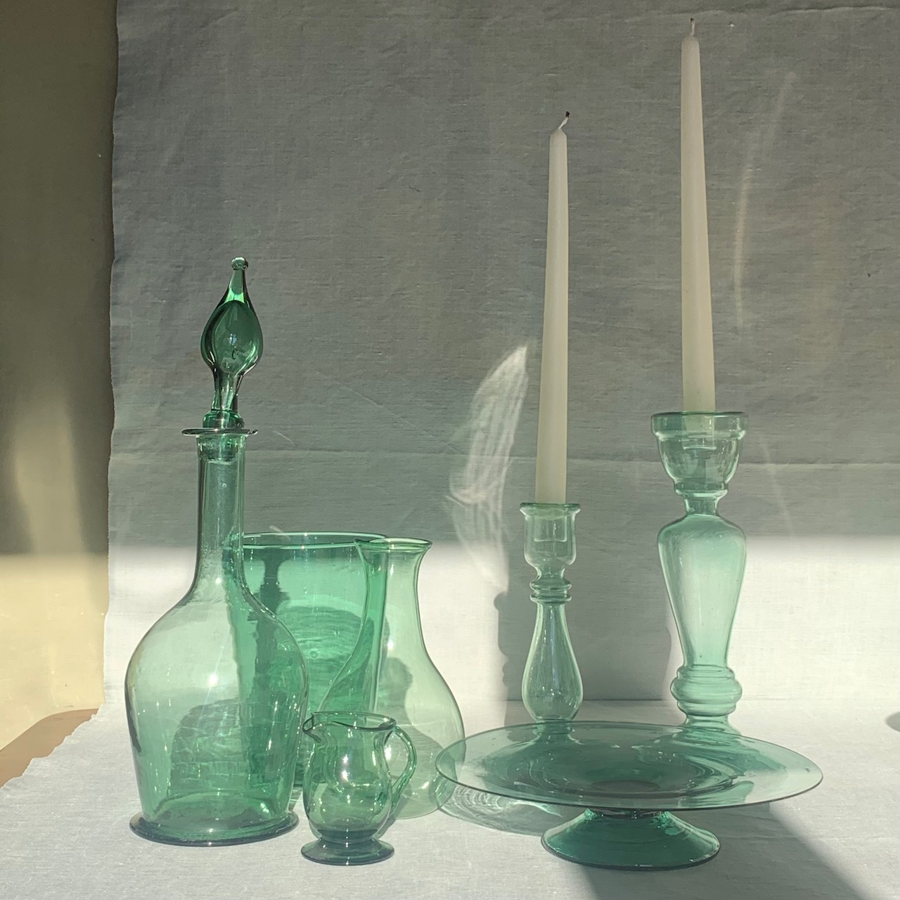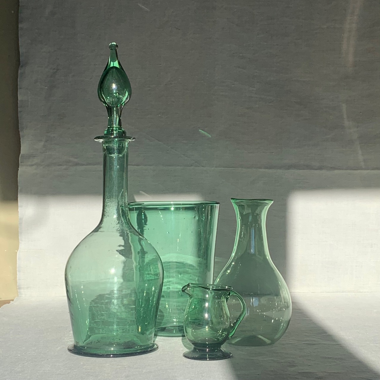 Allestimento vetri verde Empoli, soffiati a mano. Italia, sec. XX