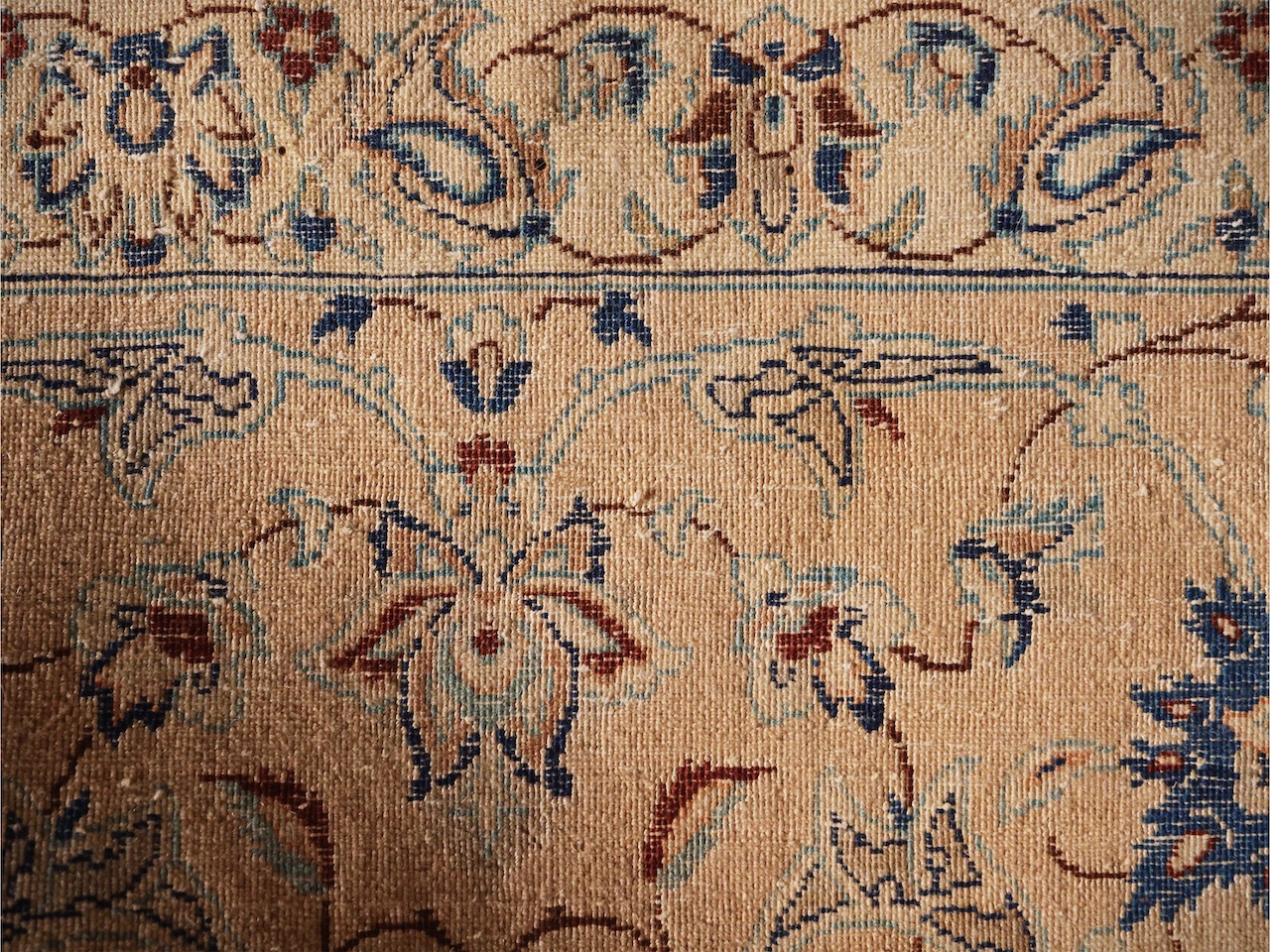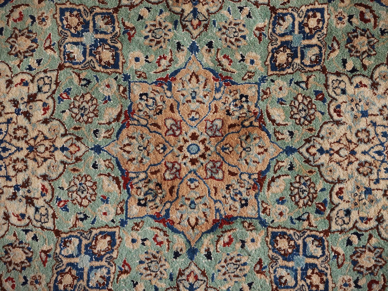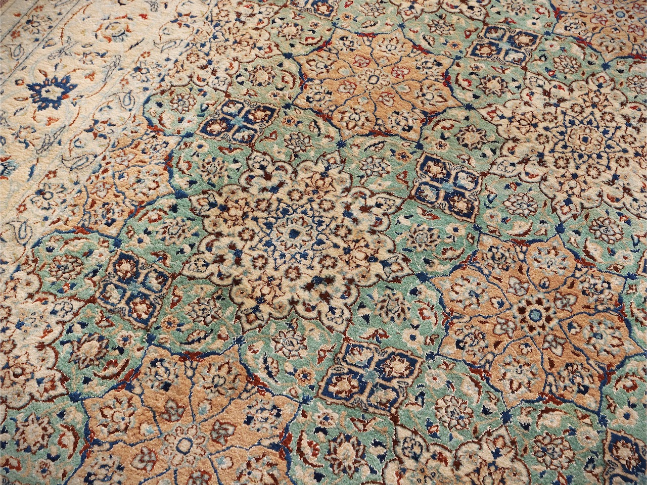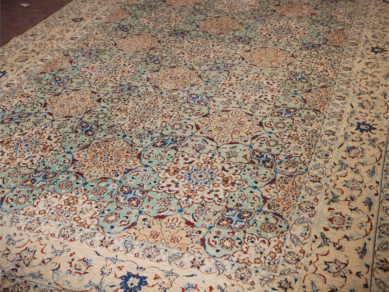 Grande tappeto persiano Nain, campo a medaglioni con motivi floreali celeste e avorio, alta cornice a fascia. Iran, sec. XX